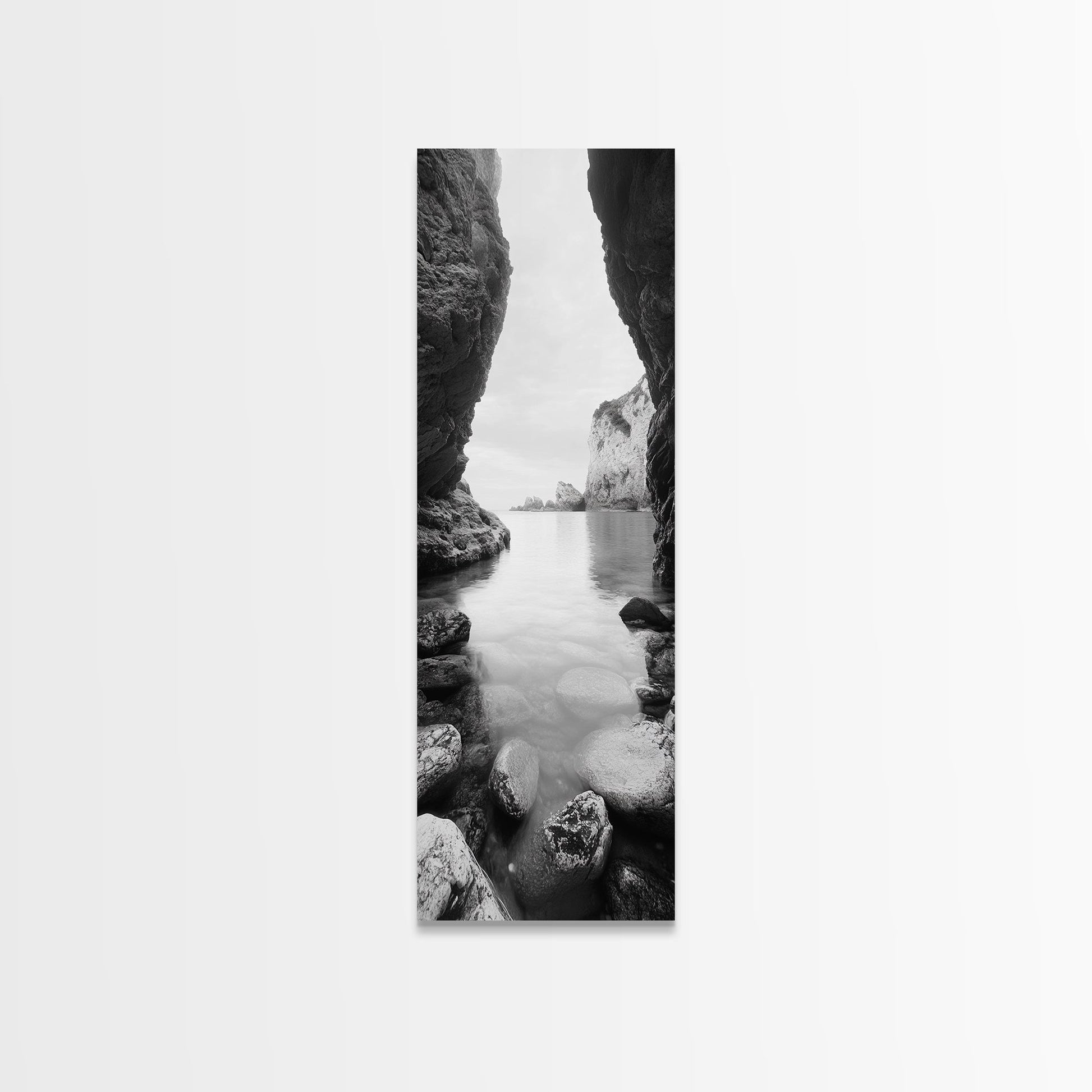 Cliff View, Hidden Bay, Ocean Serenity, Rock Formations, Canvas Print, Black and White Coastal Landscape, Entryway Art, Dining Wall Art