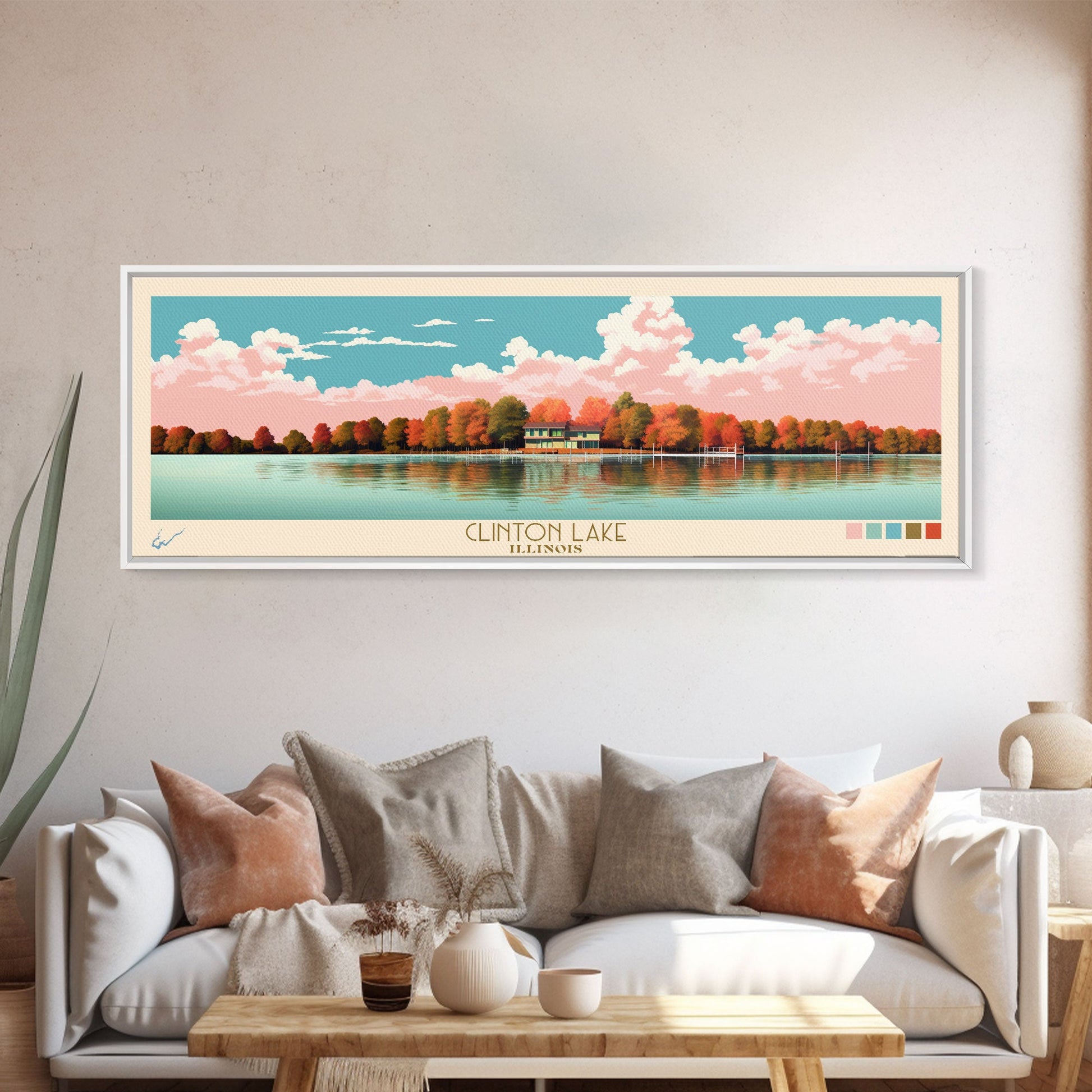 Clinton Lake Illinois Framed Canvas Print, Midcentury Modern Panoramic Wall Art, Living Room Decor, Pop Art, Travel Poster Art, Scenic Nature Painting, Lake House Decor