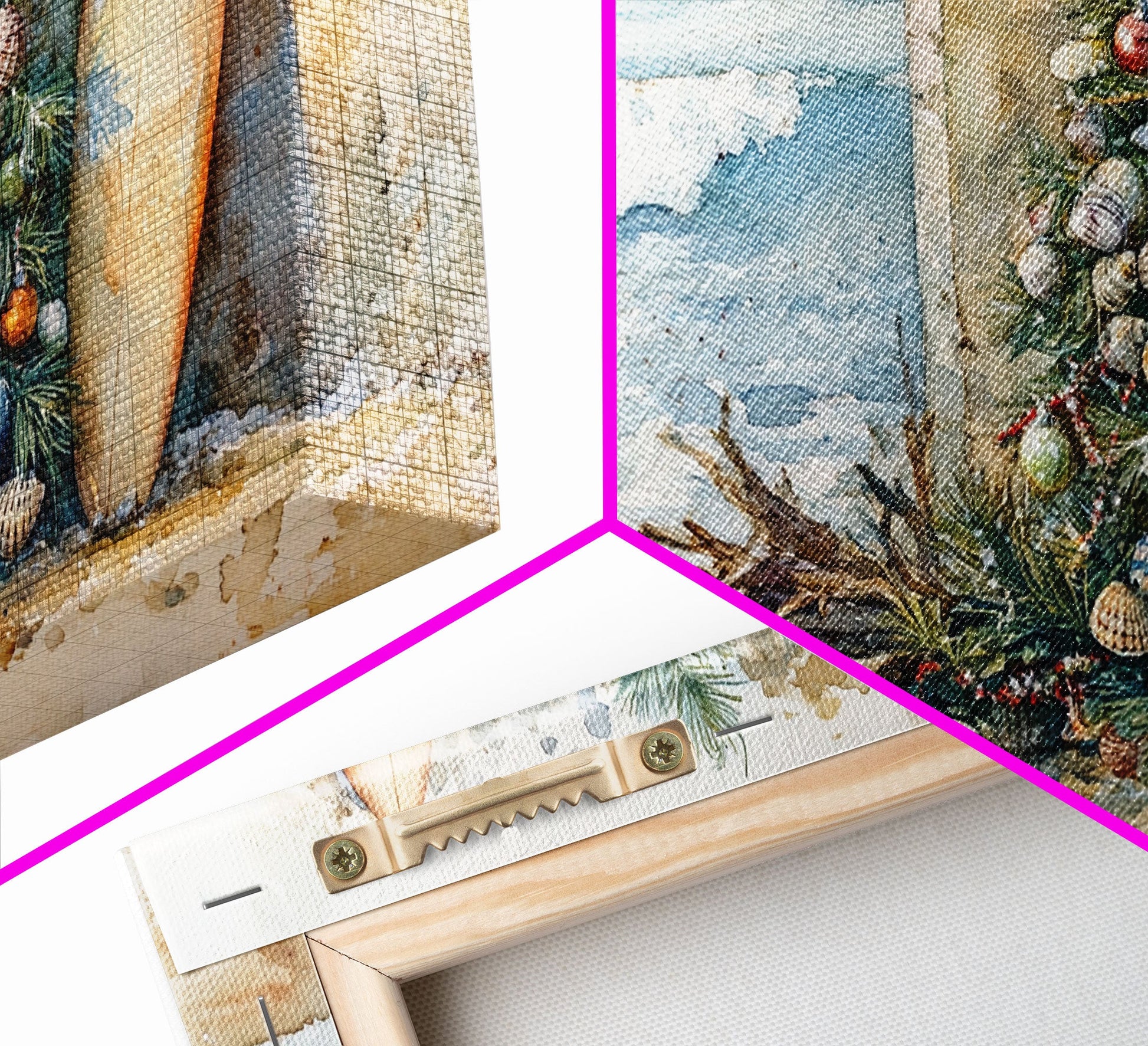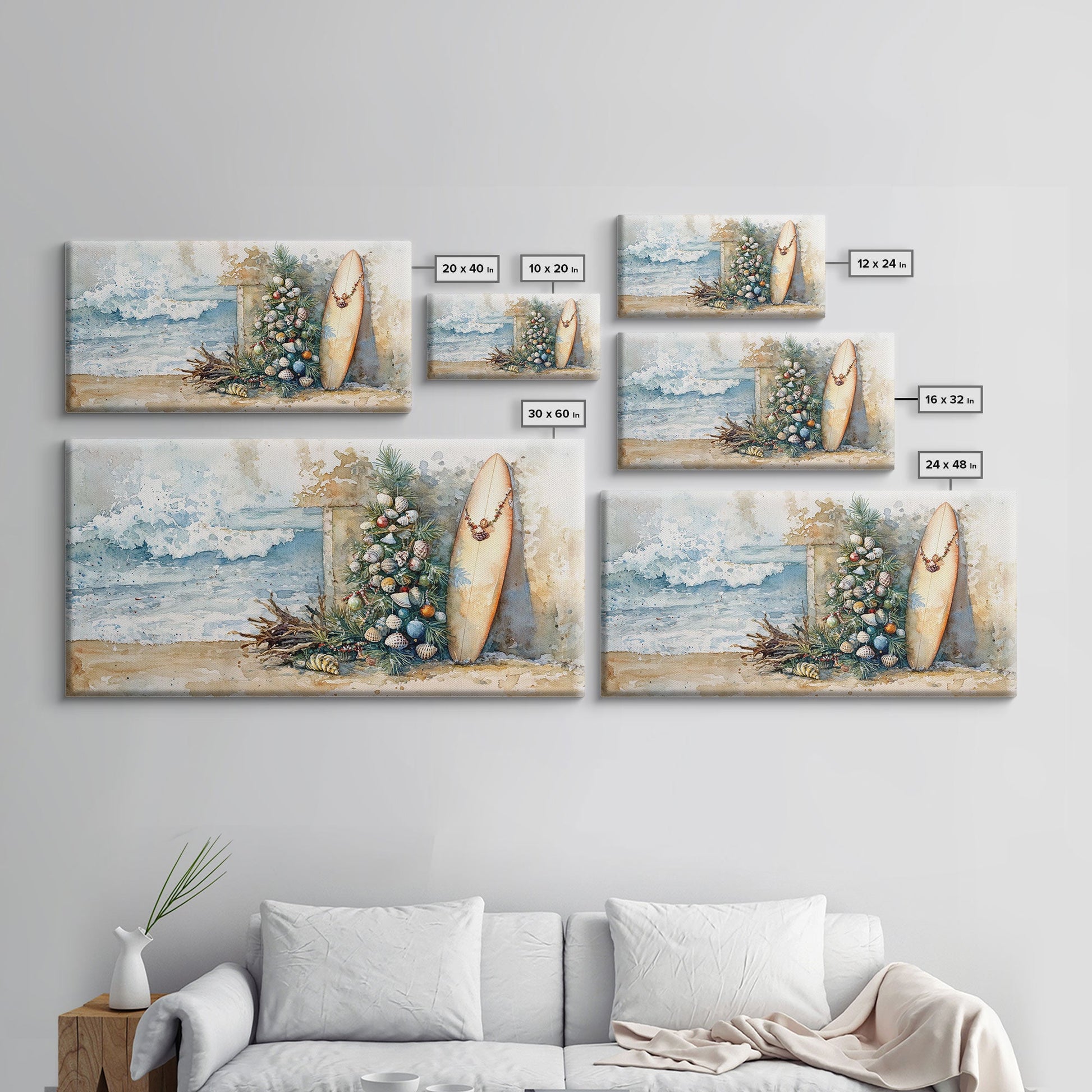 Coastal Christmas Scene Surfboards Christmas Tree Framed Canvas Print, Beach Holiday Decor Wall Art With Surfing Theme