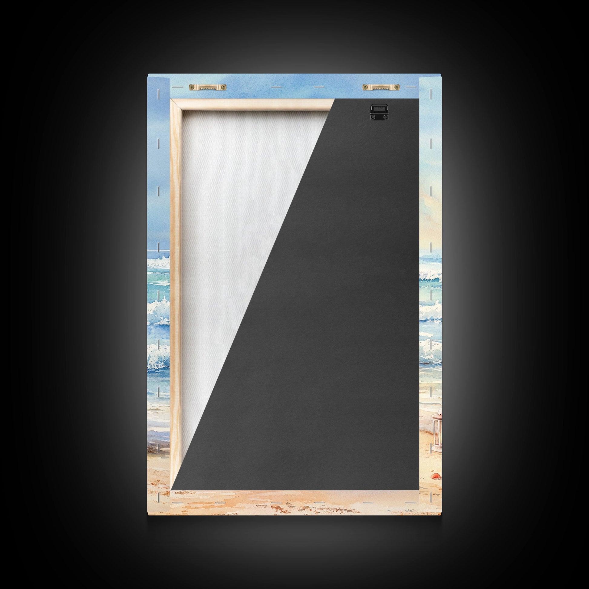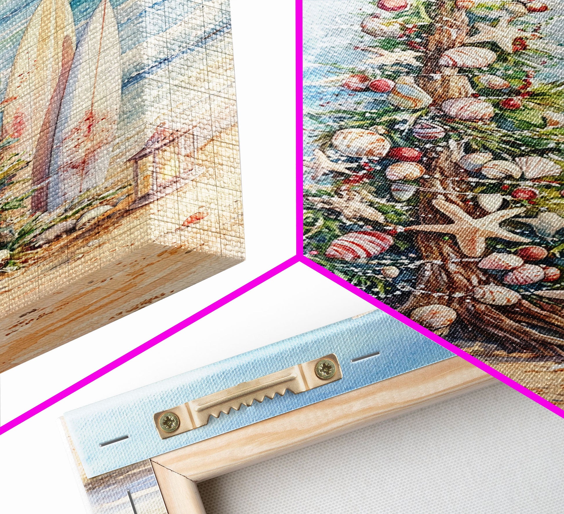 Coastal Christmas tree with surfboards at the beach Framed Canvas Print, tropical holiday wall art beach Christmas decor Christmas prints