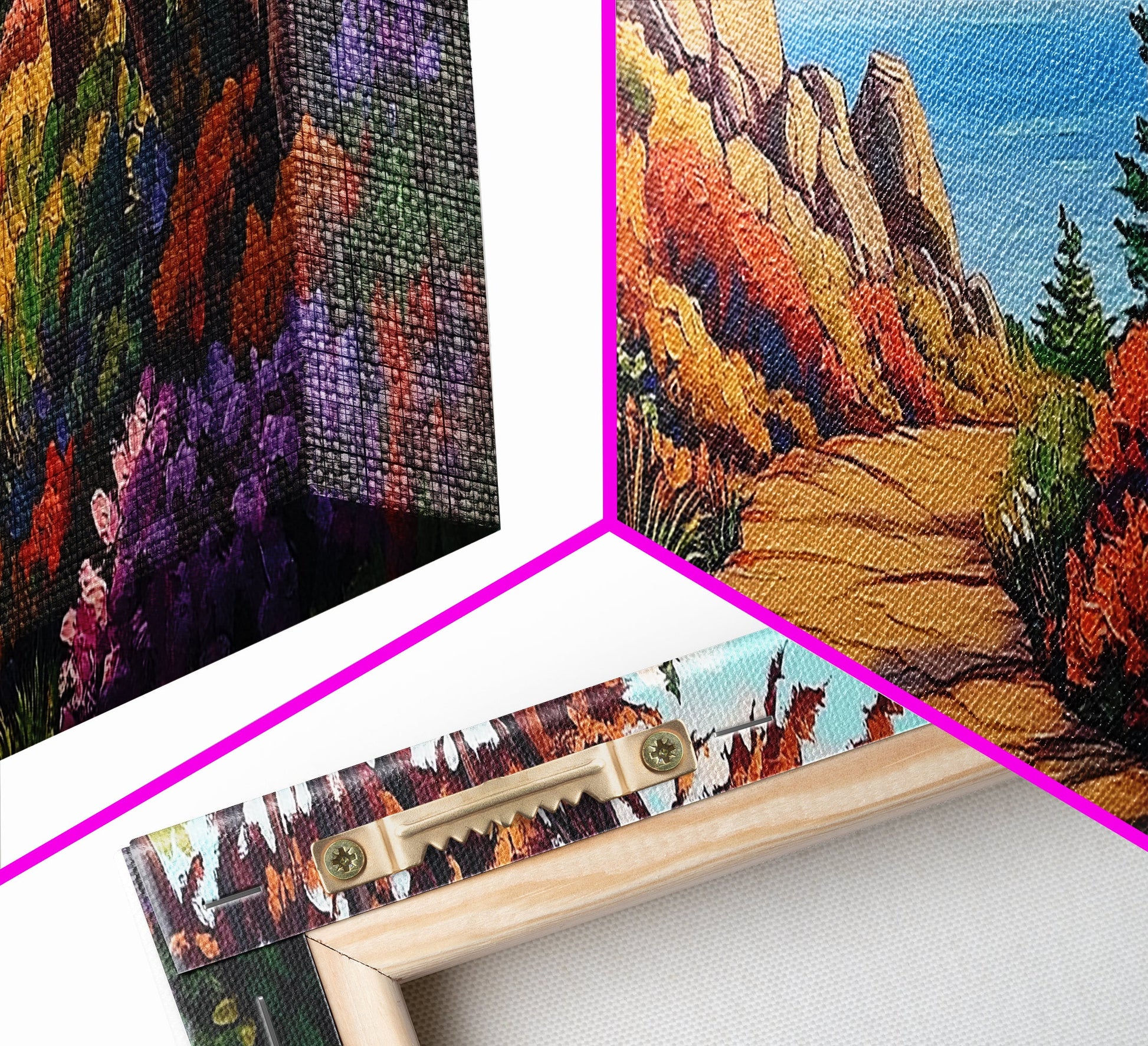 Coastal Forest Walk, Vibrant Landscape Painting, Ocean View Trail, Autumn Decor, Framed Canvas Print, Hallway Wall Art