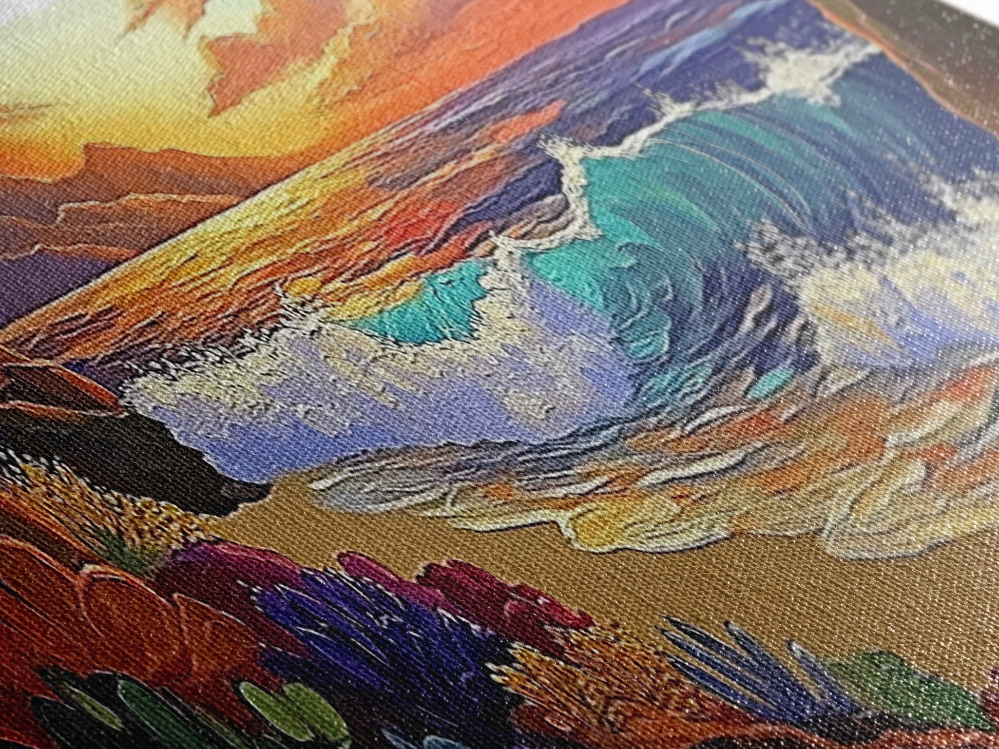 Most of our canvases are made in the USA, with the exception of canvases ordered with the light oak unstained frames, and any large canvases (24x48, 30x60, 16x48 and 20x60) ordered WITH a frame. These are temporarily made in and shipped from Europe, while we try to find a more consistent supplier in the USA.