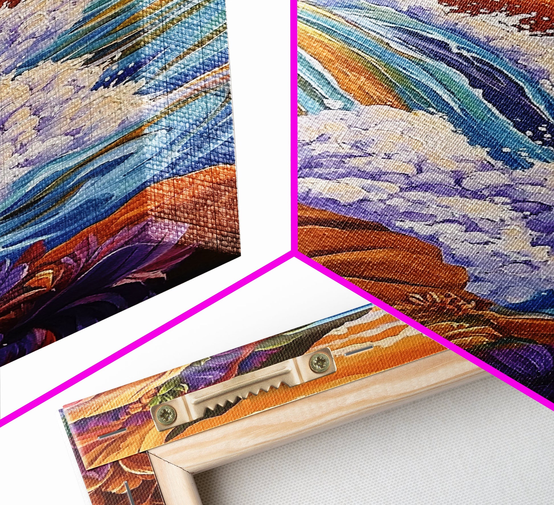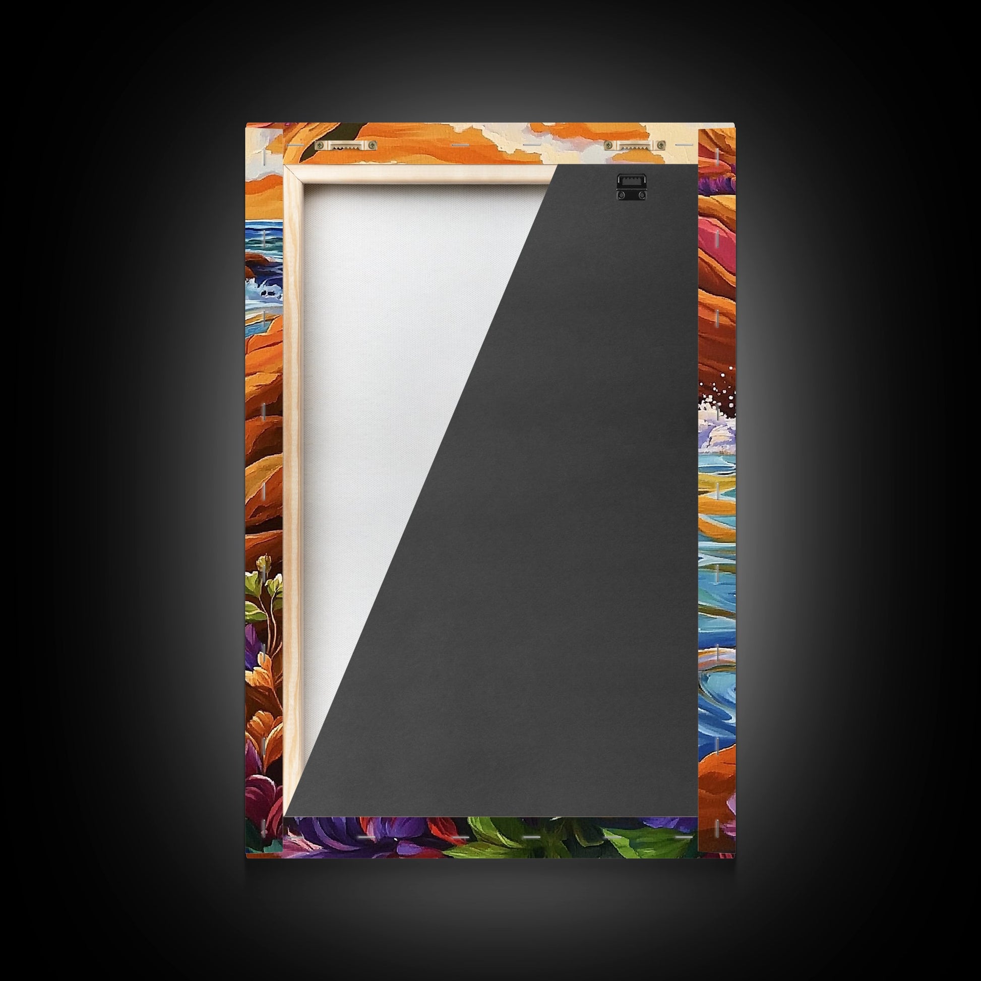 Coastal Waterfall, Ocean Rocks, Tropical Seascape, Sunset Art, Framed Canvas Print bathroom decor, beach lovers gift, colorful nature art