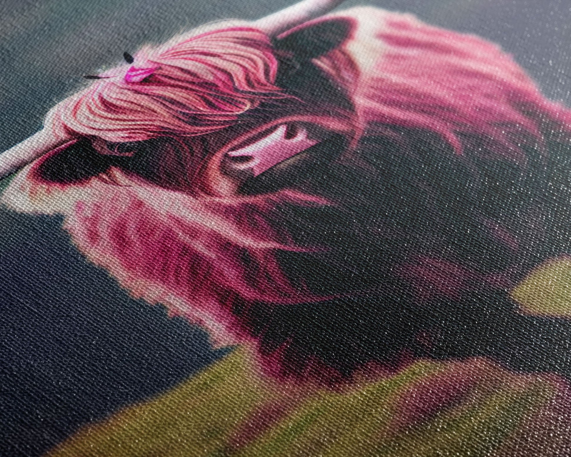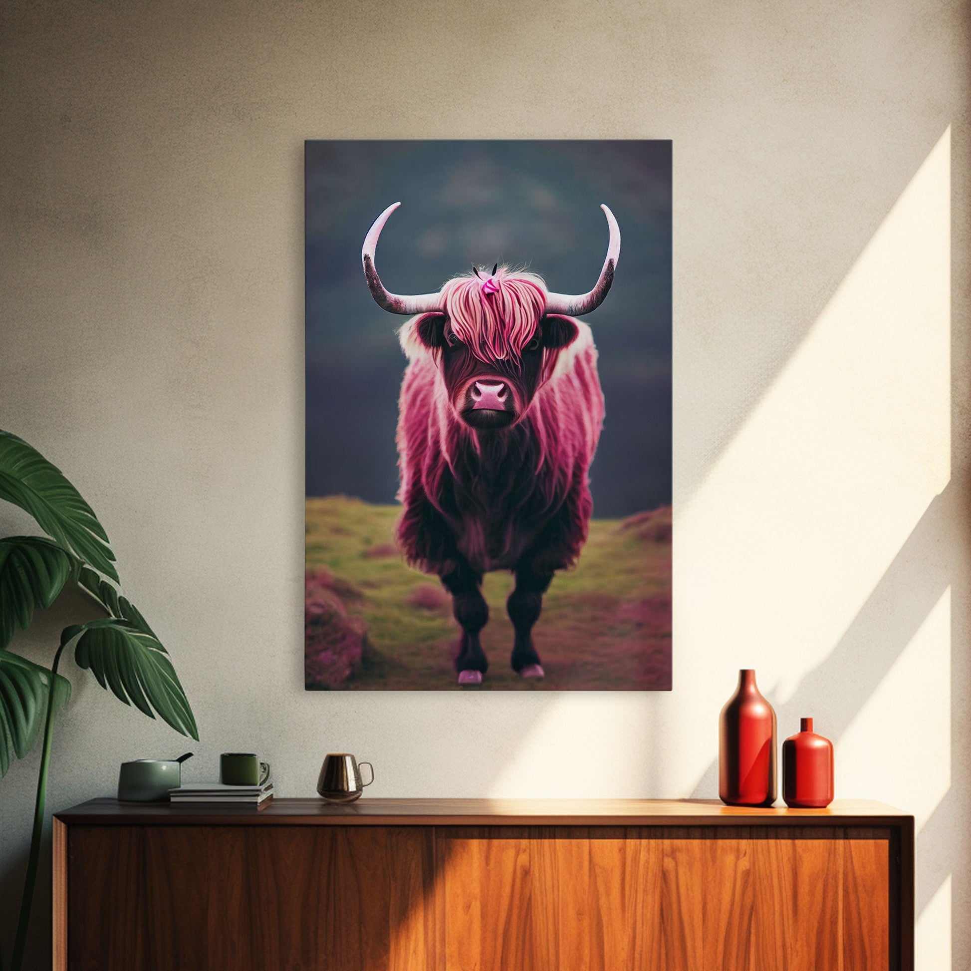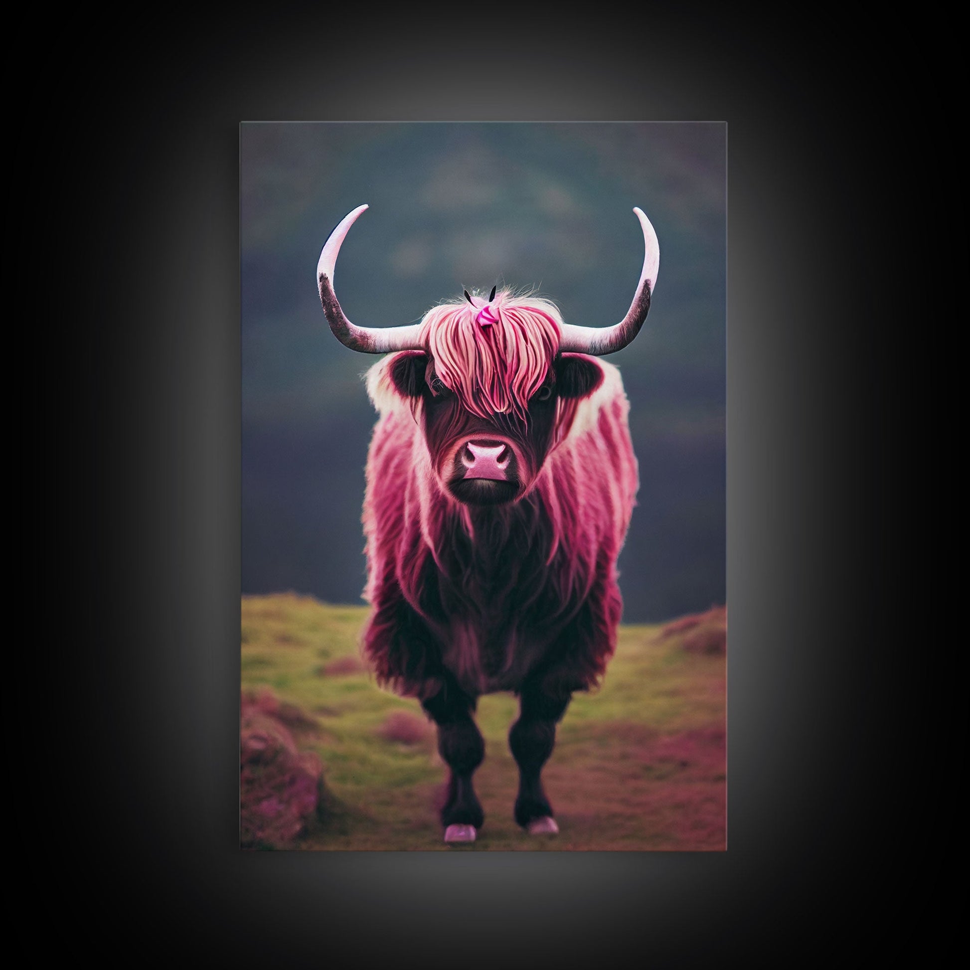 Colorful farmhouse art, Highland cow, Scotland cattle, framed canvas print, pink cow