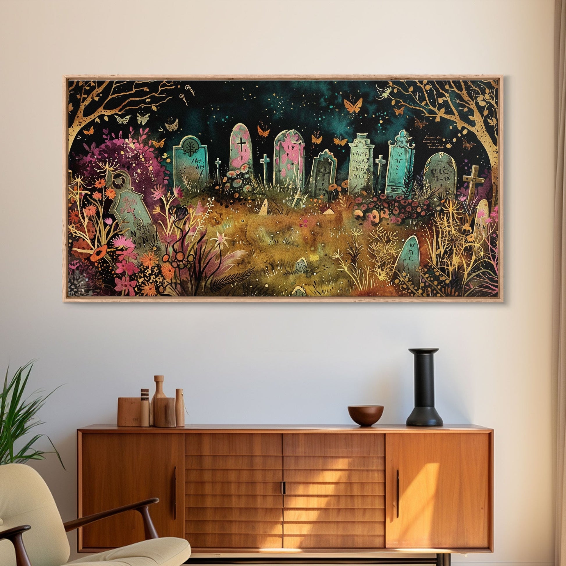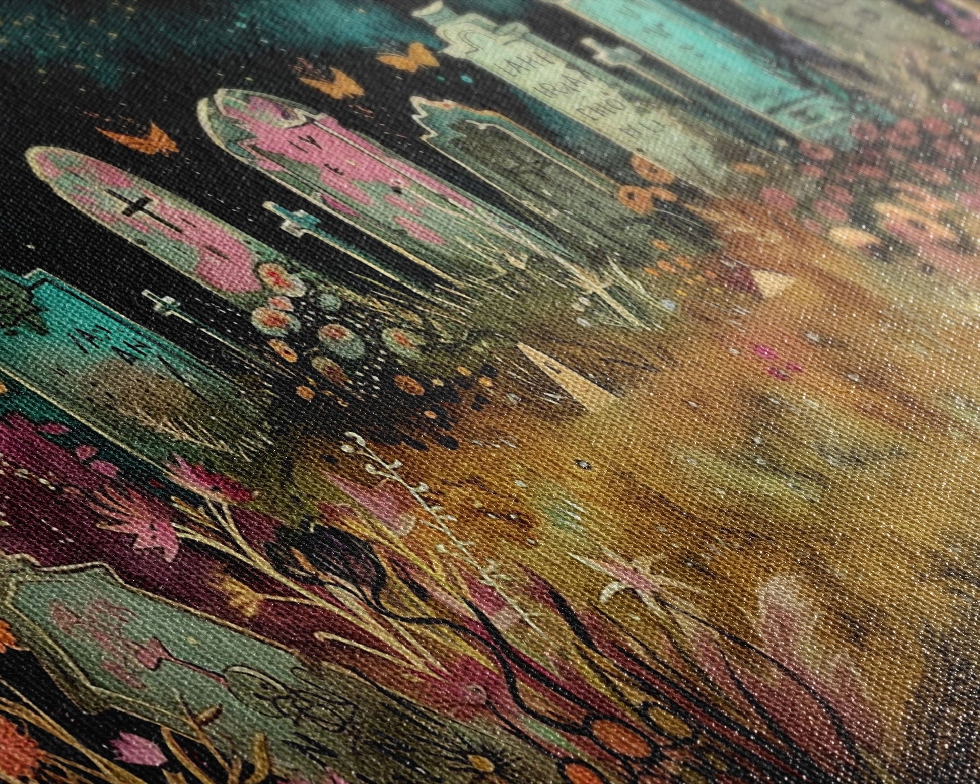 Colorful Haunted Grave Yard In The Spring Time, Framed Canvas Print, Spooky Wall Art, Halloween Spooky Season Decor
