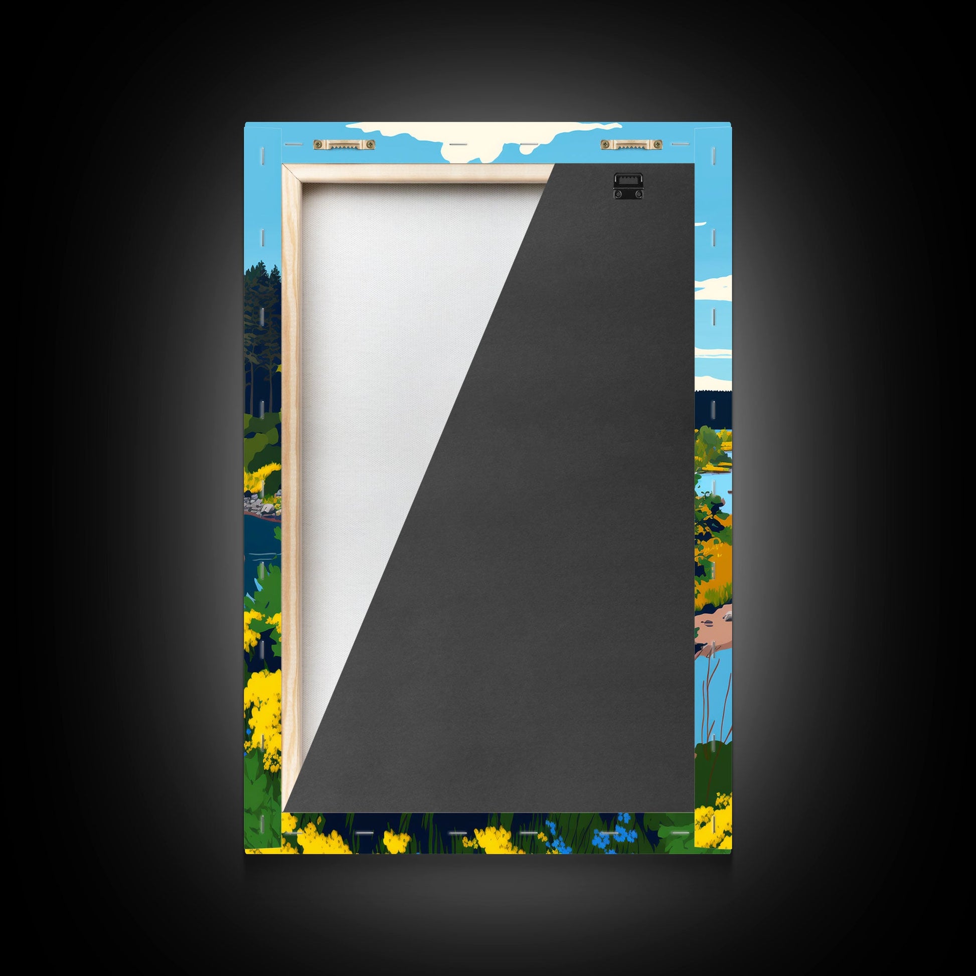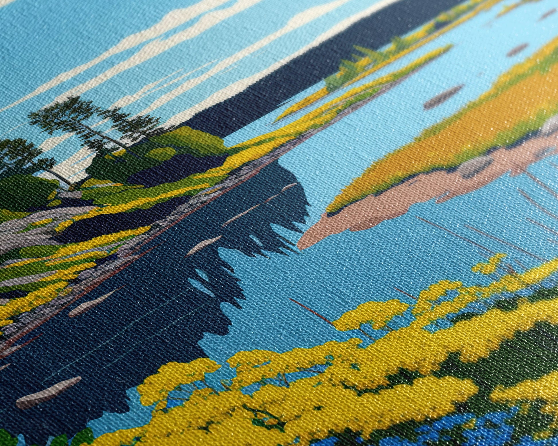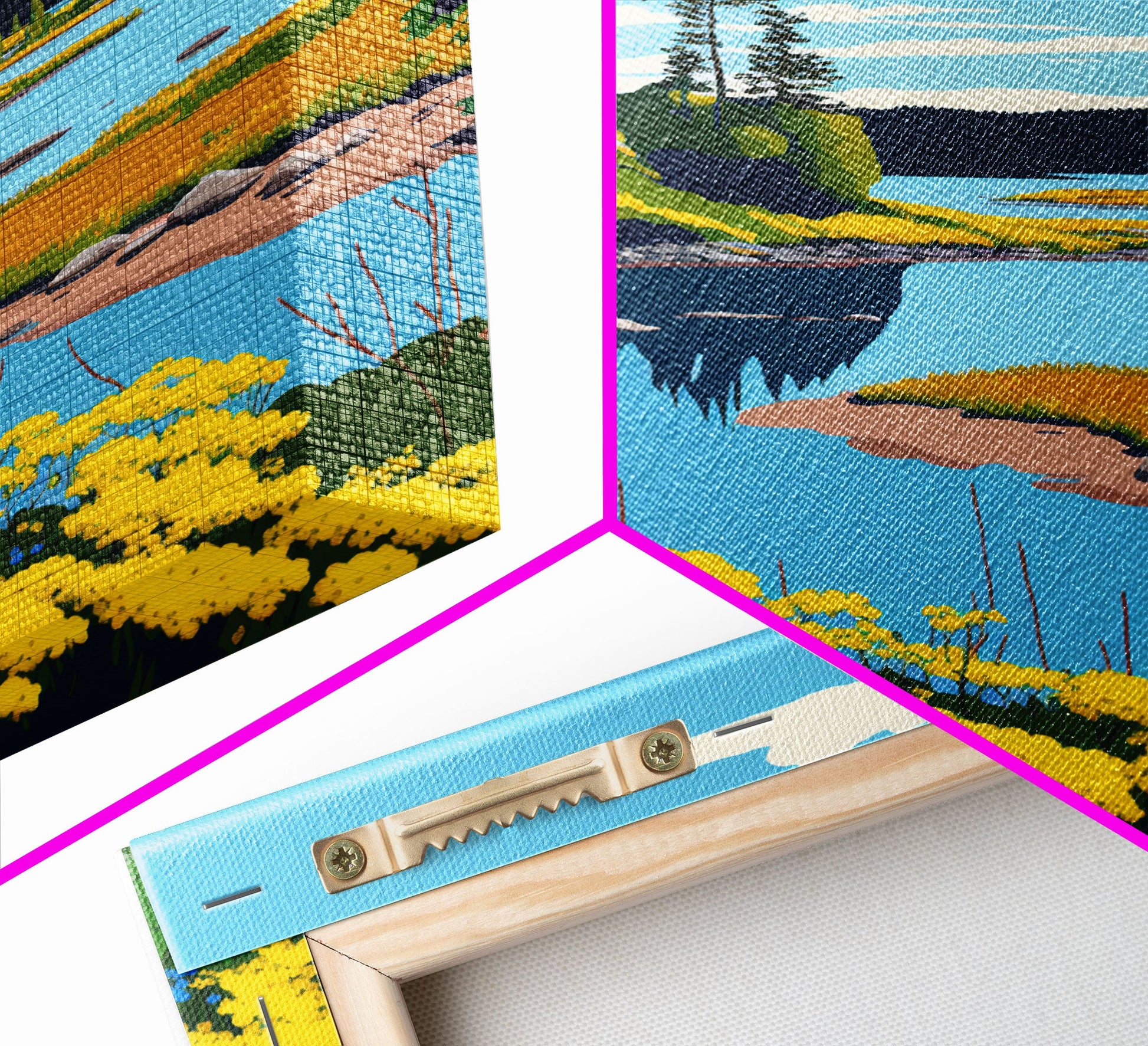 Colorful Pop Art Picture of a Stream, Framed Canvas Print, Surrealist High Contrast Cel Shaded Landscape Art