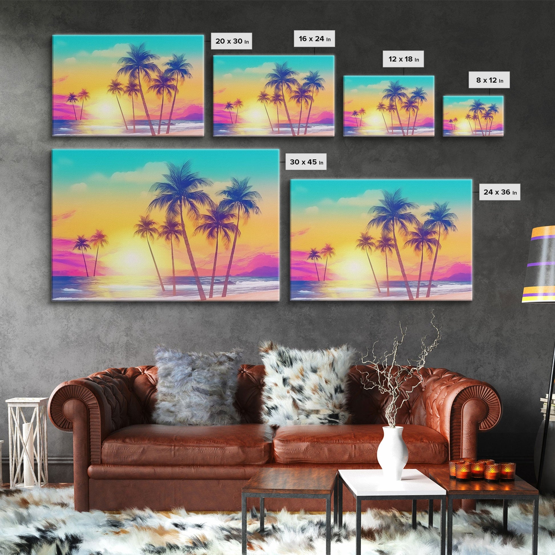 Colorful sunset Wall art, Framed Canvas Print, Synthwave Style, Guest room art, Pop Art Style, Watercolors, Beautiful art, Tropical Art