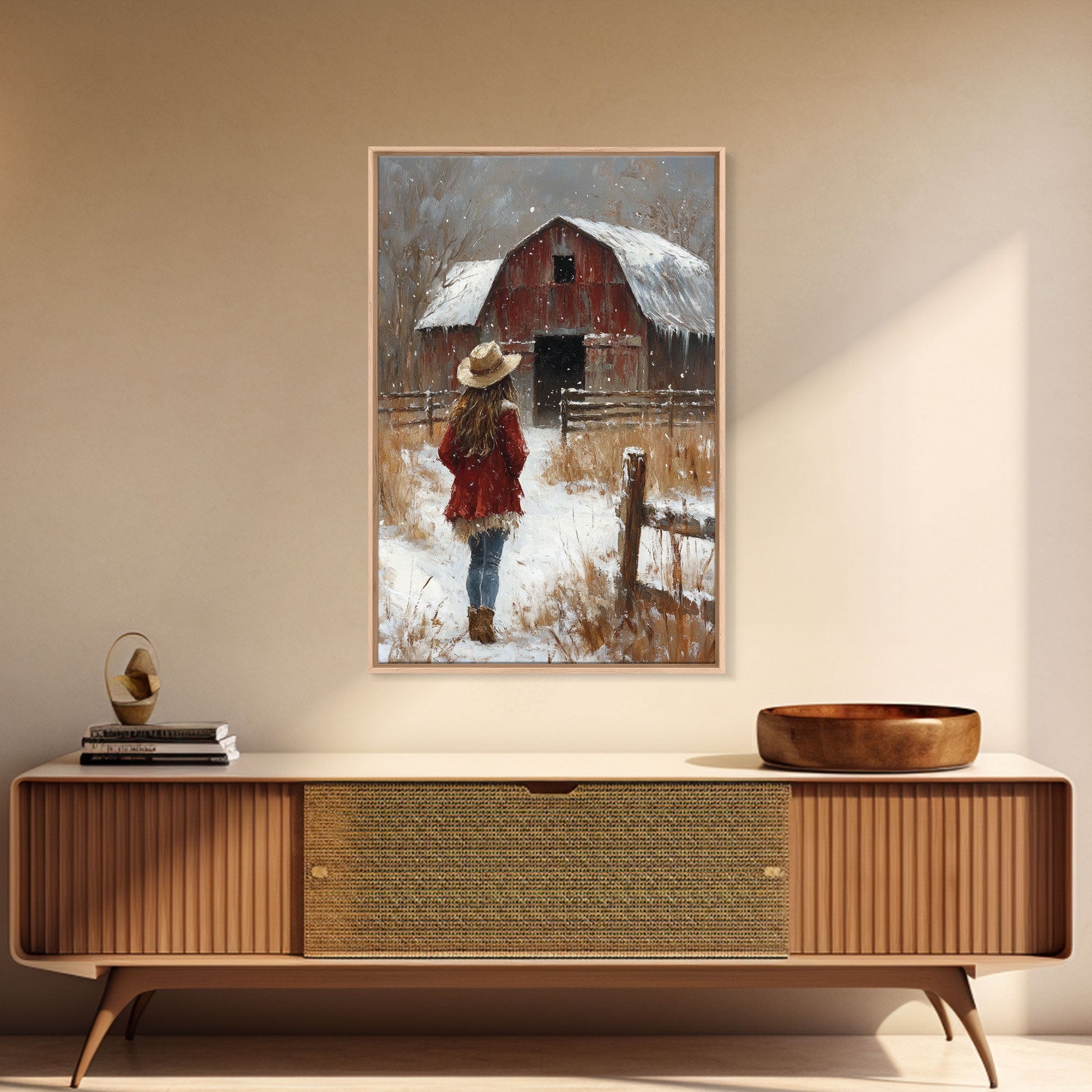 Country Girl with Falling Leaves Canvas Print, Autumn Wall Art, Farmhouse Holiday Decor, Fall Decor, Trendy Wall Art, Framed Canvas Print
