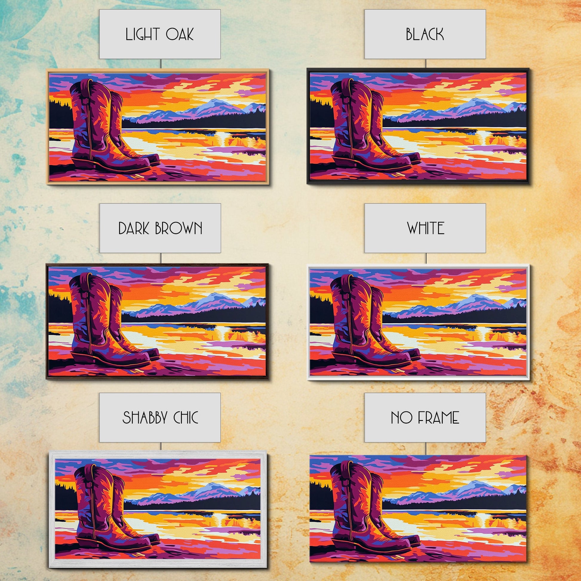 Cowboy boots, lake sunset, mountain painting, rustic western art, farmhouse decor, vibrant colors, extra wide art, canvas print