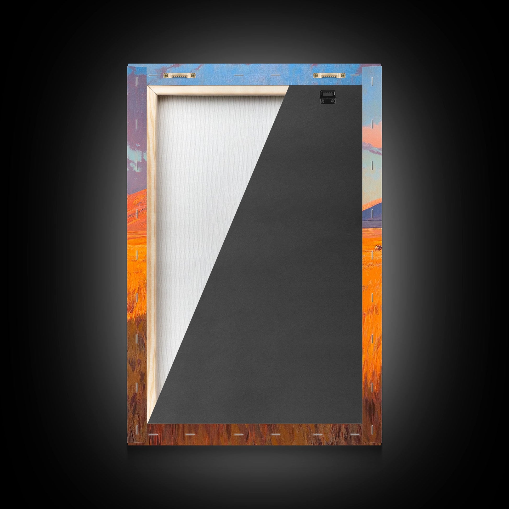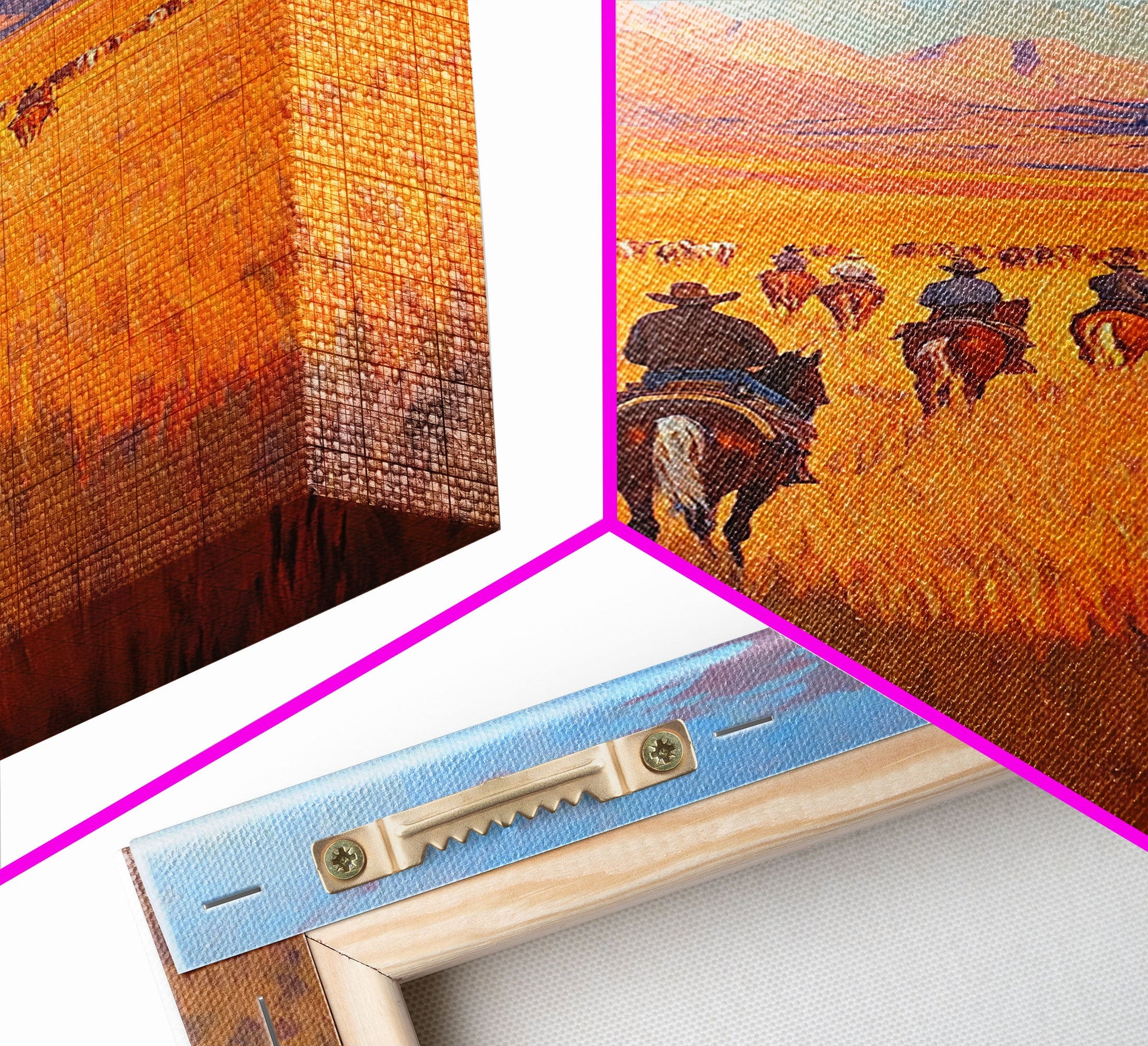 Cowboy Campfire Framed Canvas Print, Evening Gathering with Riders Around Fire, Western Landscape Art for Fall or Winter Home Decor