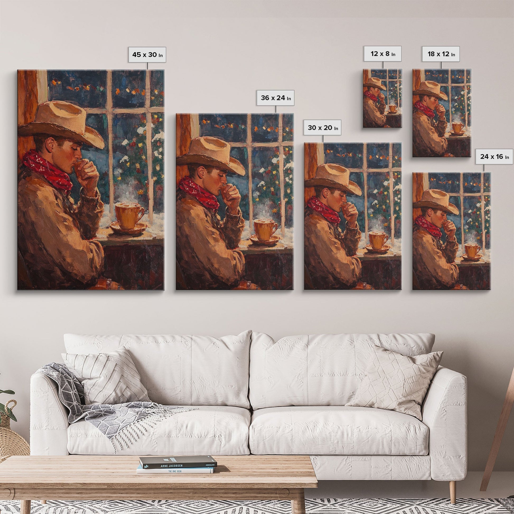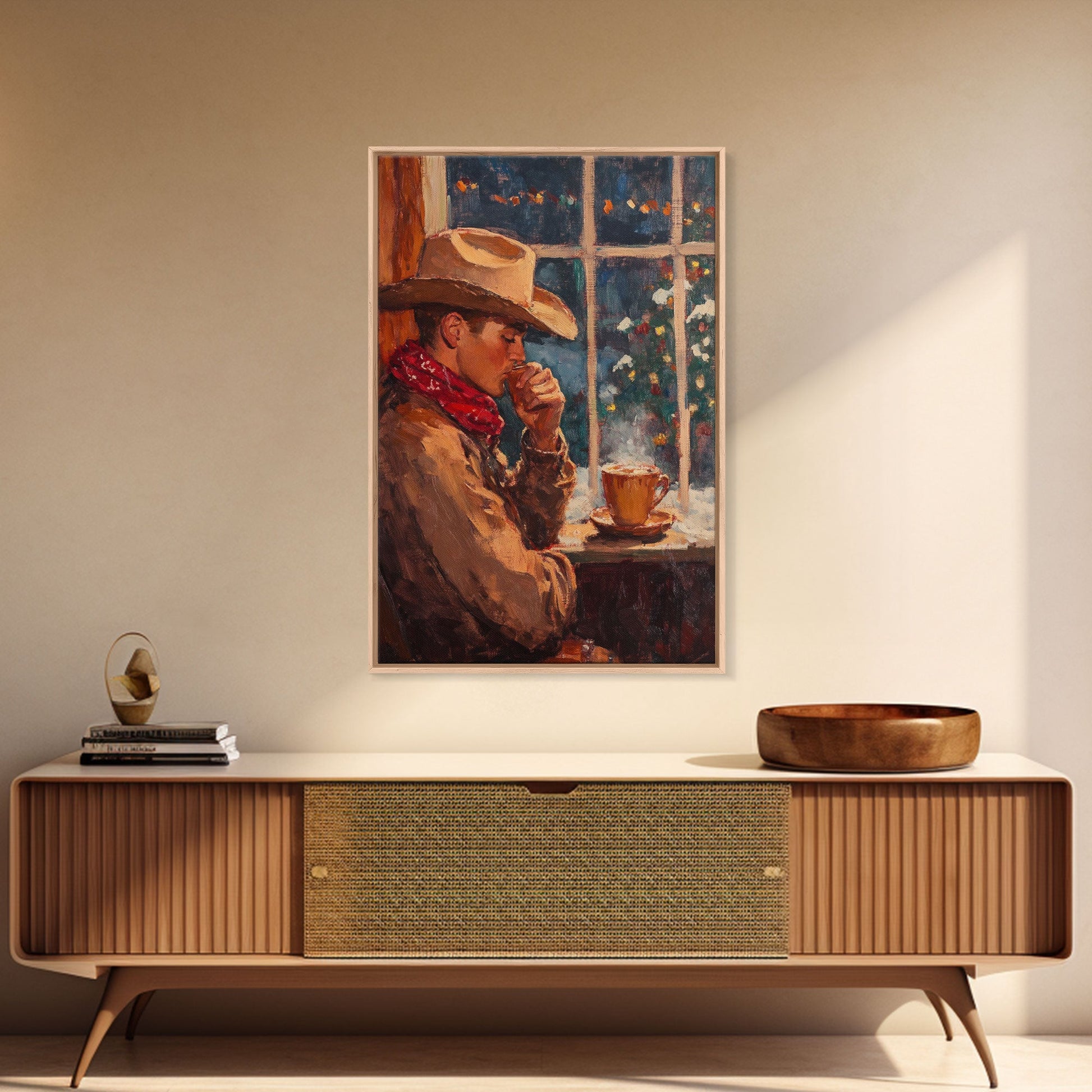 Cowboy in Snow with Coffee Framed Canvas Print - Winter Country Scene Art 2024 Cozy Christmas Wall Decor and Gift Idea