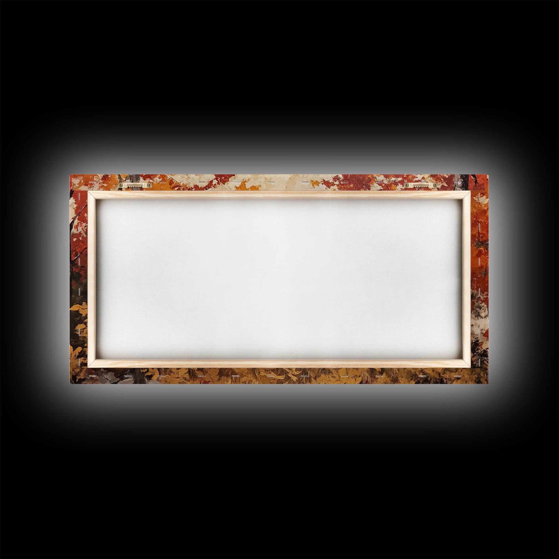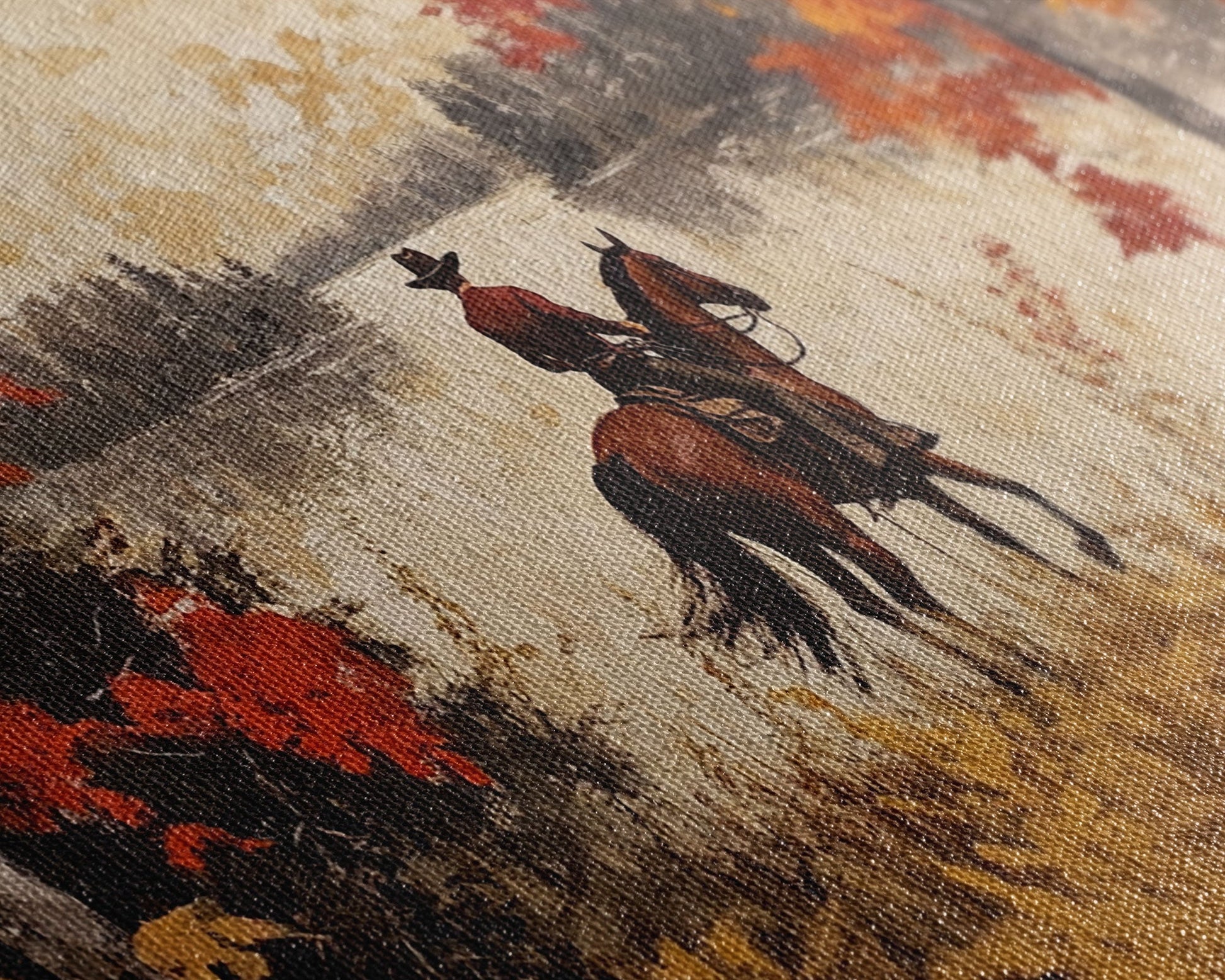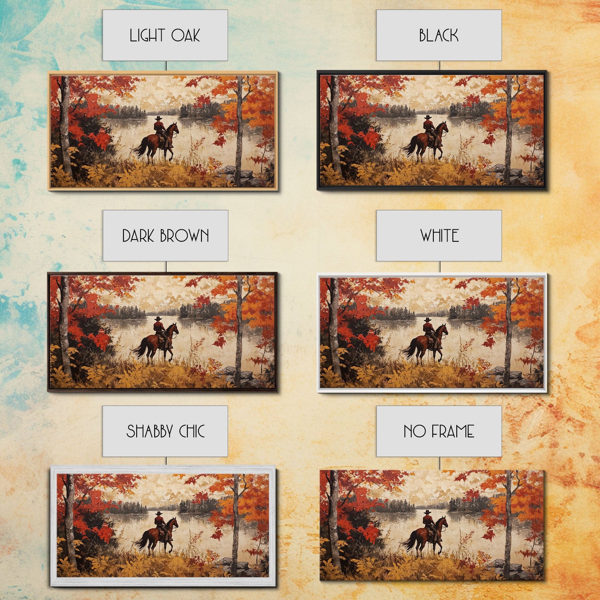 Cowboy on mountainside with red autumn leaves rugged cliffs, Framed Canvas Print, fall landscape wall art, western decor with warm colors