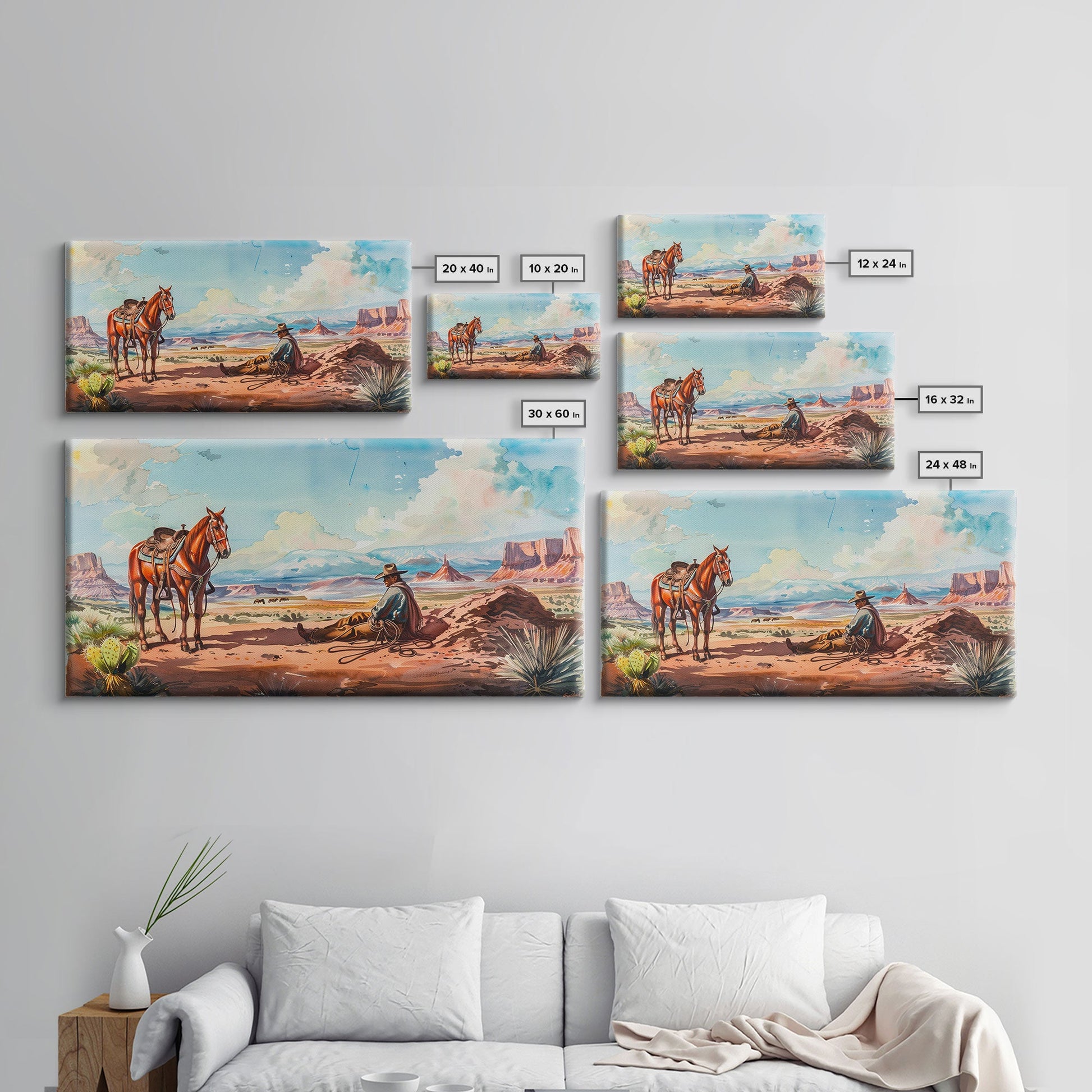 Cowboy Resting with Horse in Desert Landscape, Classic Western Art, Framed Canvas Print, Rustic Wall Decor, Living Room Decoration