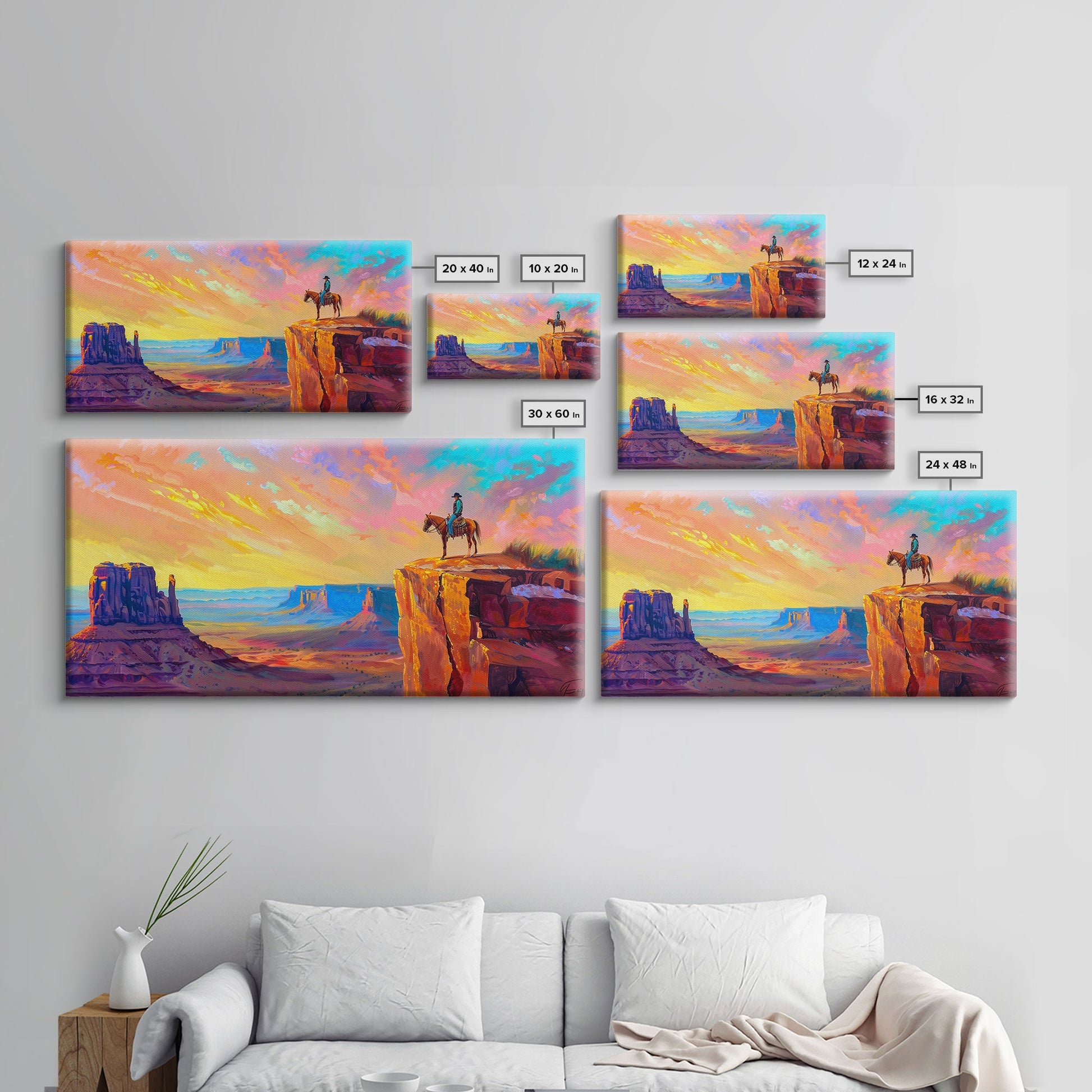 Cowboy with Horse on Cliff Edge, Farmhouse Style Framed Canvas Print for Living Room Wall Art, Vibrant Home Decor, Western Scenic Art