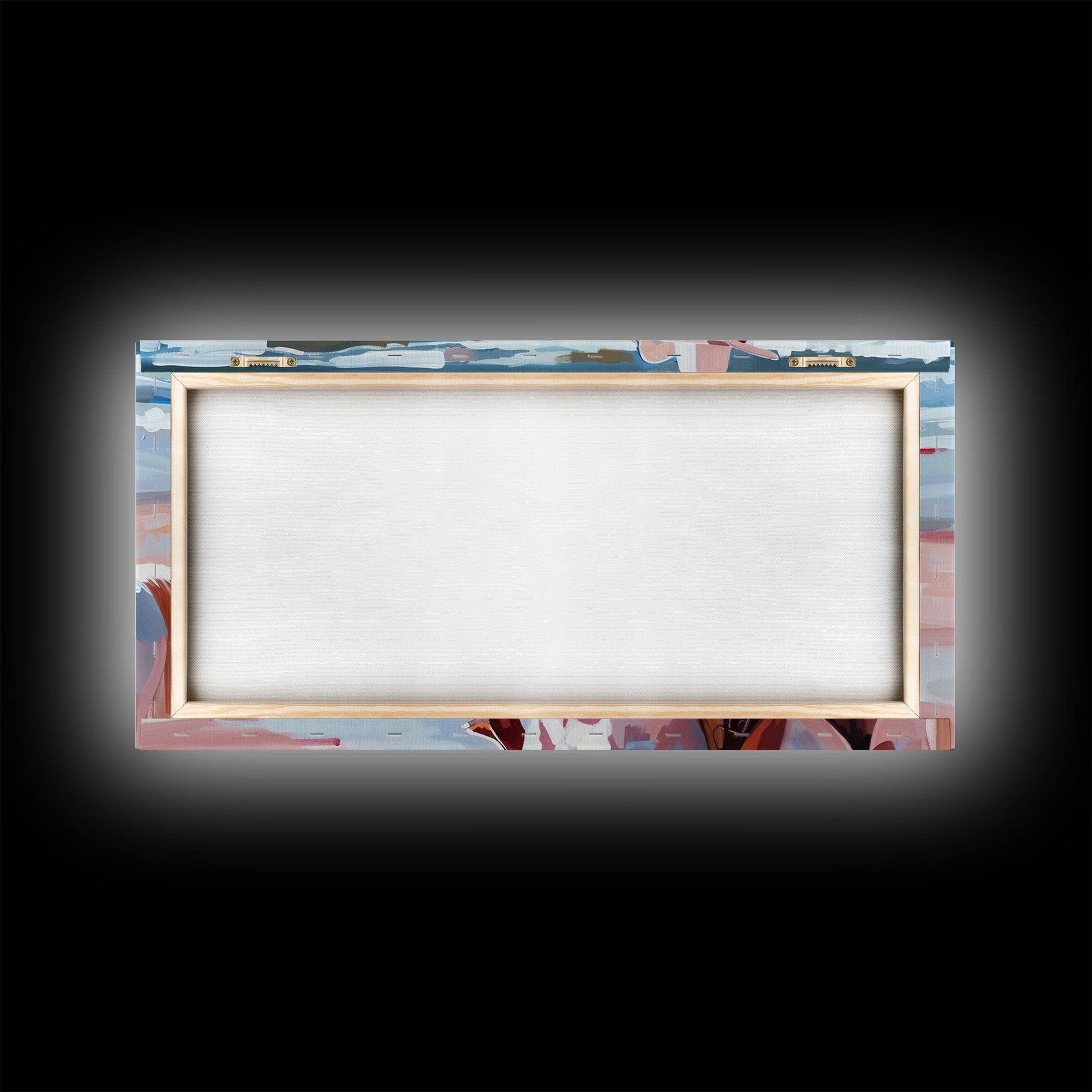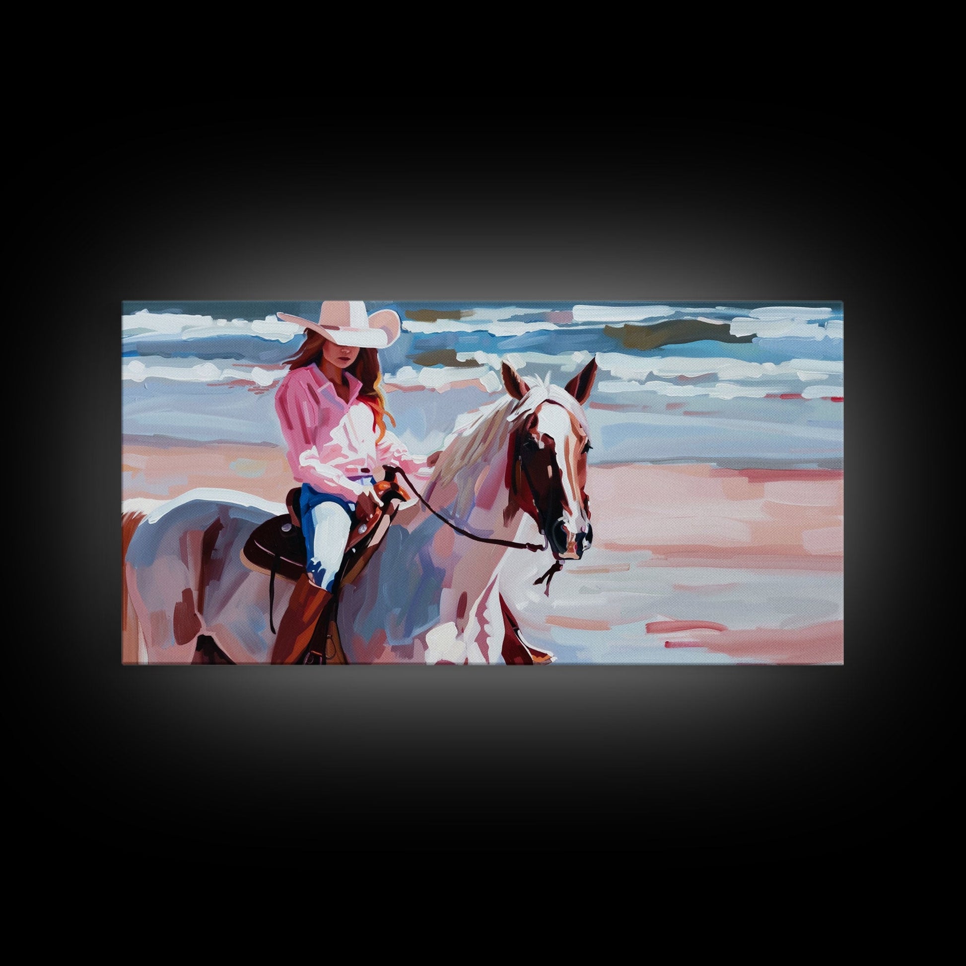 Cowgirl in Pink Shirt Riding Horse by the Sea, Beautiful Framed Canvas Print, Coastal Living Room Art, Beach Bedroom Decor, Horse Art