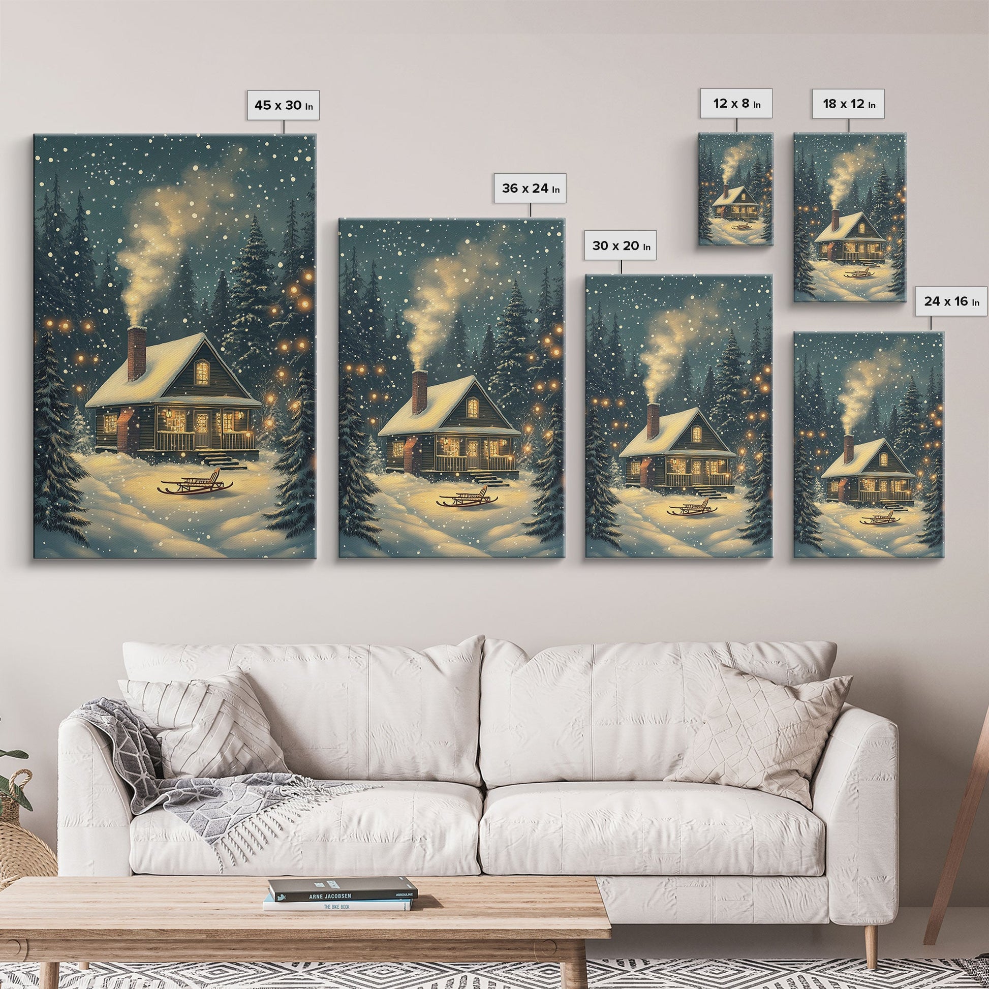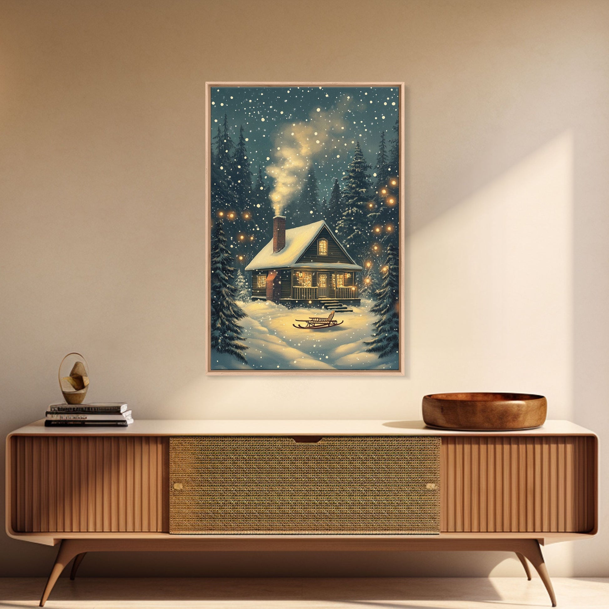 Cozy Cabin in Snowy Winter Forest, Warm Christmas Lights and Peaceful Holiday Scene, Perfect for Winter Wall Art, Framed Canvas Print