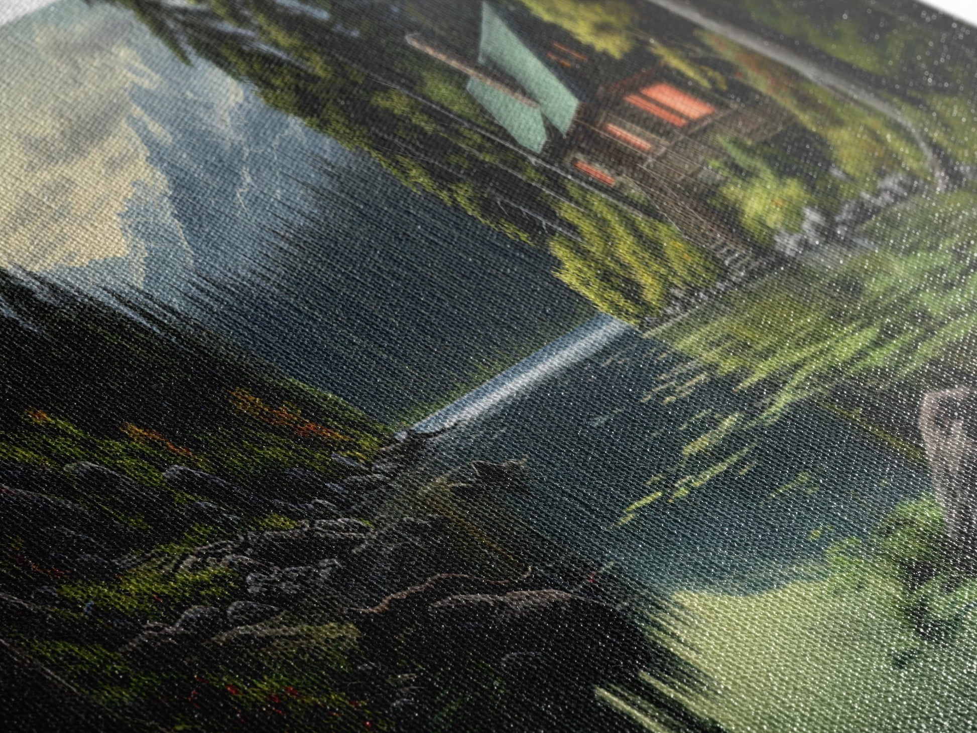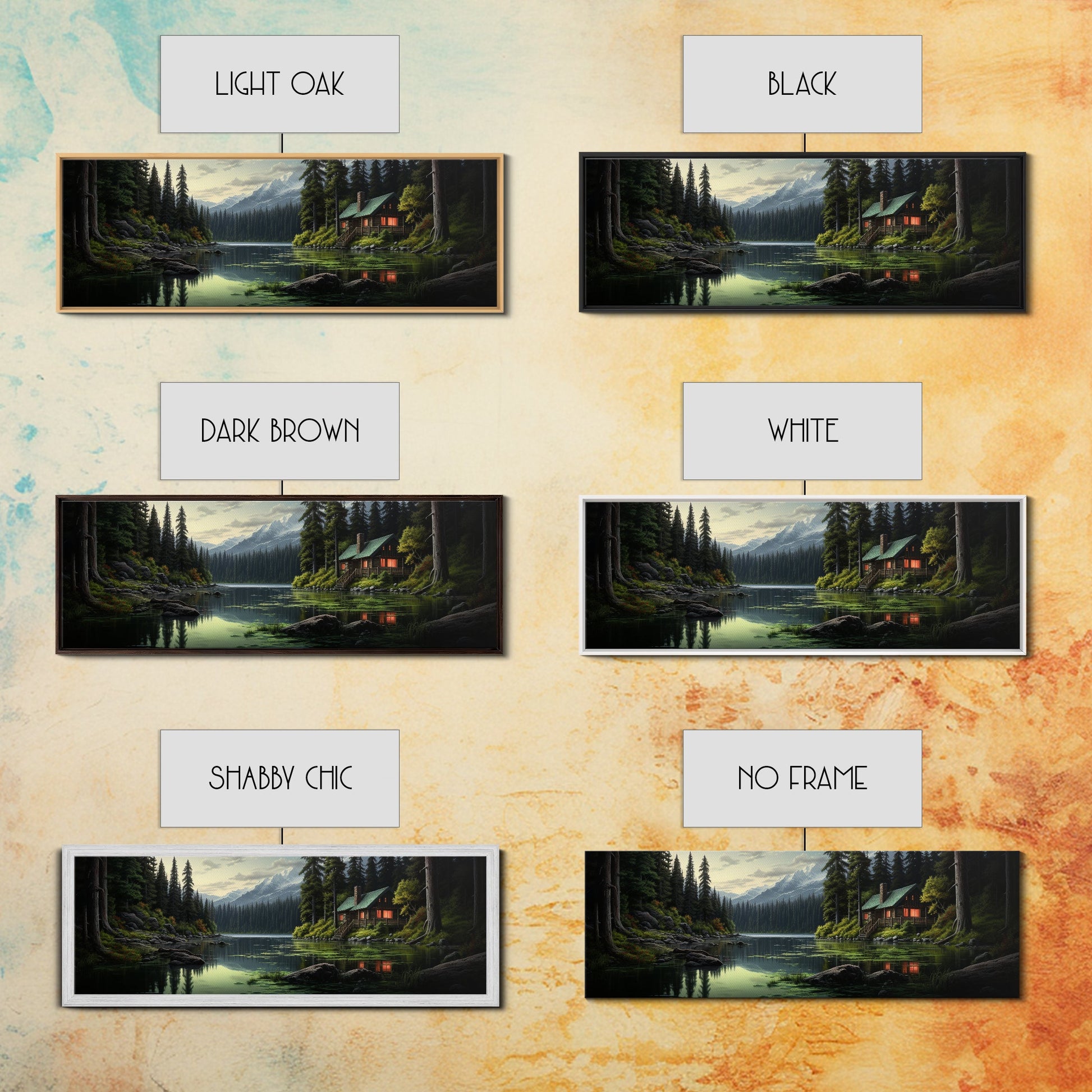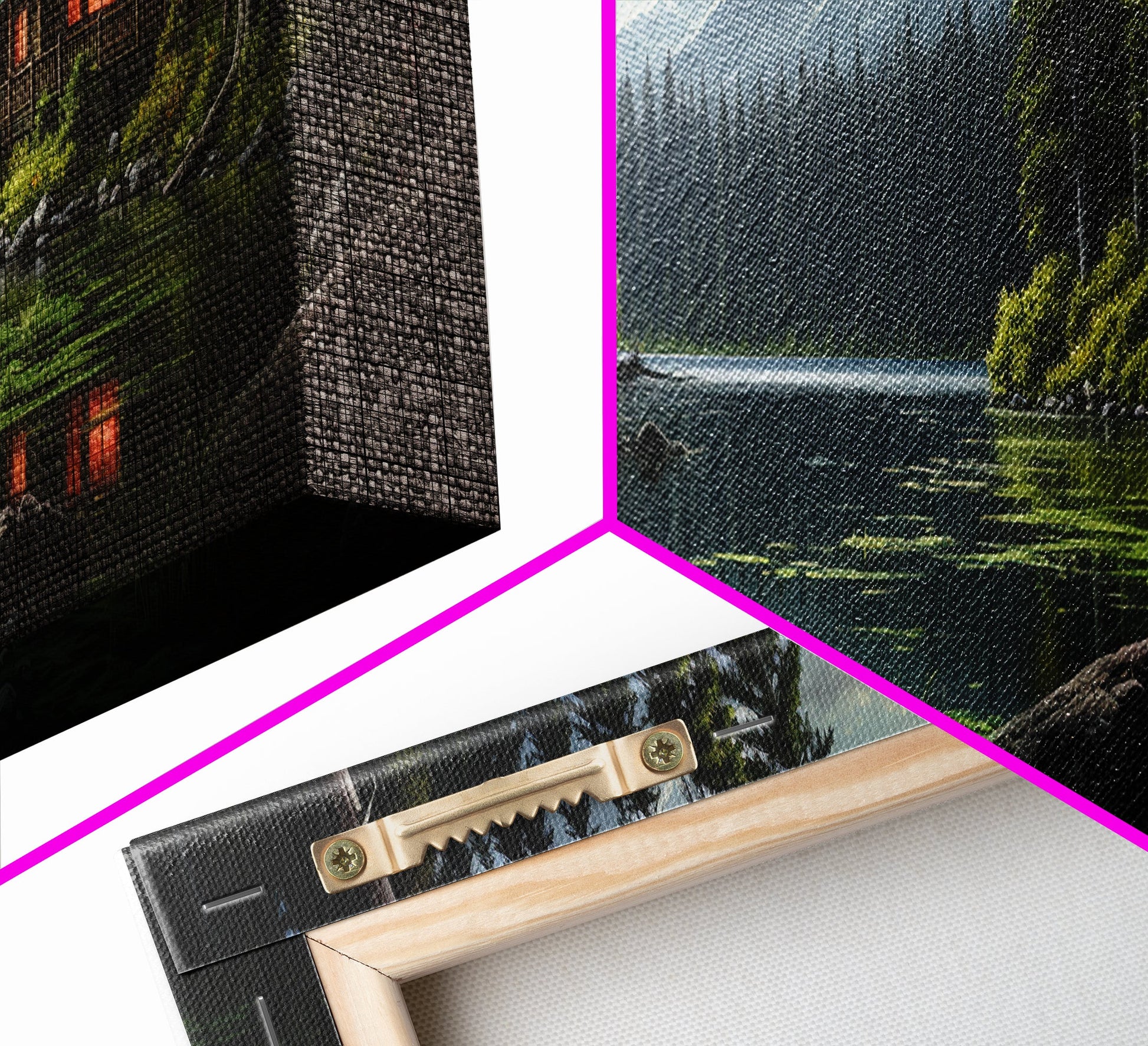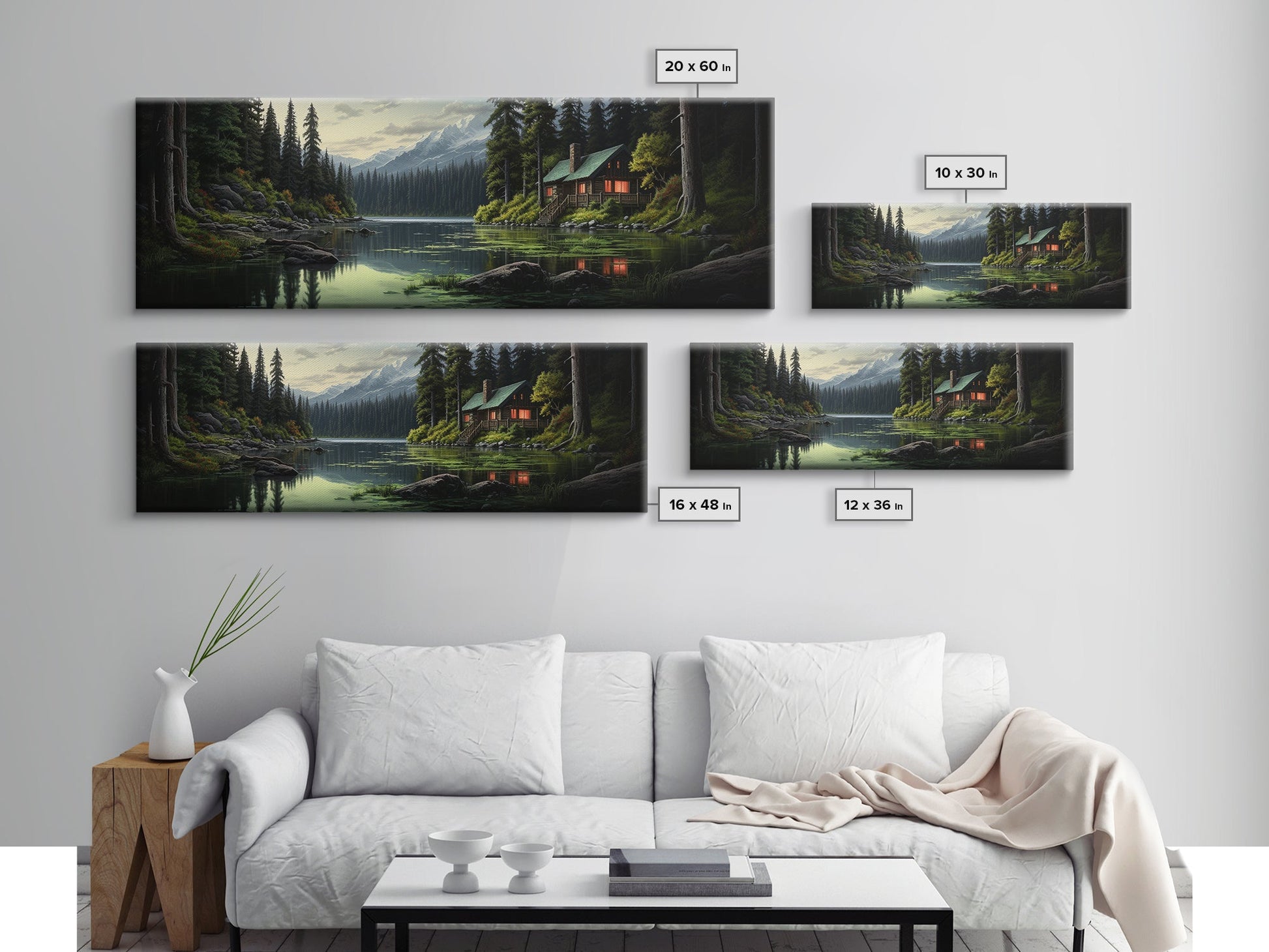 Cozy Cabin on The Lake, Framed Canvas Print, Farmhouse Decor, Landscape Painting, Unique Wall Art