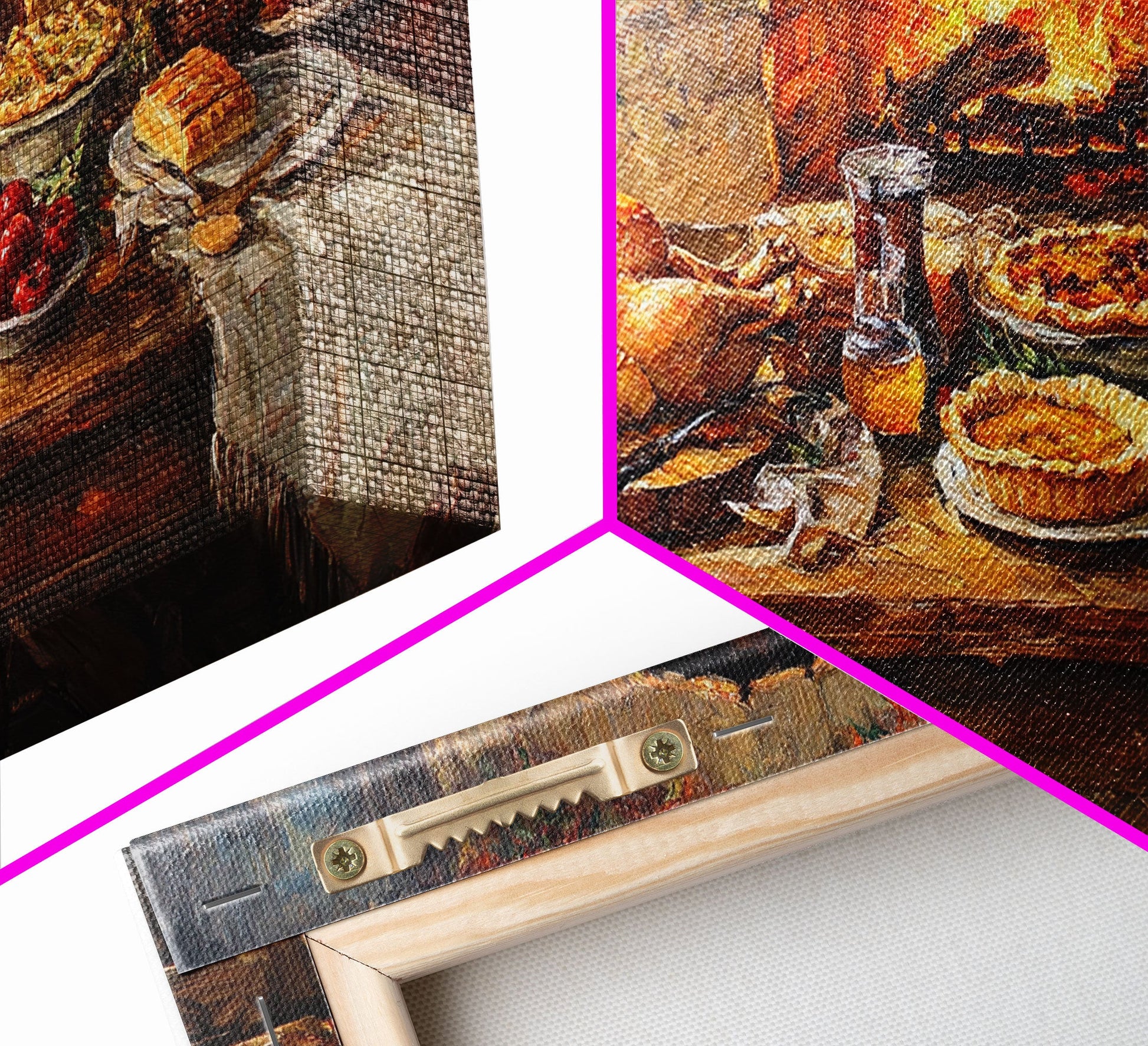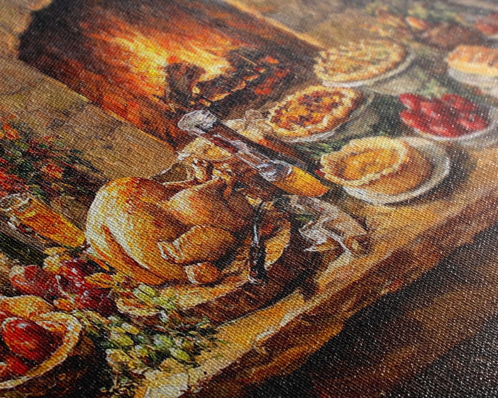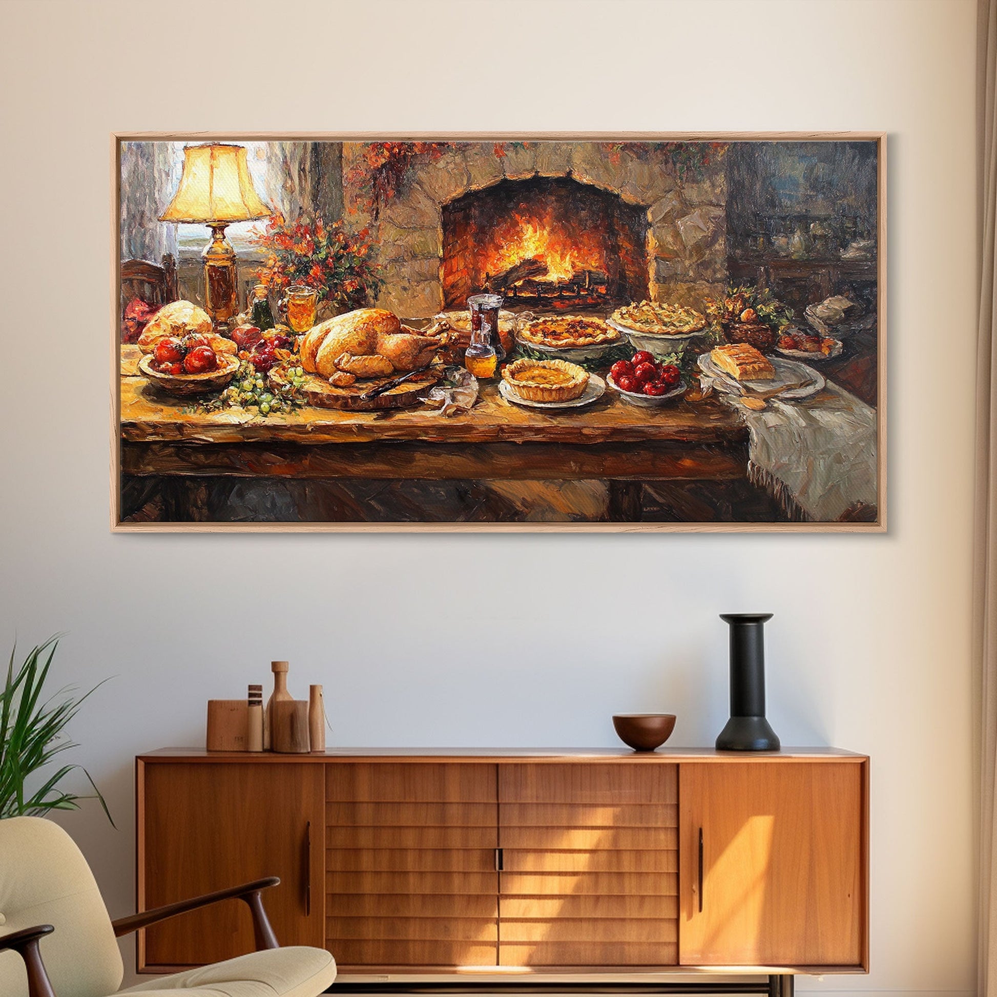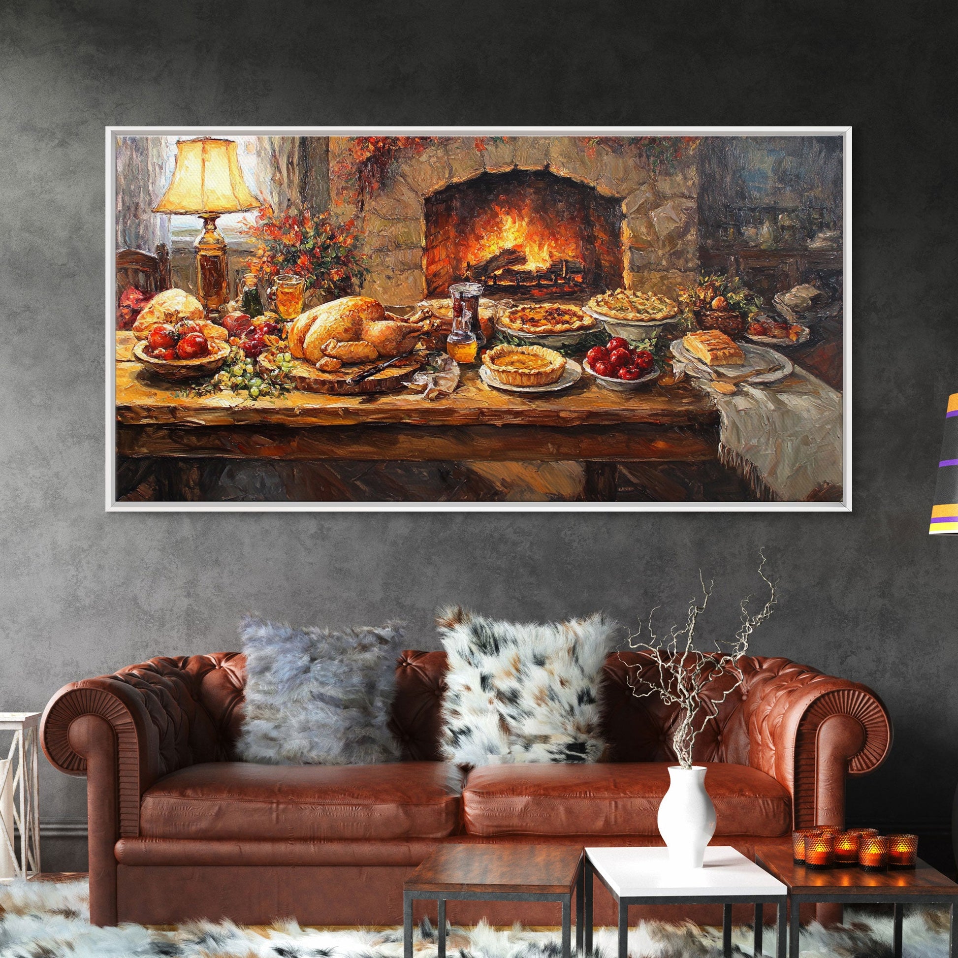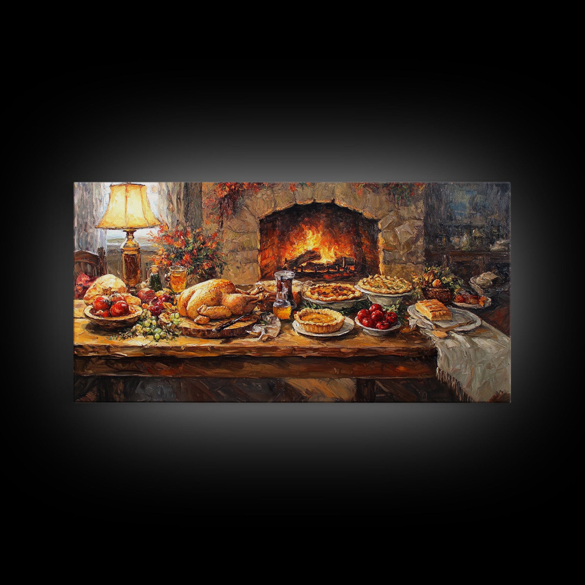Cozy Thanksgiving Feast by Fireplace Framed Canvas Print Seasonal Wall Art, Rustic Fall Decor, Harvest Celebration Art Print for Home