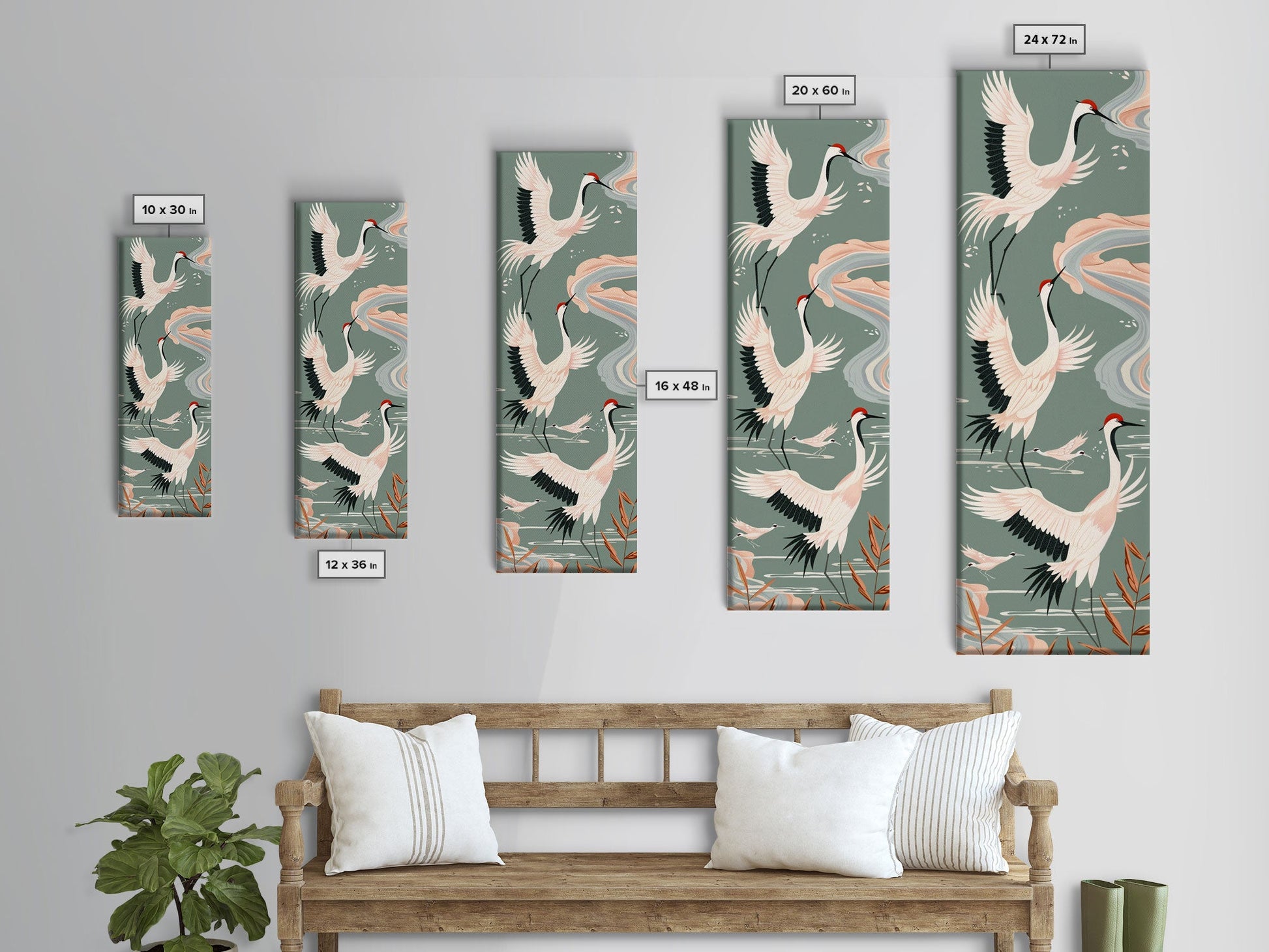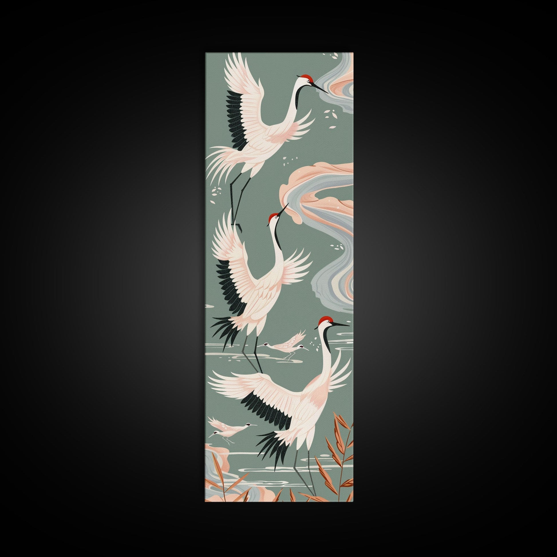 Cranes In Flight Framed Canvas Print, Traditional Japanese Art With Soft Colors And Detailed Wings, Wall Art Ready To Hang