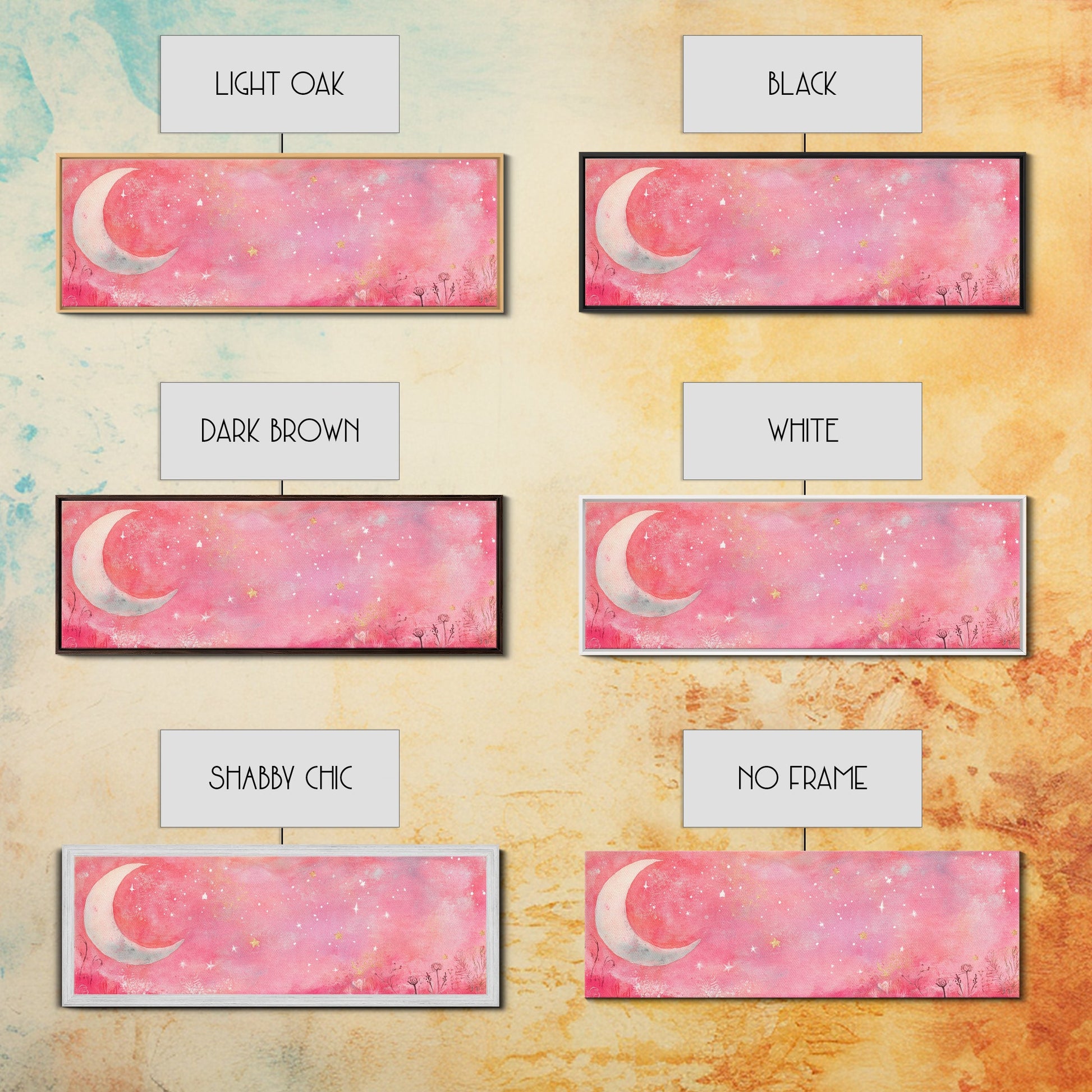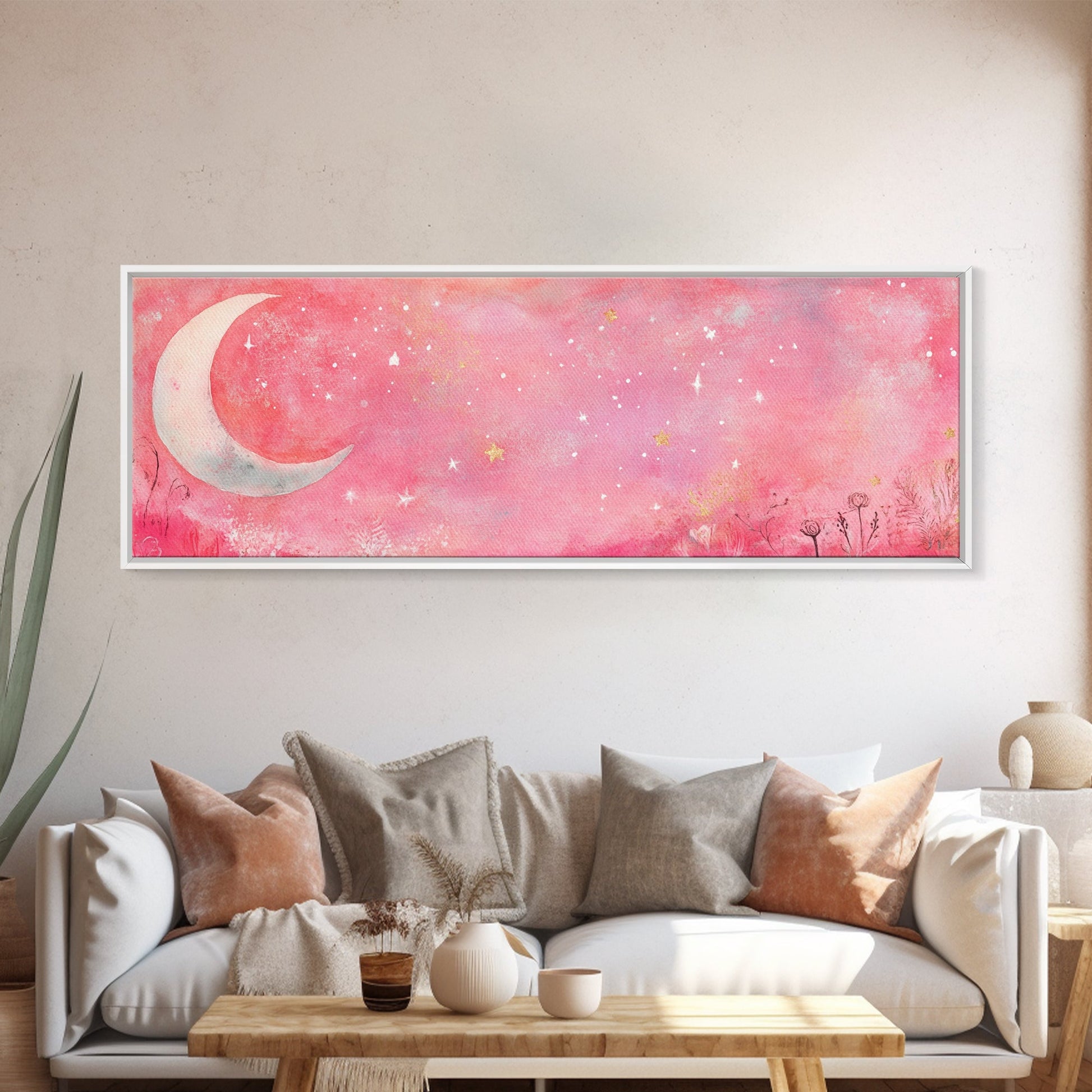 Crescent Moon Painting Canvas Print with Whimsical Starry Sky, Pink Wall Art for Living Room or Guest Room, Dreamy Decor