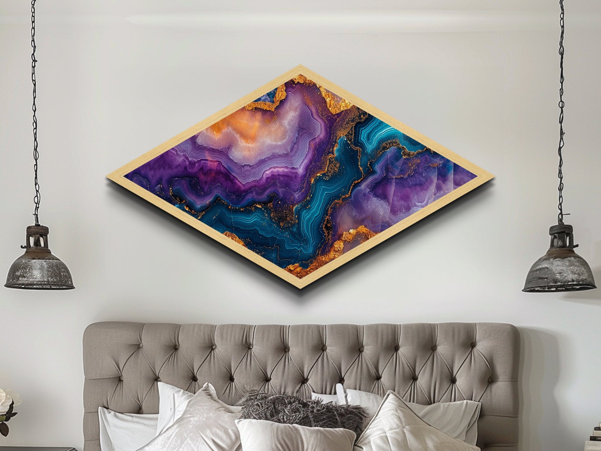 Crystalline Abyss Diamond Shaped Canvas Embossed Print Geode Gemstone Wall Art Vibrant Purple Blue Gold Abstract Office Decor