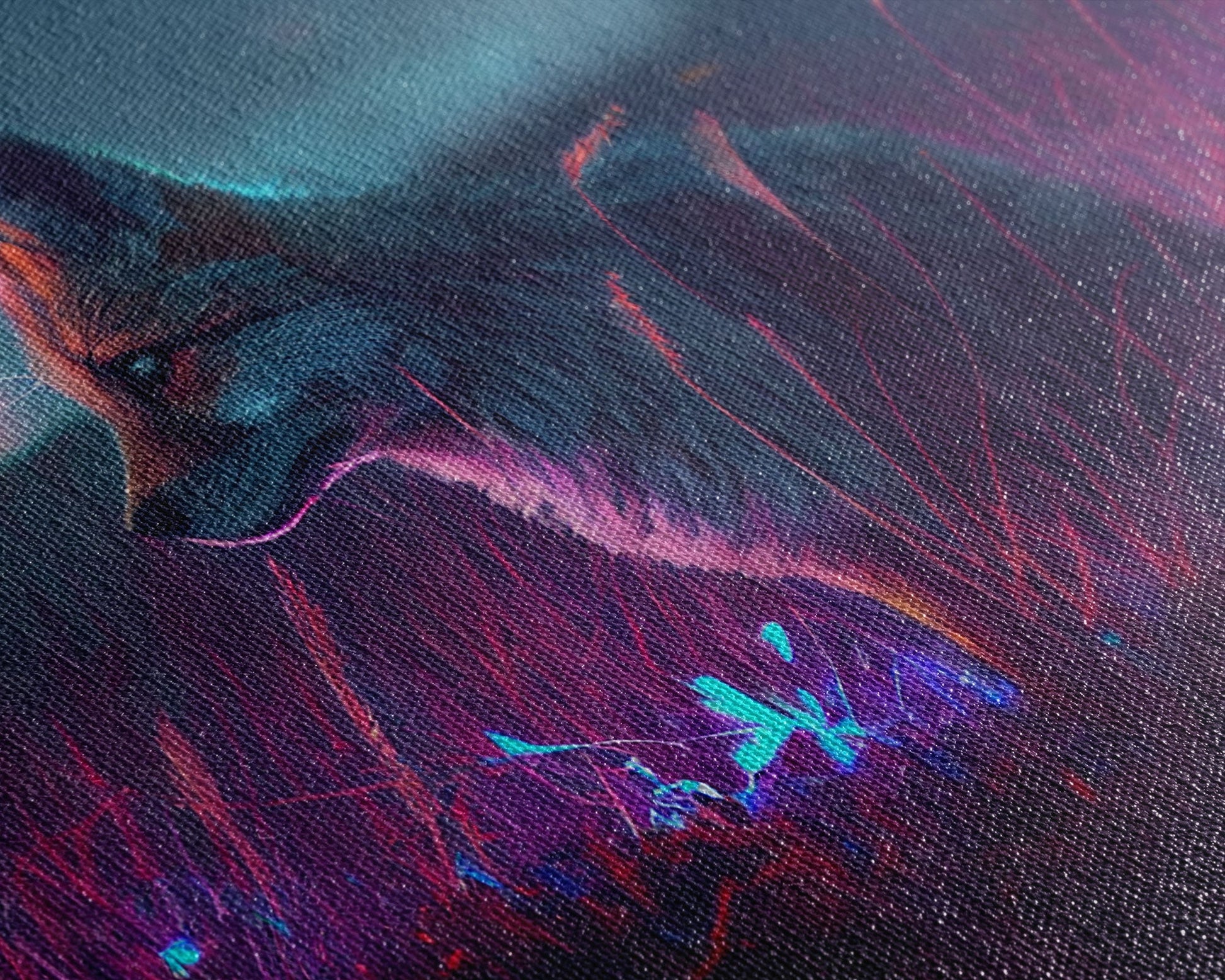Cute animal prints, vaporwave fox hunting in the tall grass, framed canvas print