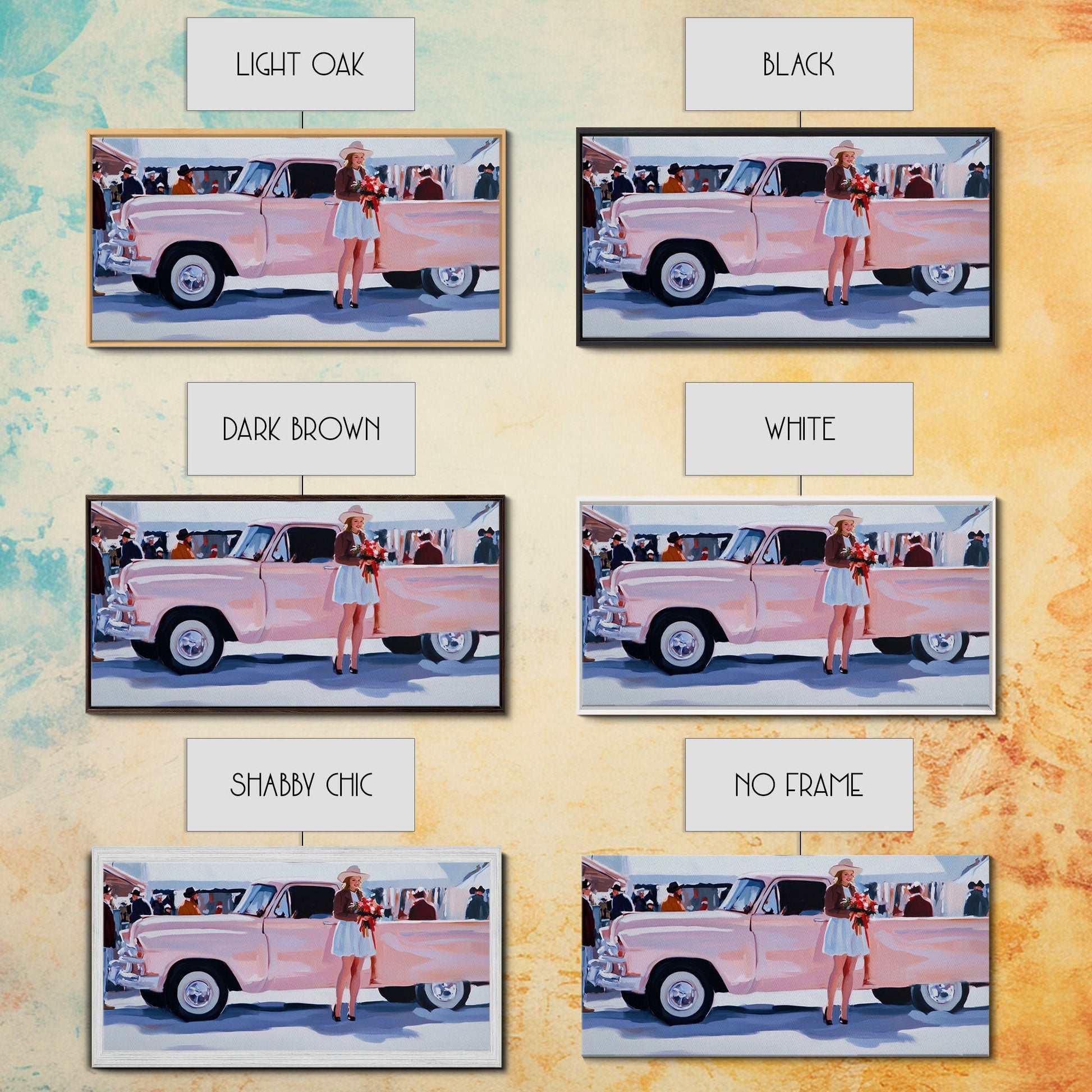Cute Cowgirl and Her Pink Truck, Framed Canvas Print, Retro Pink Fall Decor, Wall Art Fall Home Decor, Ideal Gift Idea Rustic Seasonal Decor