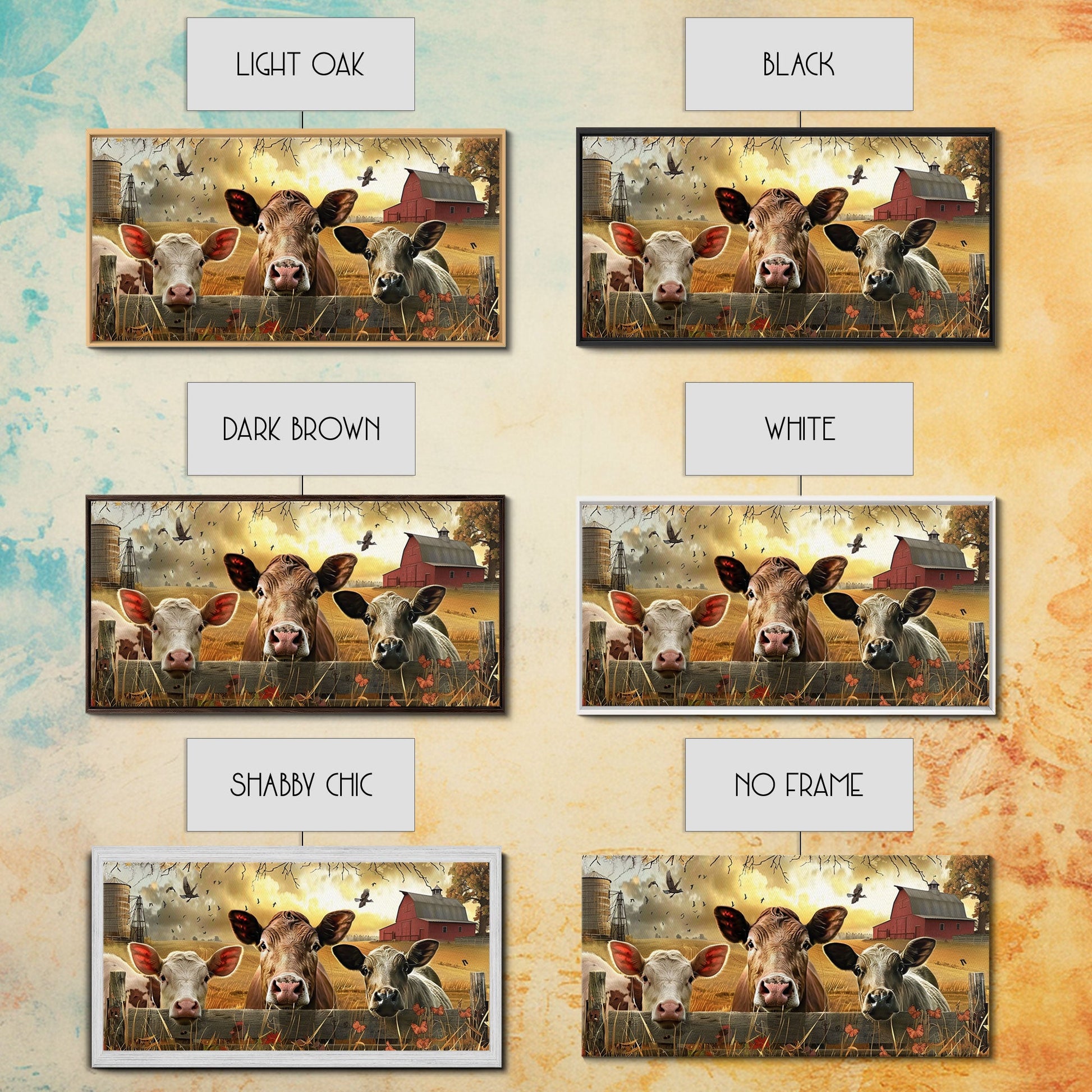 Cute cows peeking through barn fence, Framed Canvas Print, ideal for farmhouse living room, country style wall art decor