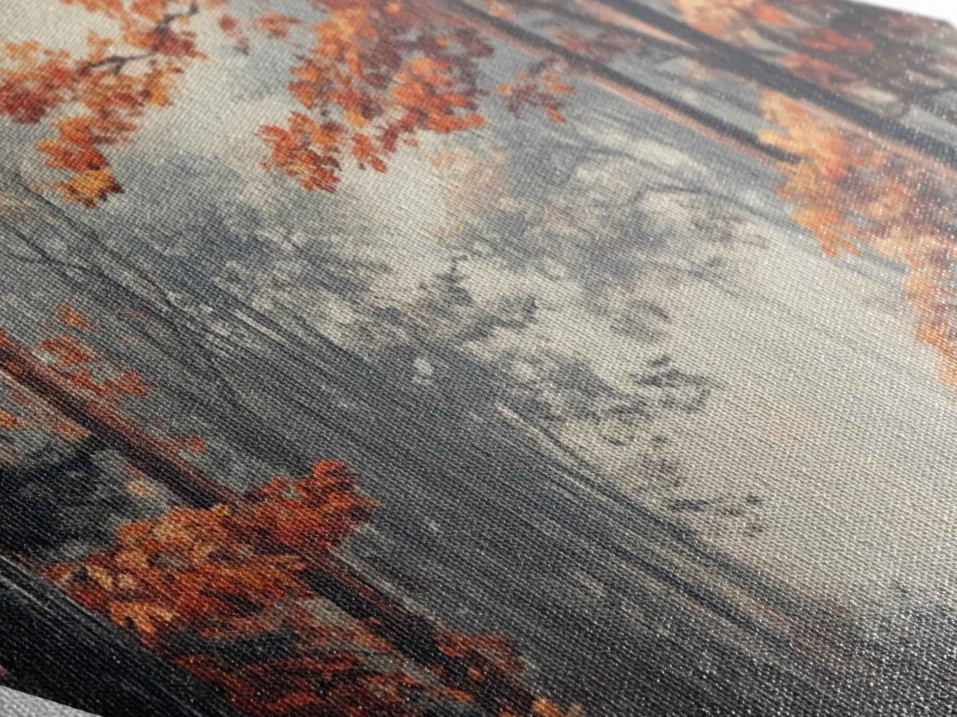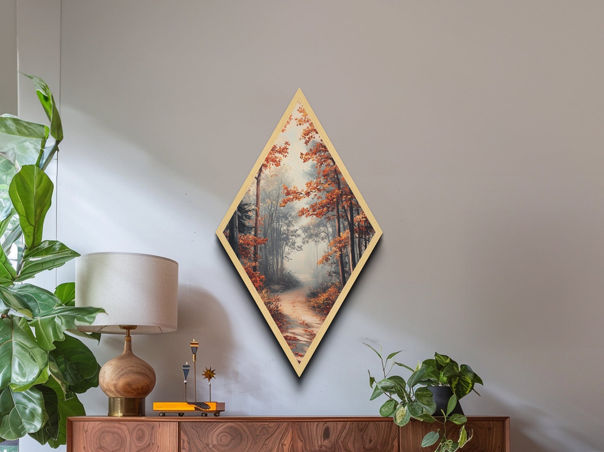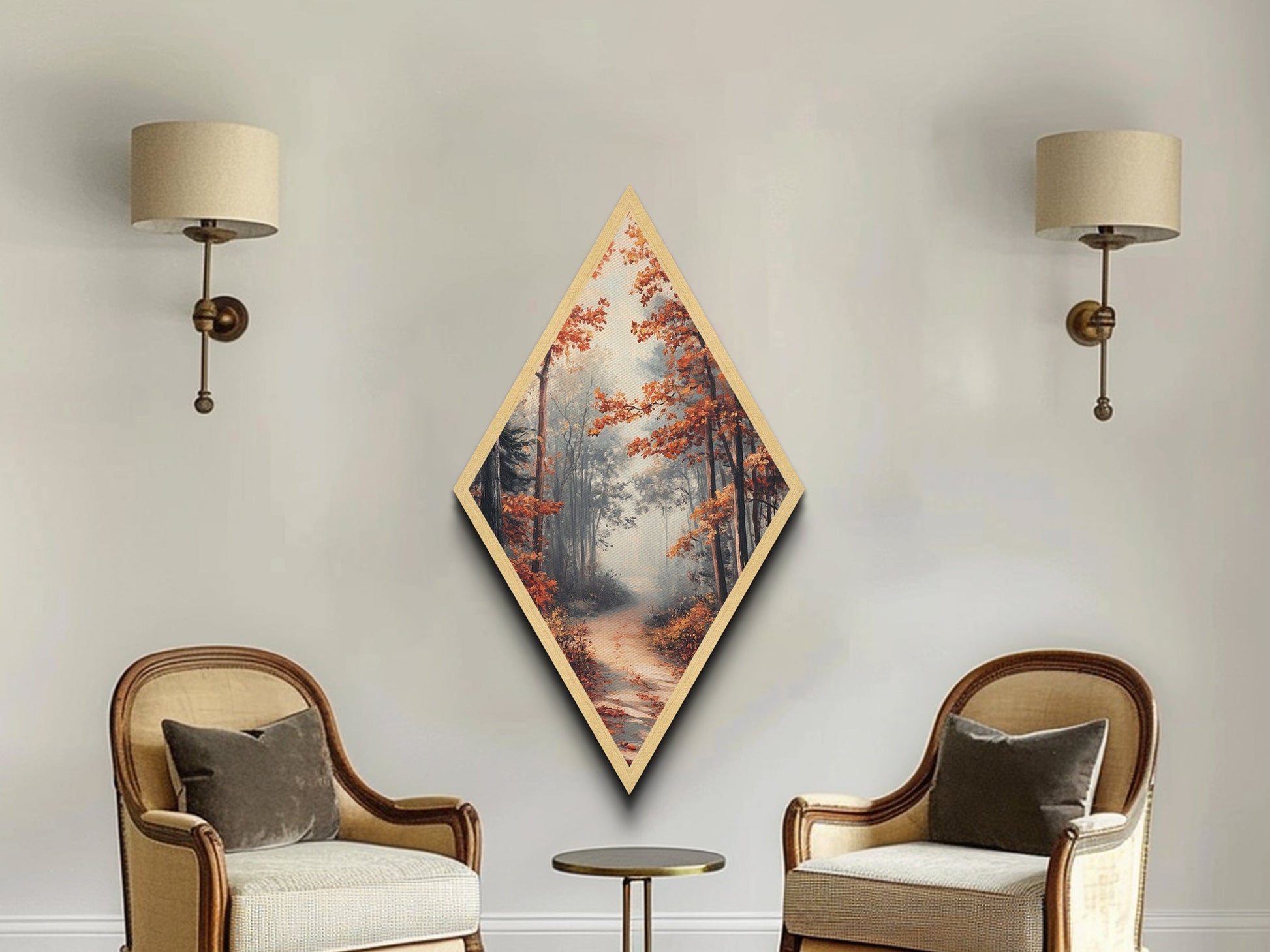 Diamond Shaped Autumn Forest Glow, warm foliage scenic Canvas Textured Print, cozy woodland path artwork, rustic fall home wall piece