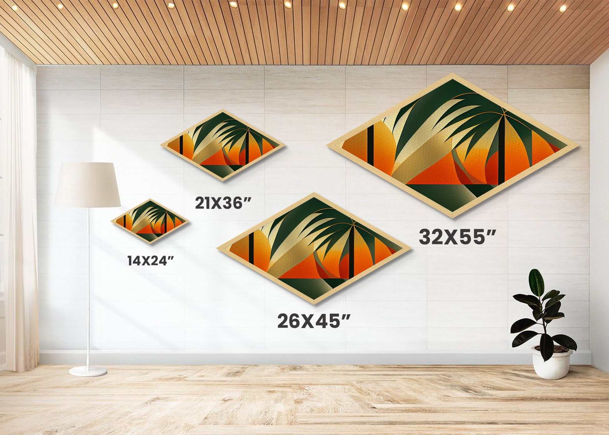 Diamond Shaped Palm Horizon — Tropical Abstract Retro Sunset Canvas Embossed Print, Geometric Island Decor, Bold Beach Theme