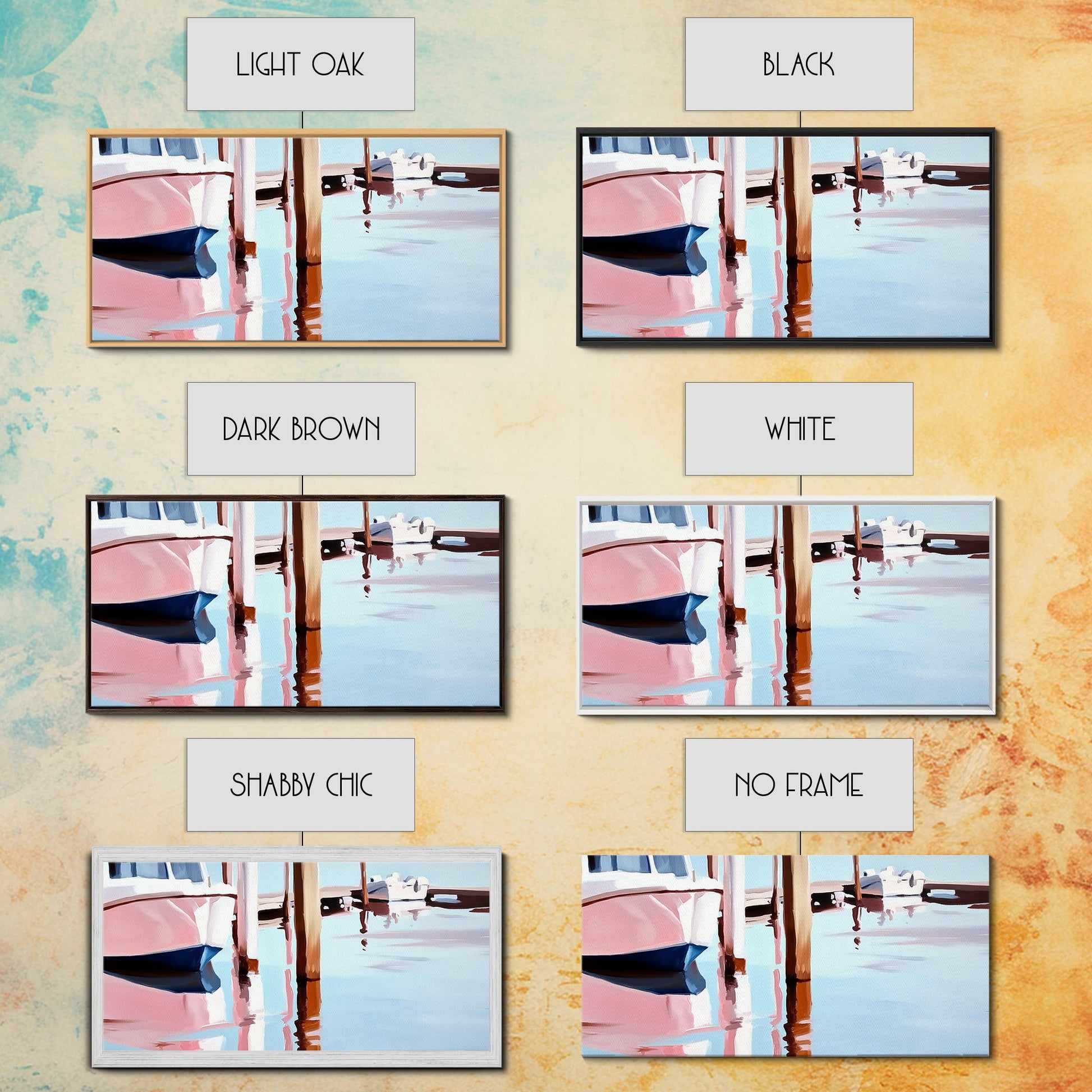 Docked Boats, Waterfront Scene, Canvas Print, Nautical Home Decor, Living Room Wall Art, Soft Pastel Aesthetic, Minimalist Seaside