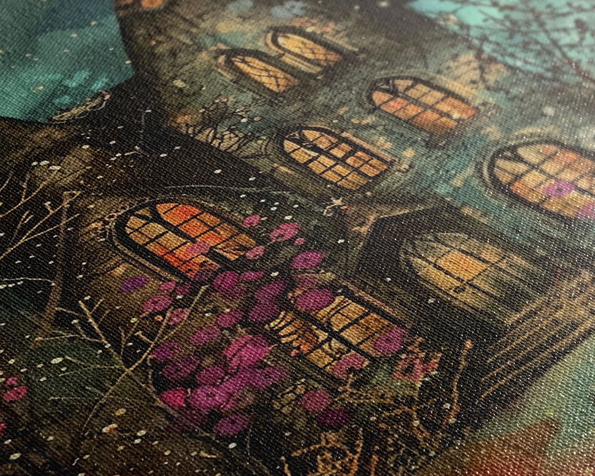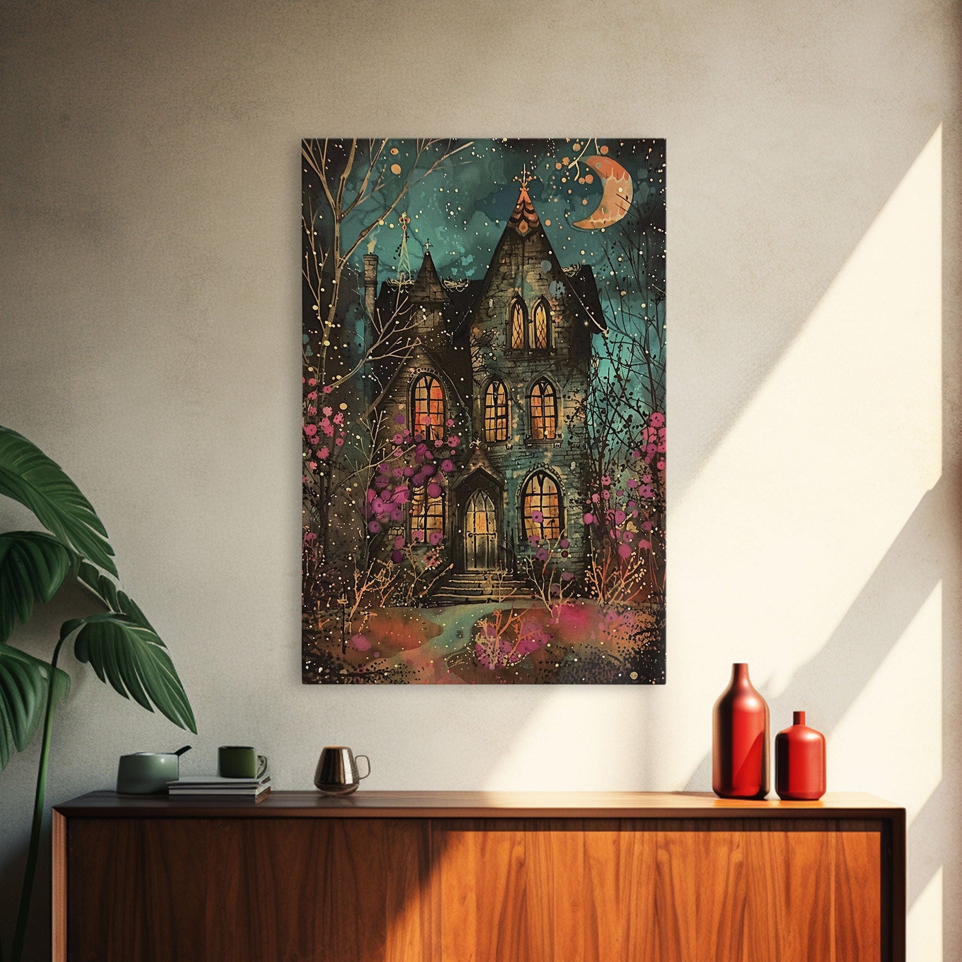 Enchanted Gothic House Framed Canvas Print, Halloween Wall Art, Spooky Art, Home Decor, Living Room Decor, Gothic Artwork, Haunted House