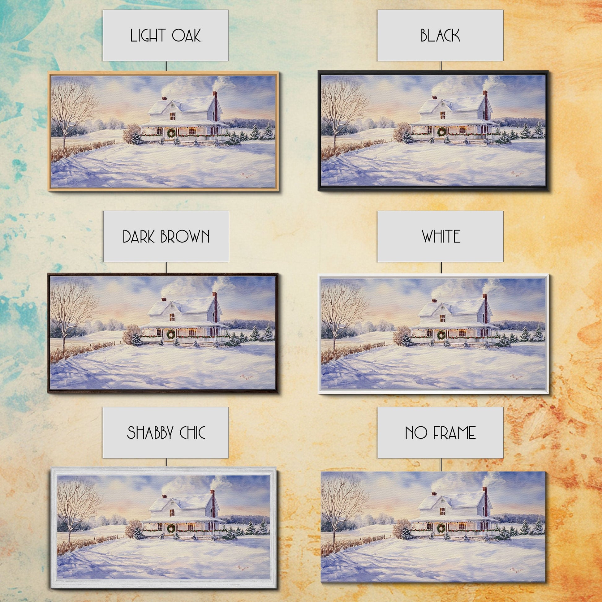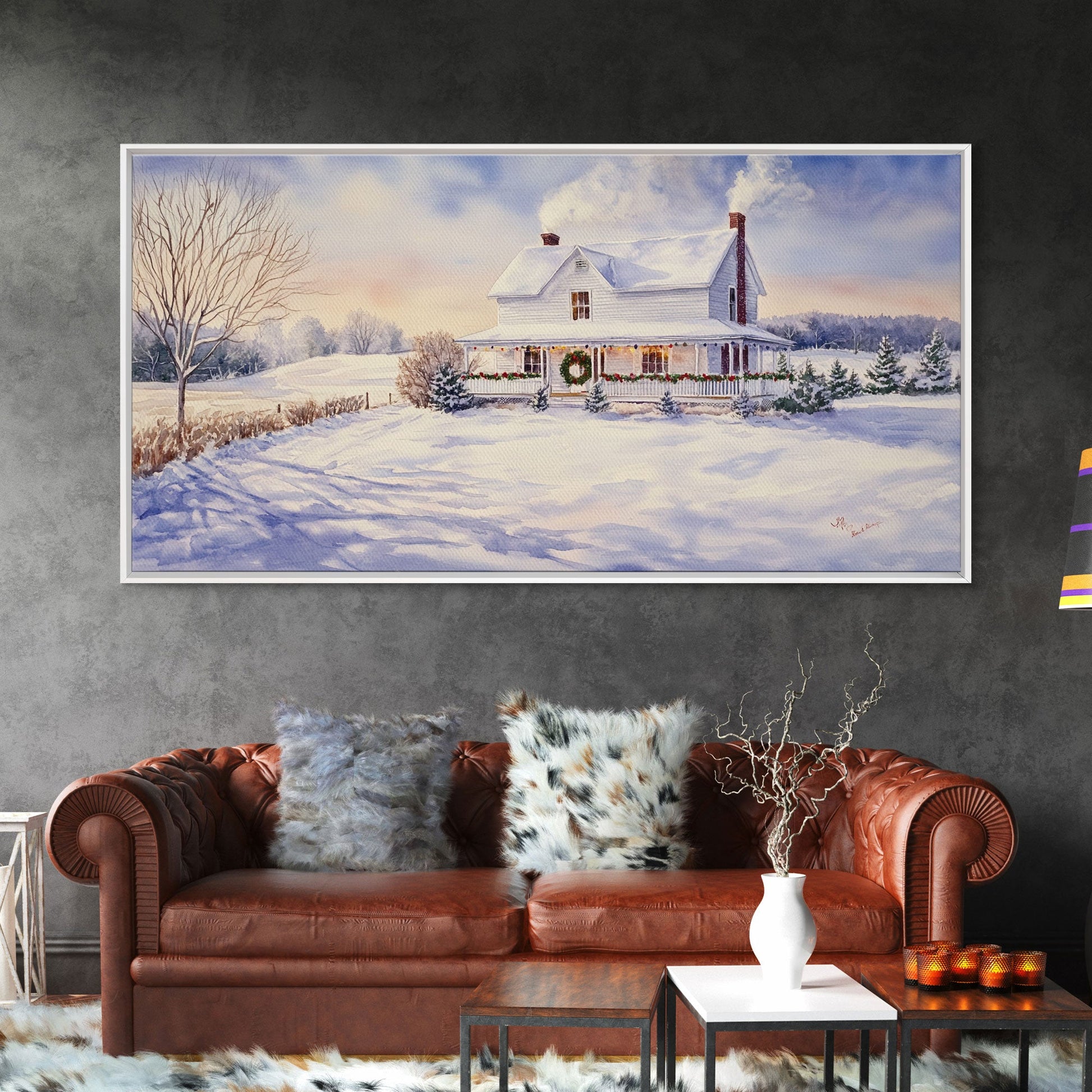 Farmhouse Christmas decor Framed Canvas Print snowy white farmhouse with wreath winter wonderland holiday decor best gift Christmas wall art