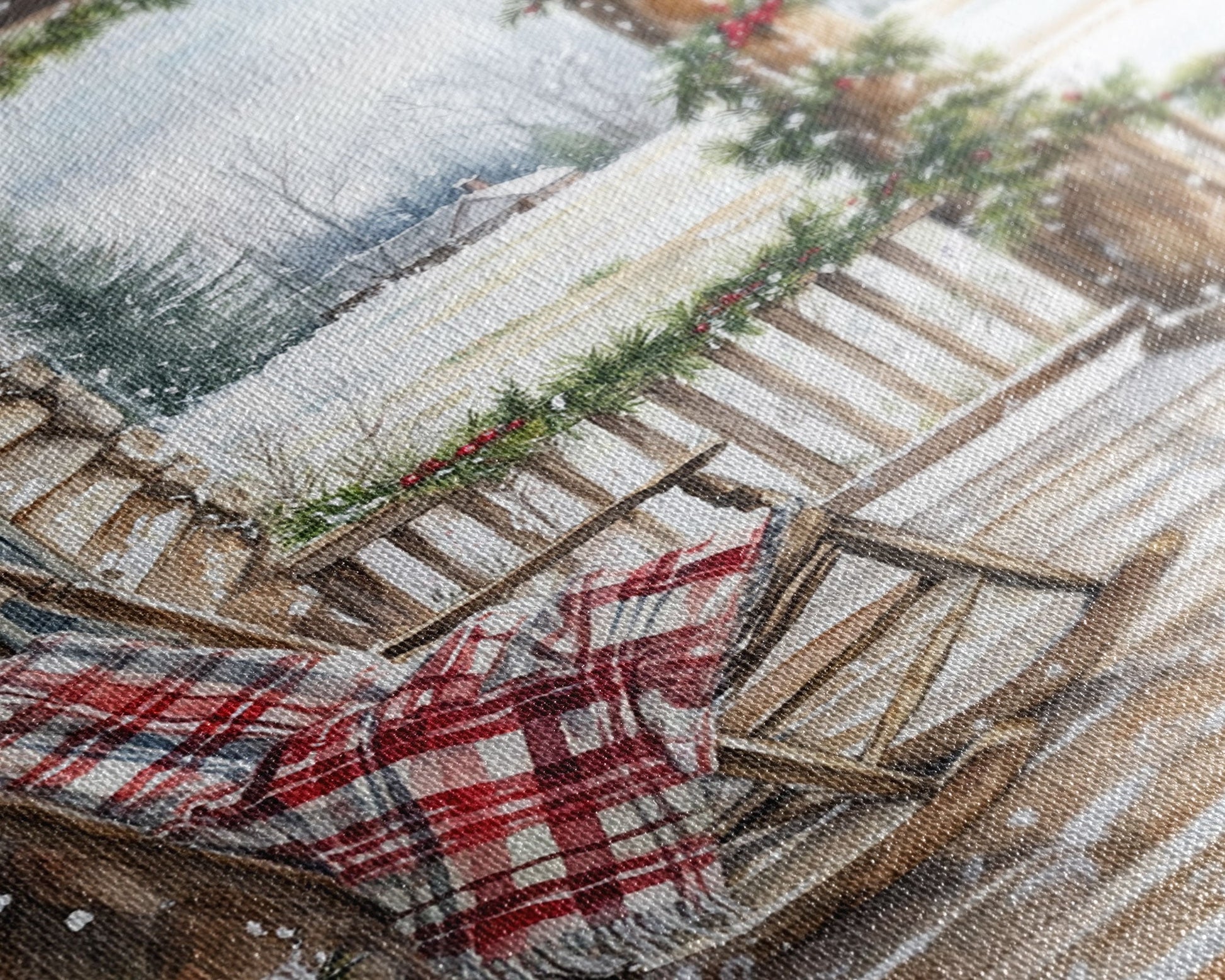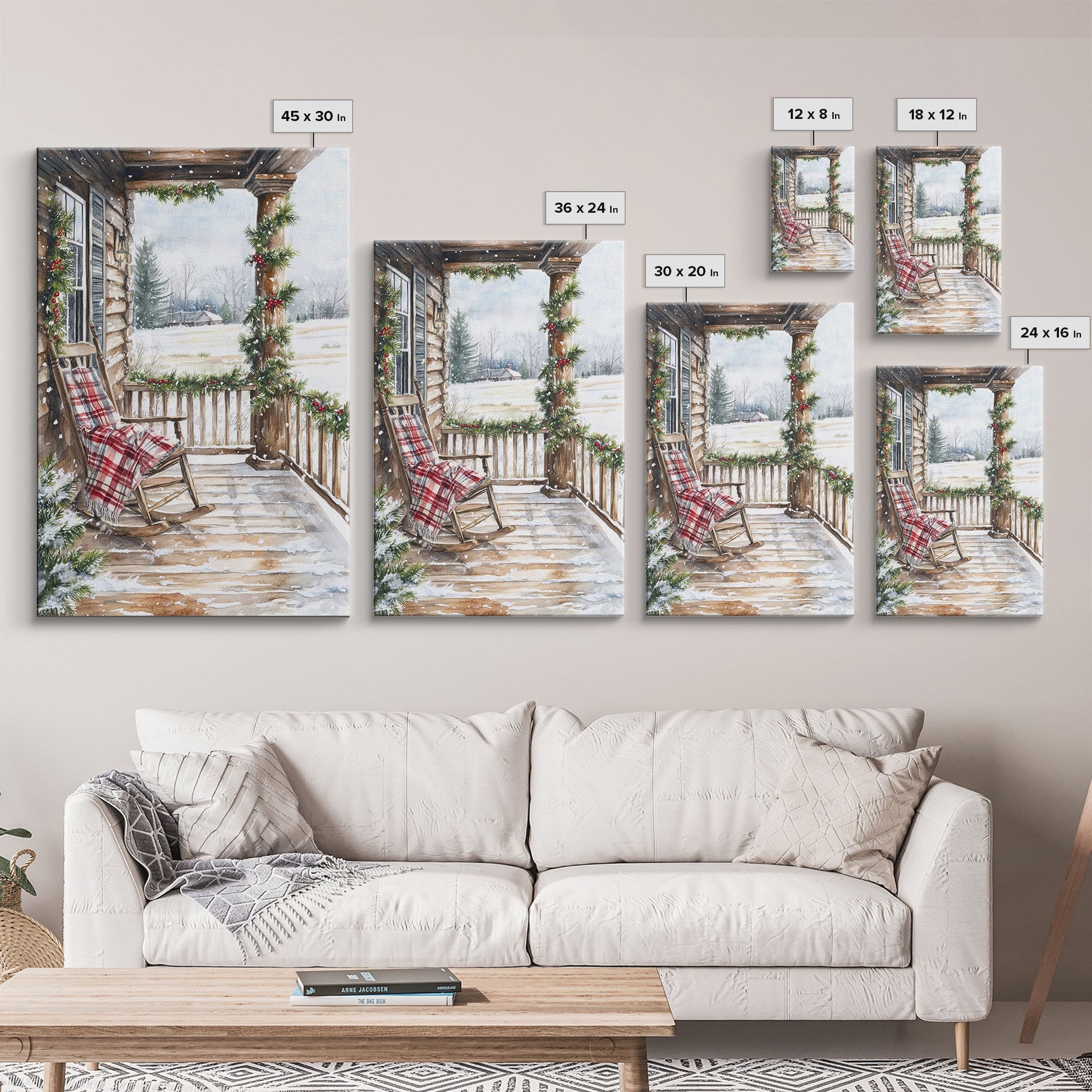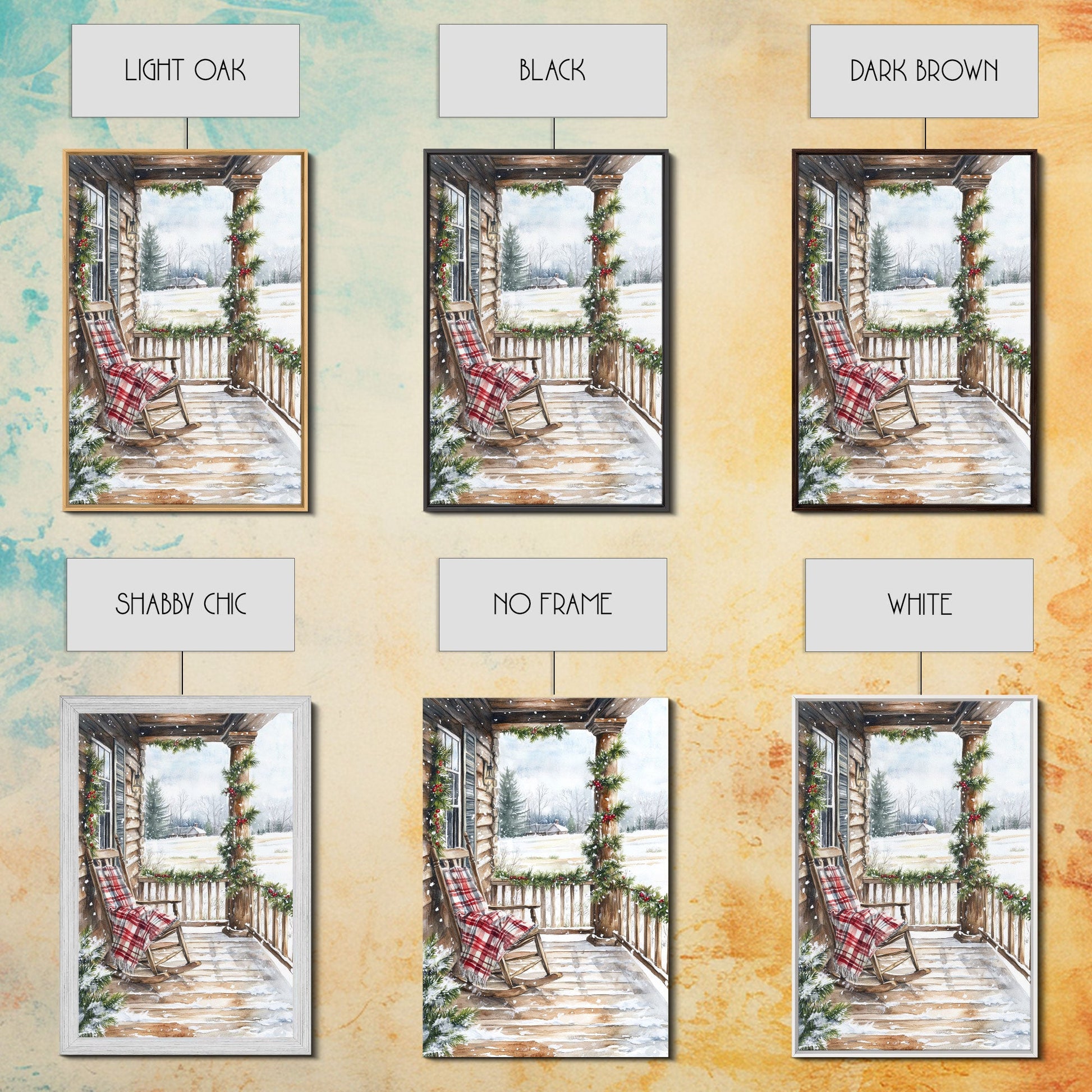 Farmhouse porch decorated with garland and cozy rocking chair, Framed Canvas Print winter decor idea for rustic home Christmas wall art