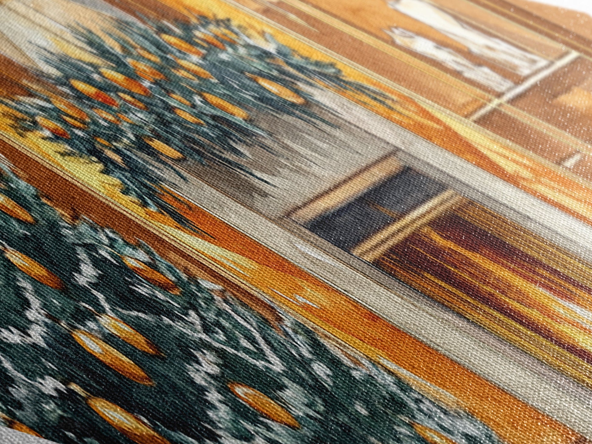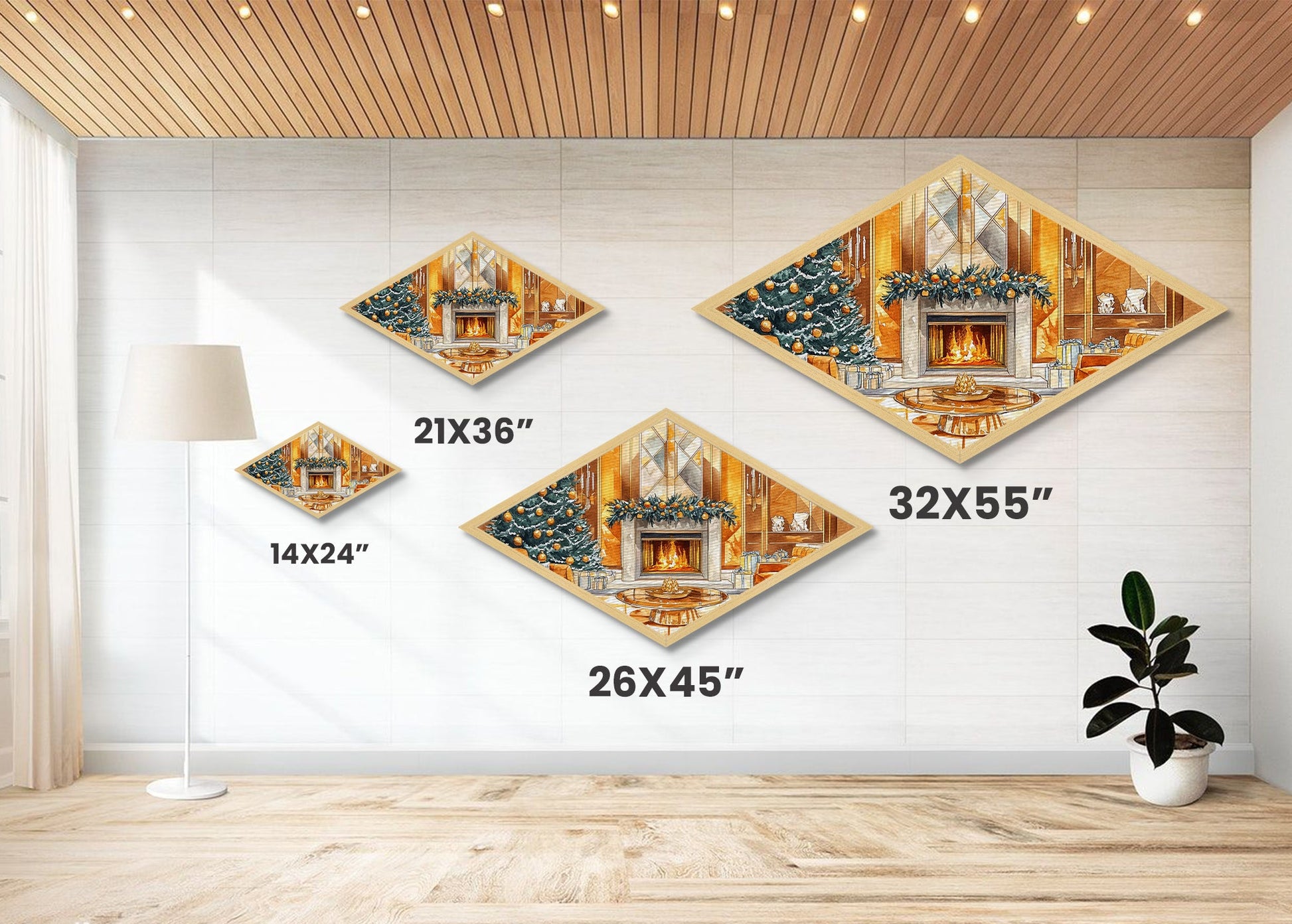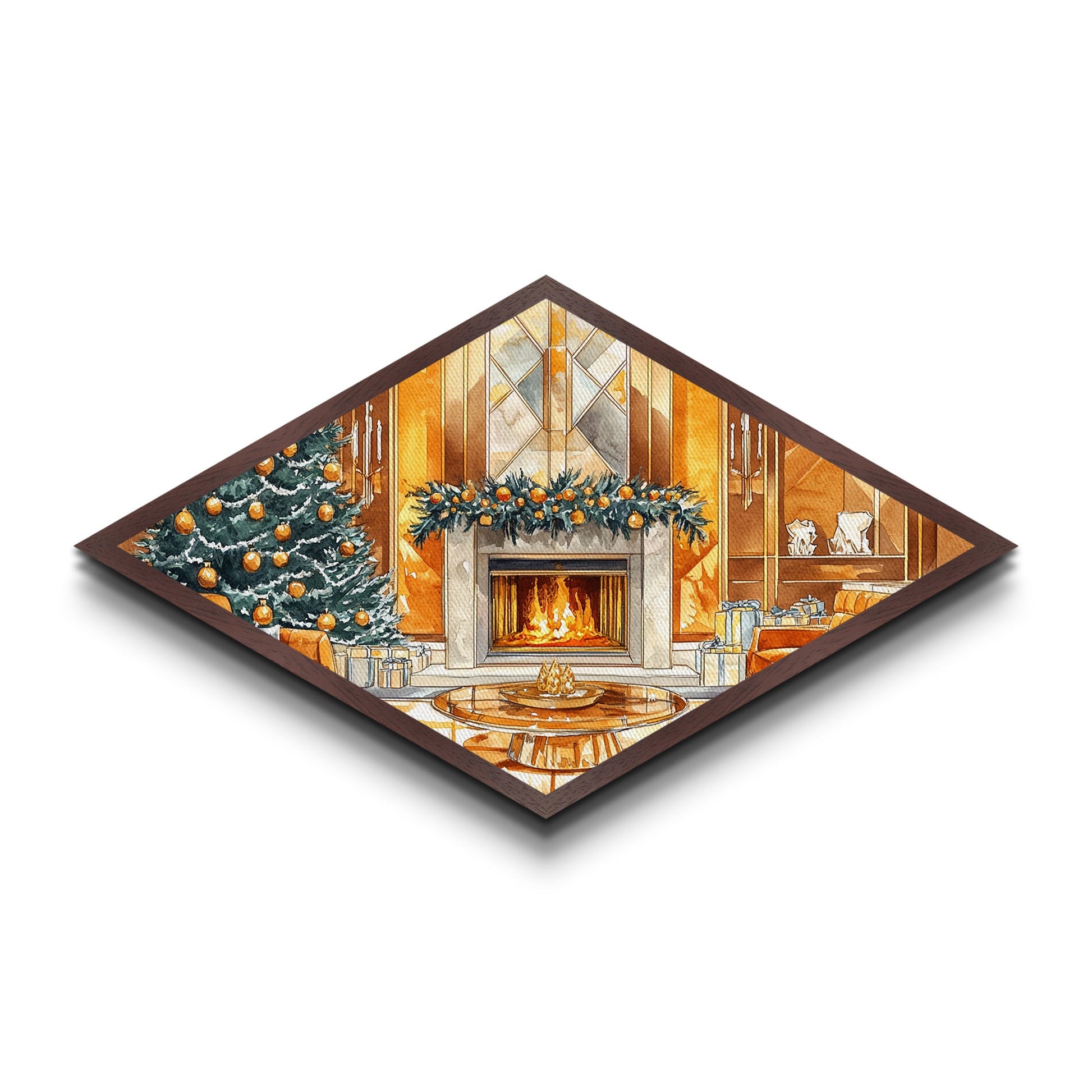 Festive Hearth – Diamond Shaped Canvas Textured Print cozy Christmas interior holiday fireplace art living room seasonal winter decor