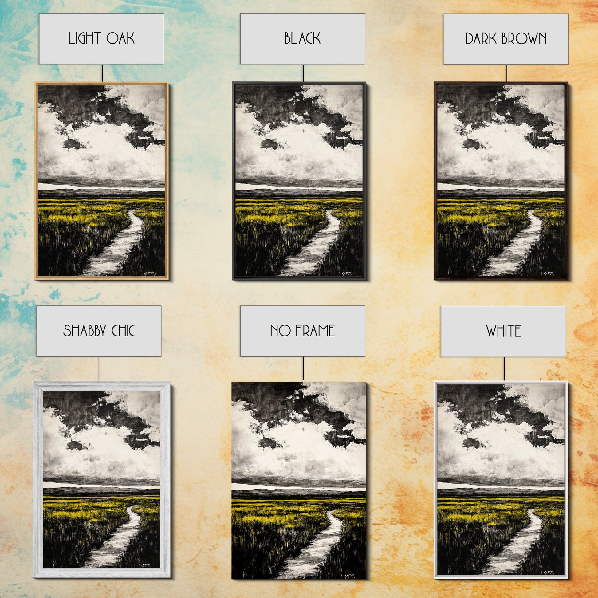 Field Pathway, dreamy landscape painting, country road art, scenic nature wall decor, calming yellow tones, framed canvas print, entryway