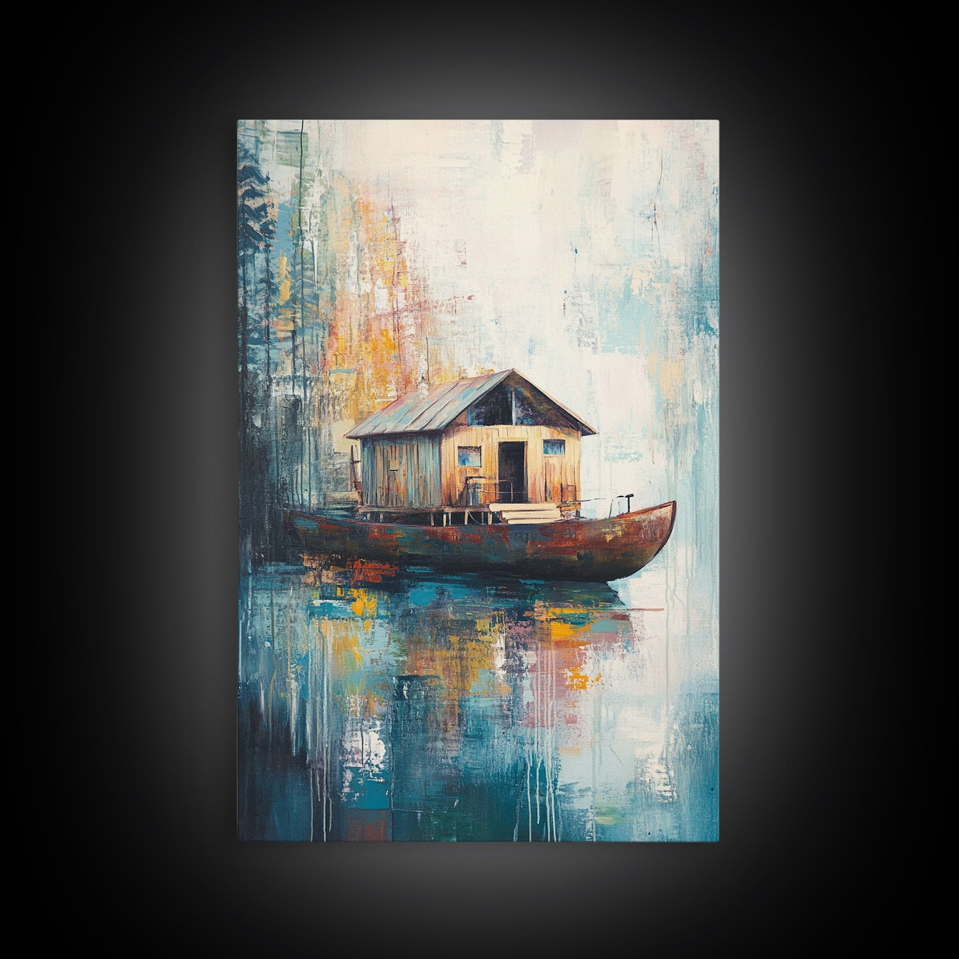 Floating House Painting, Lakefront Scene, Rustic Boat Art, Tranquil Landscape, Water Reflection Art, Framed Canvas Print