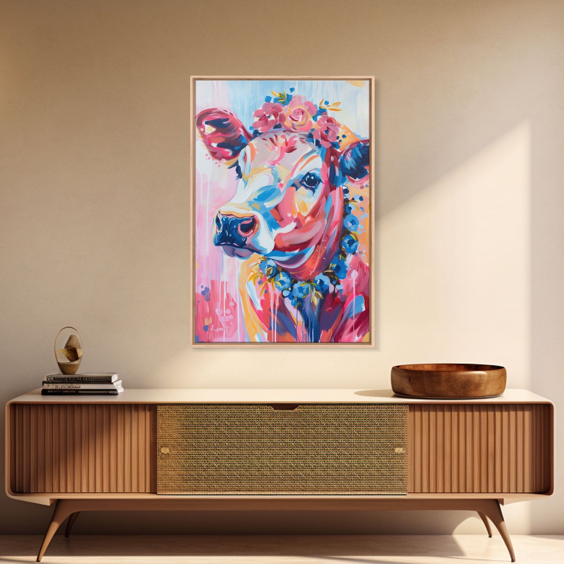 Floral Crowned Cow Portrait - Whimsical Farmhouse Wall Art, Vibrant Animal Painting, Bedroom Decor, Cute Cow Canvas Print