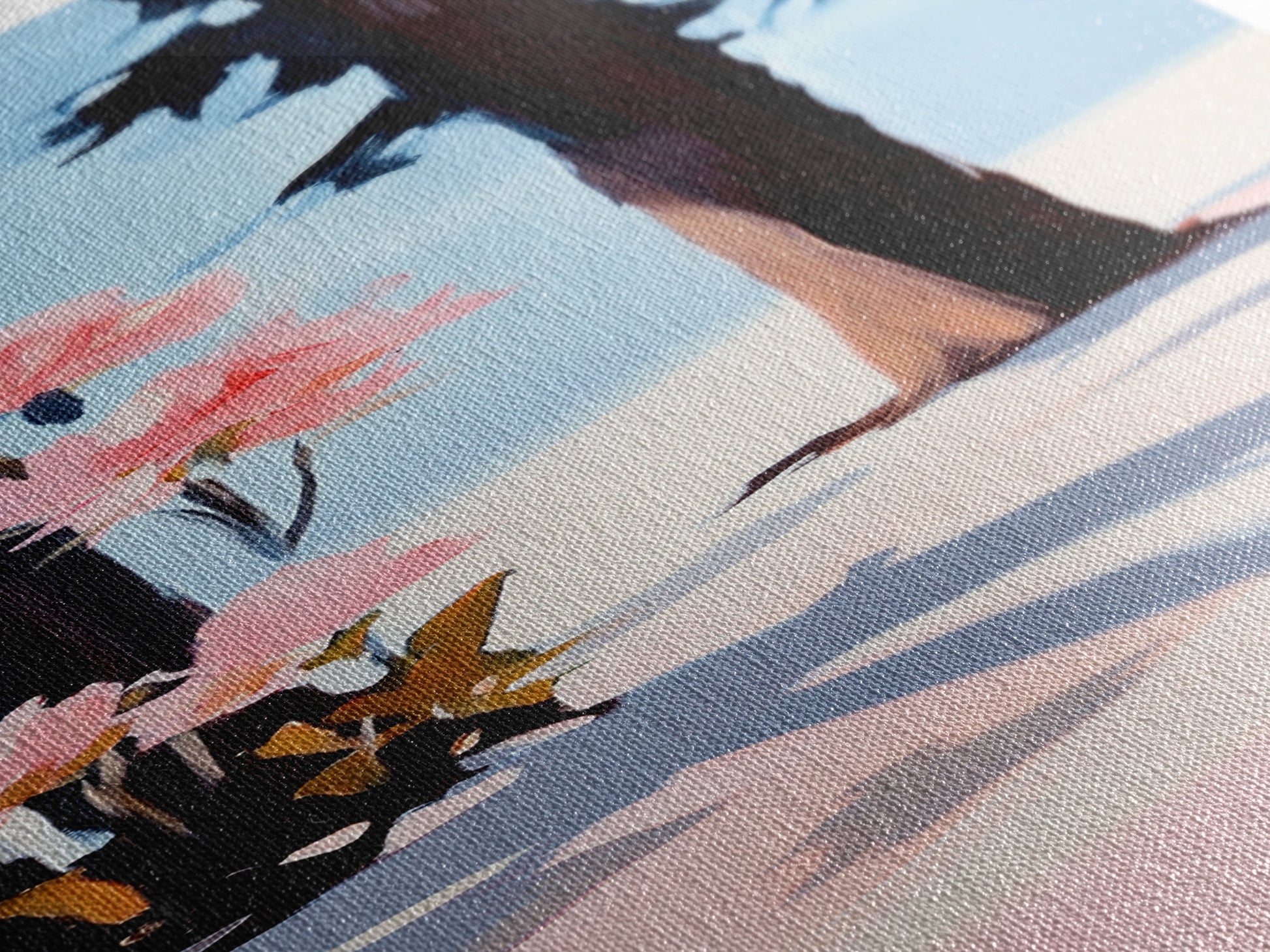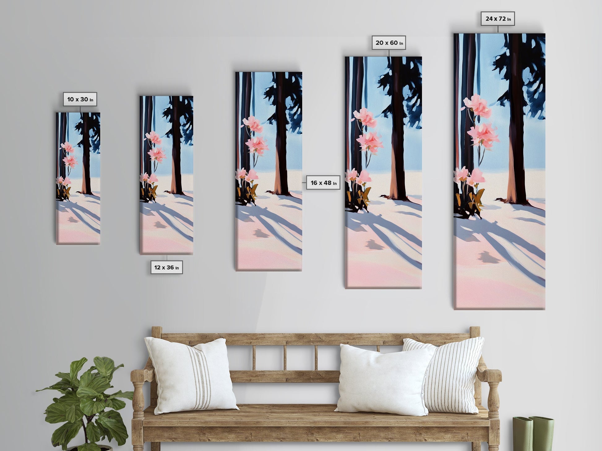 Floral Winter, Botanical Wall Art, Pink Flower Snow Scene, Nature-Inspired Artwork, Minimalist Forest Painting, Canvas Print, Office Wall Art