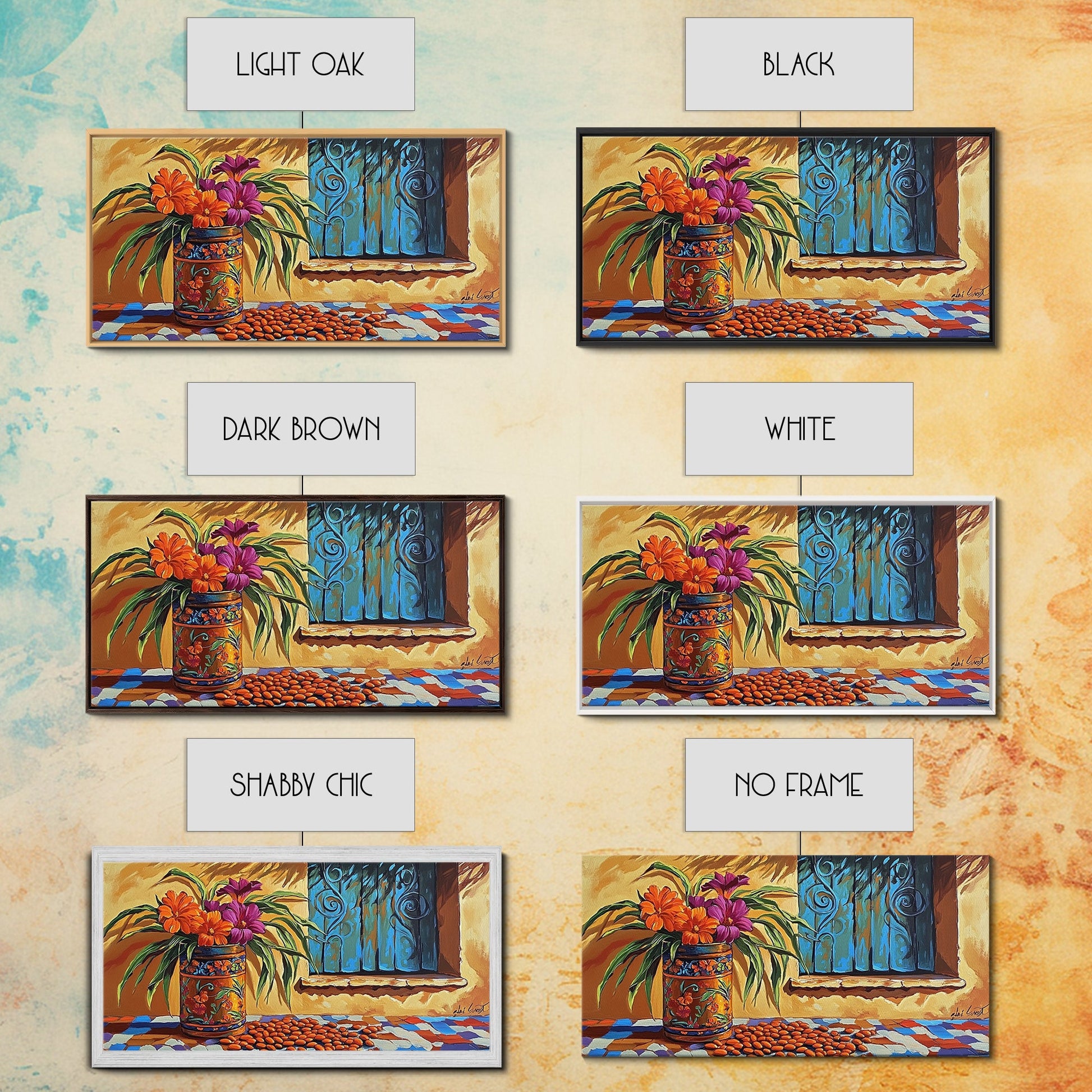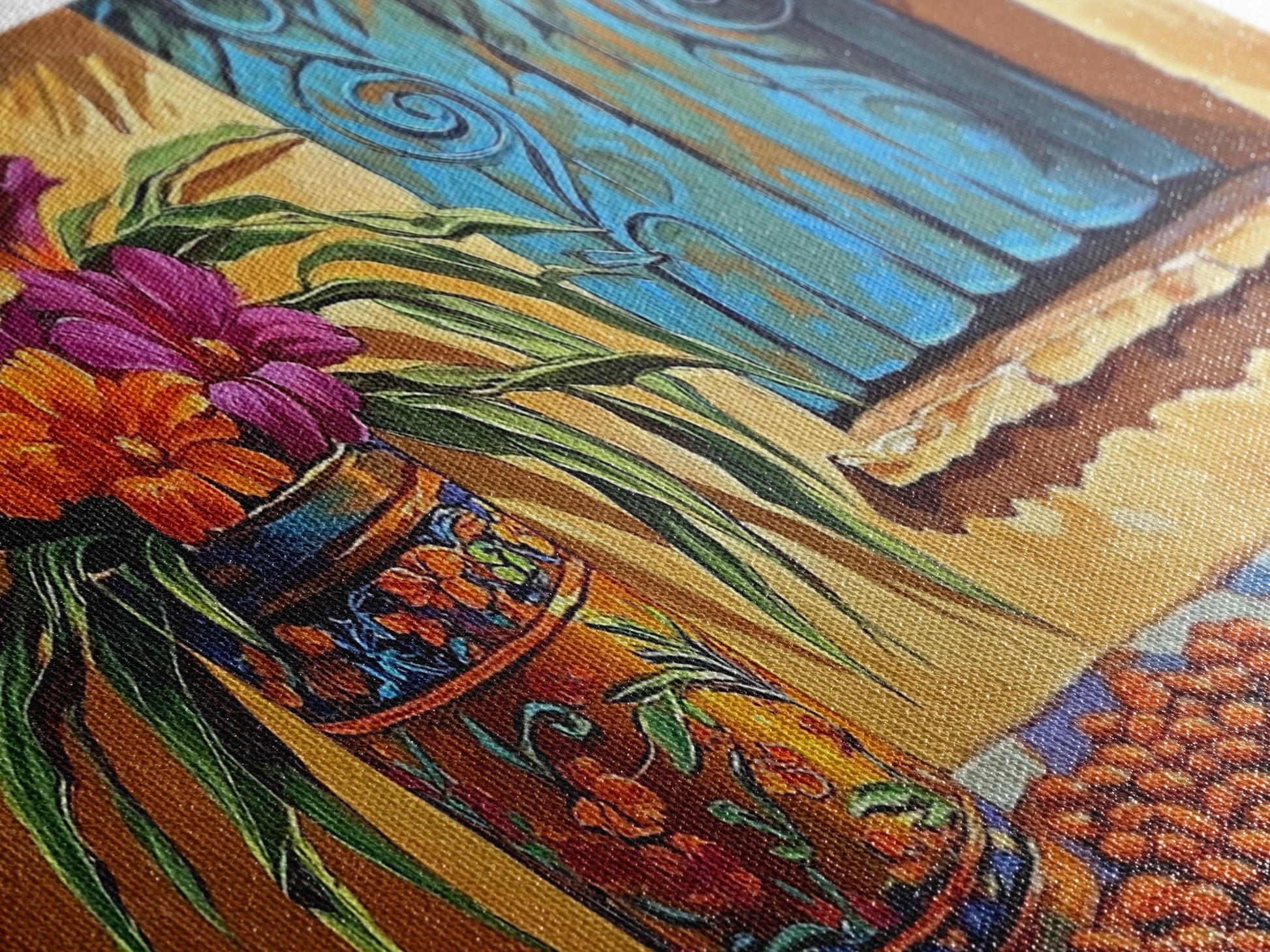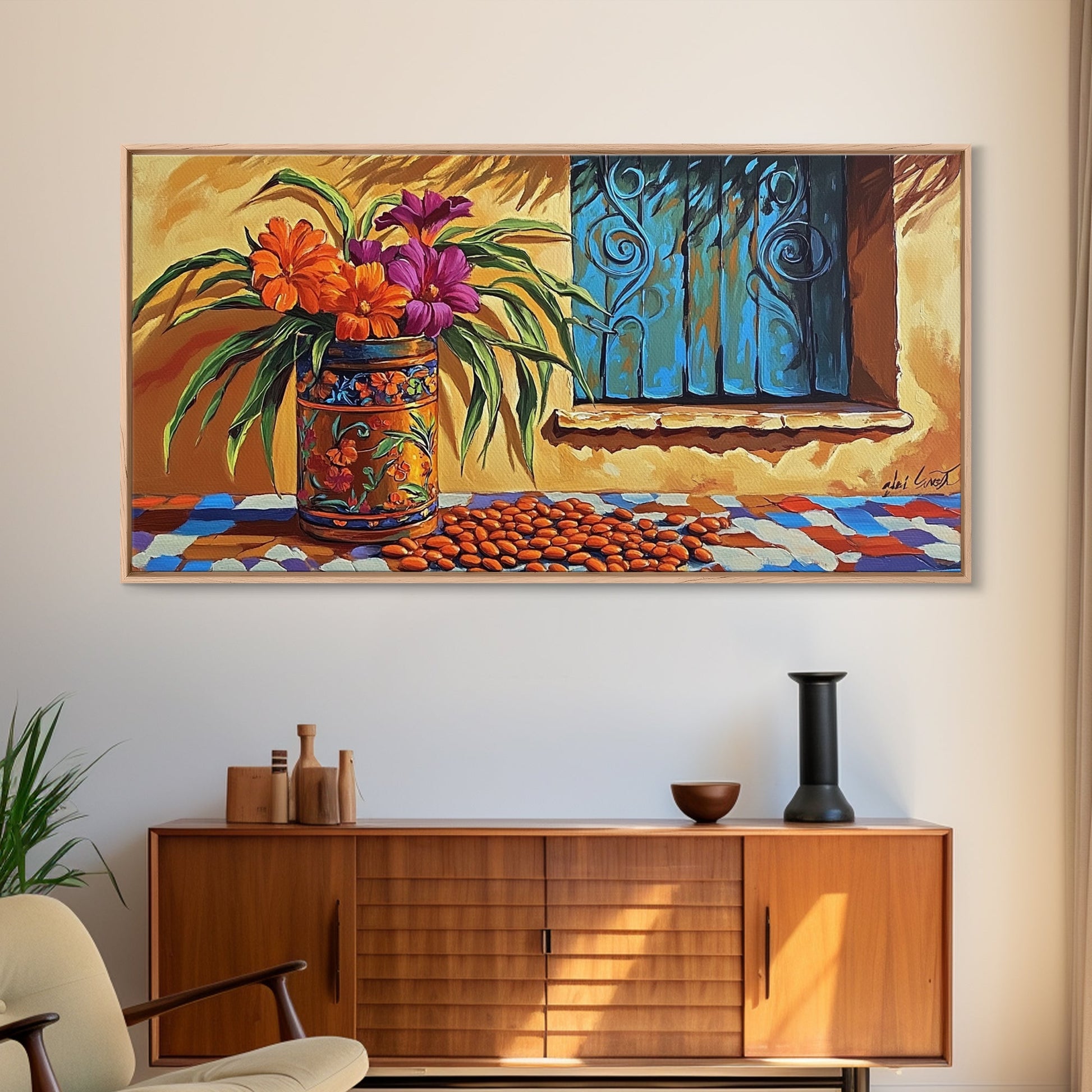 Flowers Pottery, Window, Still Life, Canvas Print, vibrant floral still life wall art, Mexican pottery, rustic kitchen décor