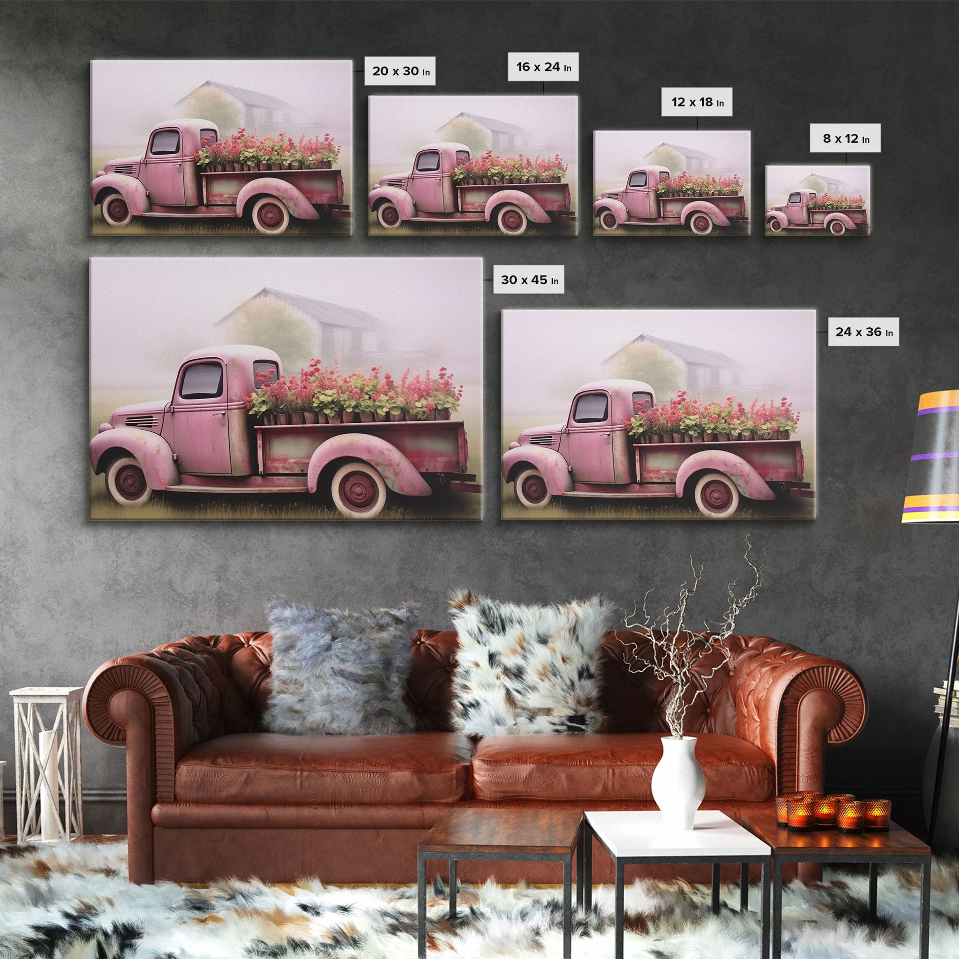 Framed Picture of old truck with beautiful flowers in bed of truck, farmhouse living, old barn, farmhouse distressed, framed canvas print
