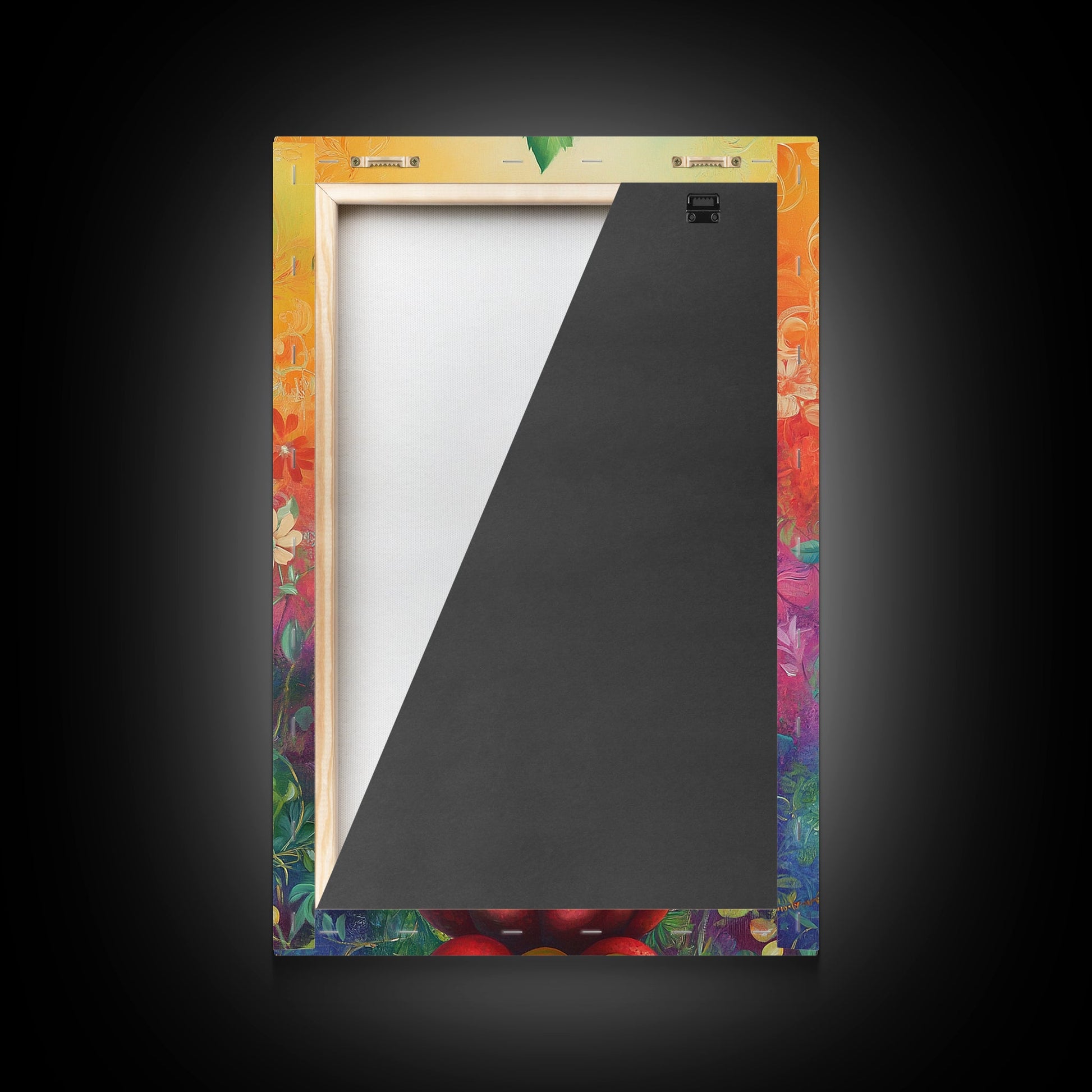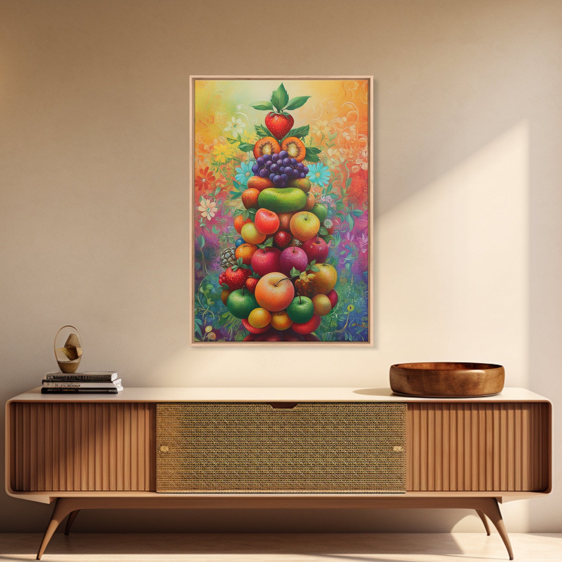 Fruit Pyramid Canvas Print with Whimsical Still Life Art, Vibrant Food Review Wall Art, Rustic Farmhouse Decor for Kitchen or Dining Area