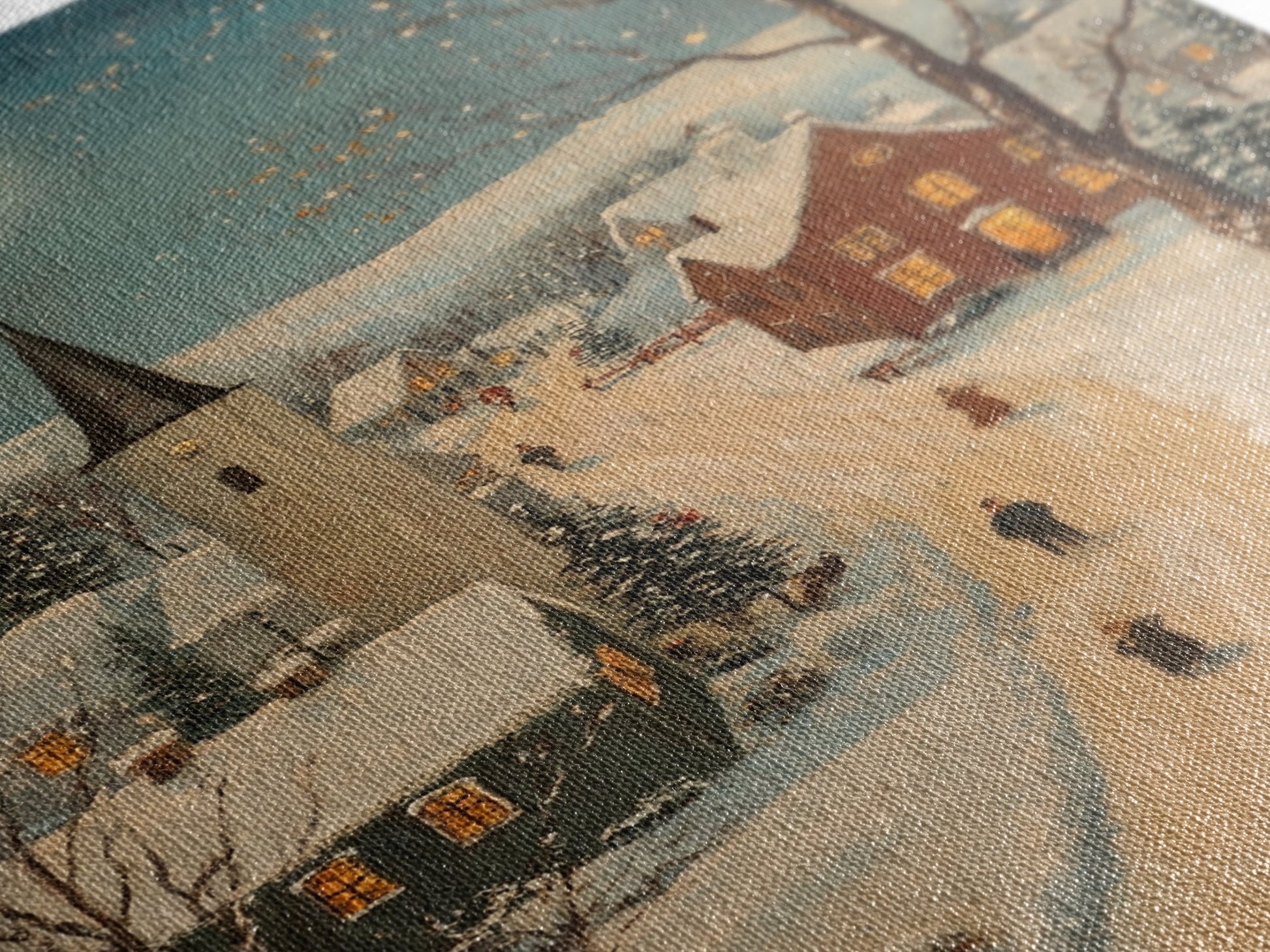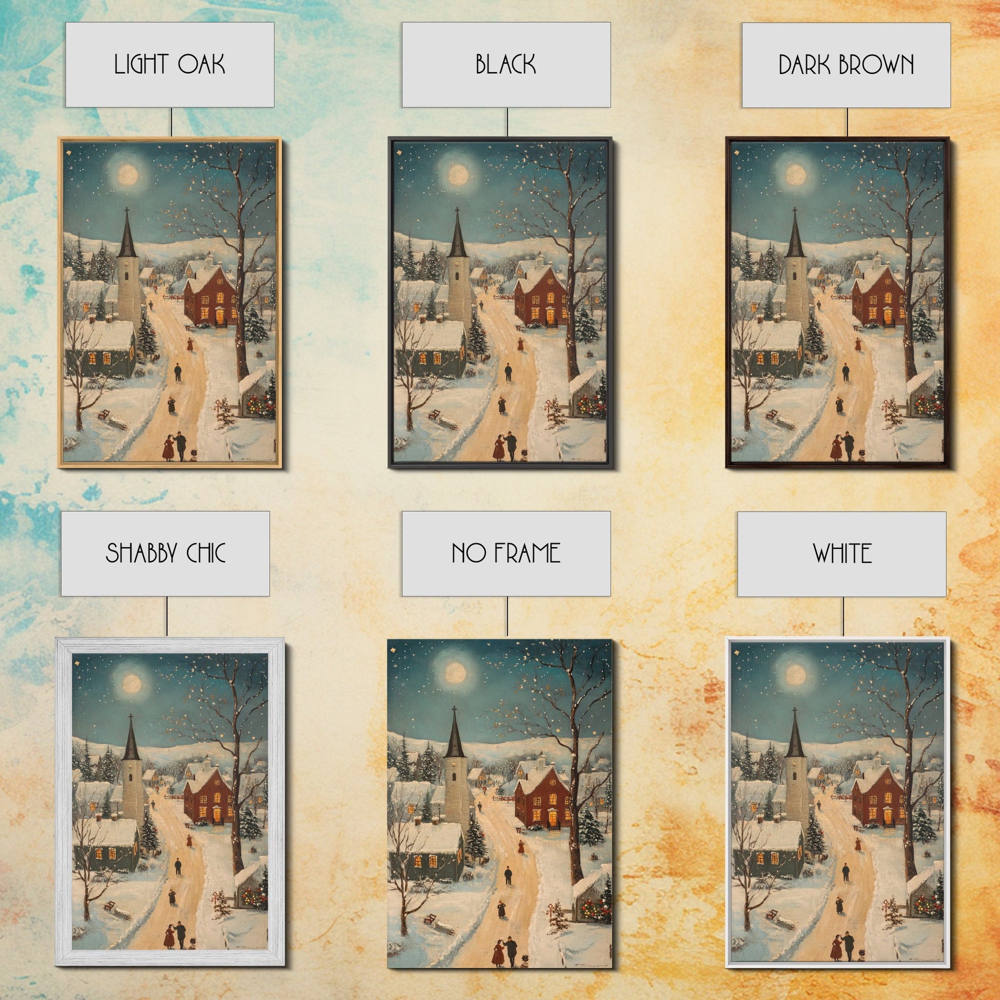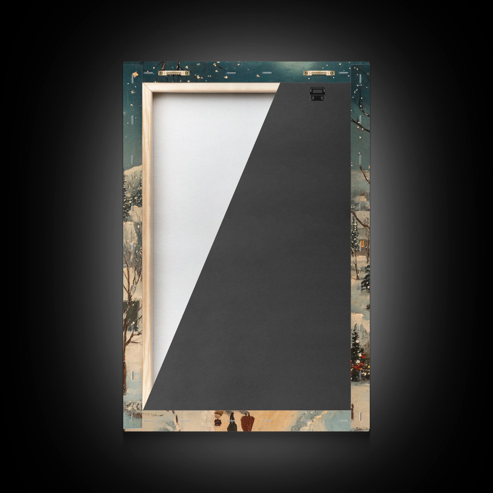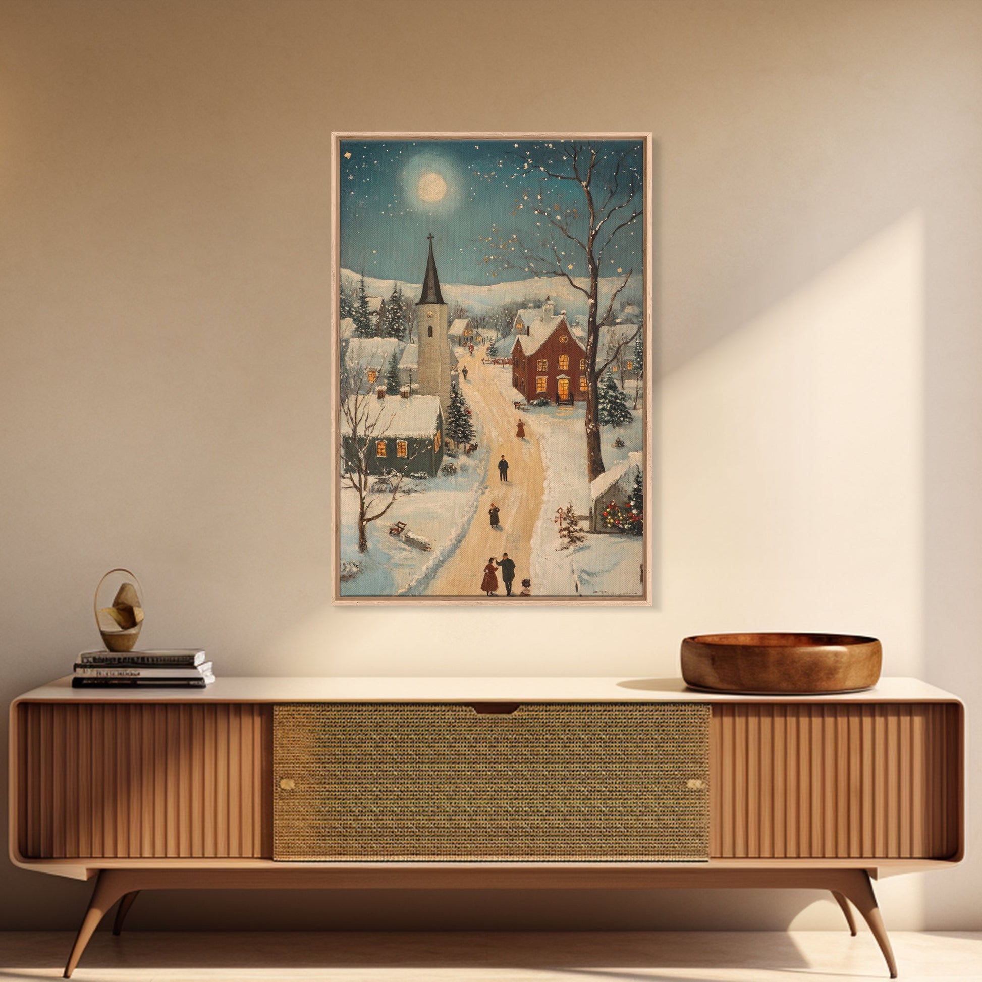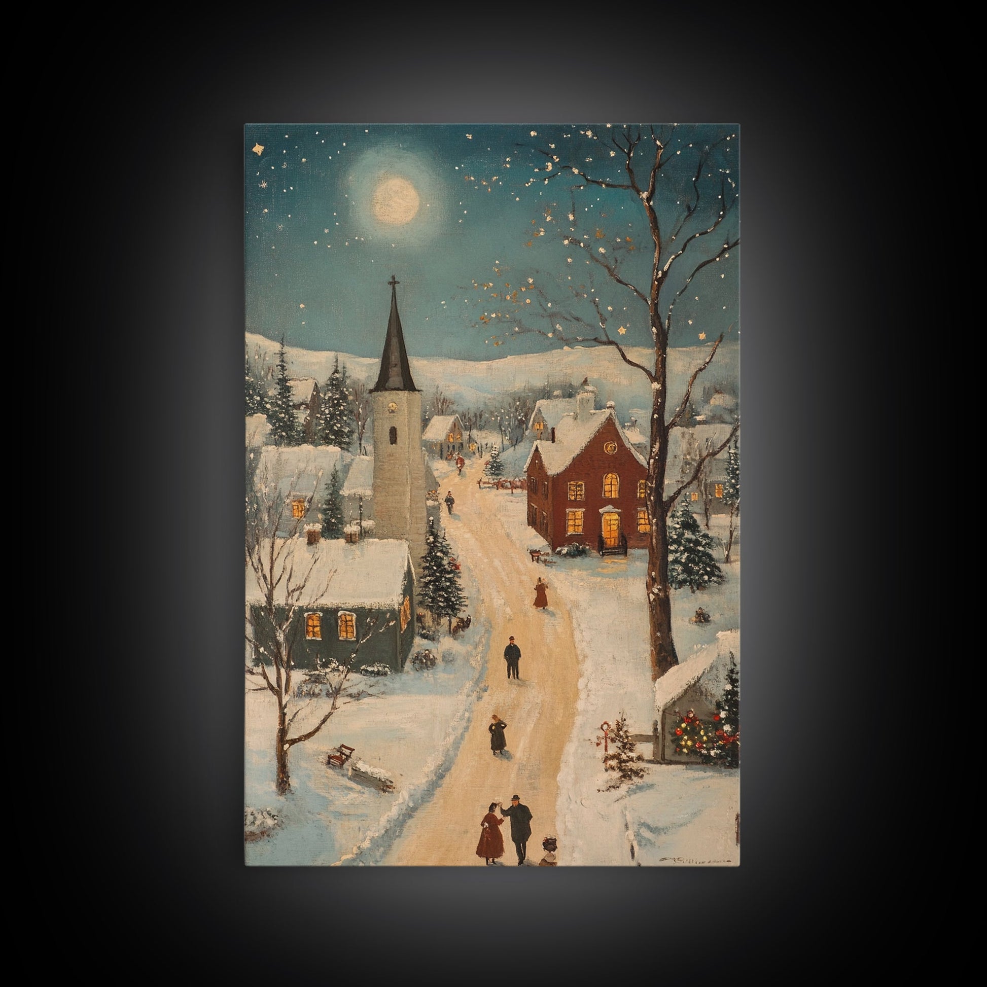 Full Moon on Christmas Even, Framed Canvas Print, Vintage Christmas Oil Painting Print, Christmas Village Wall Art, Christmas Sign, Christmas Art