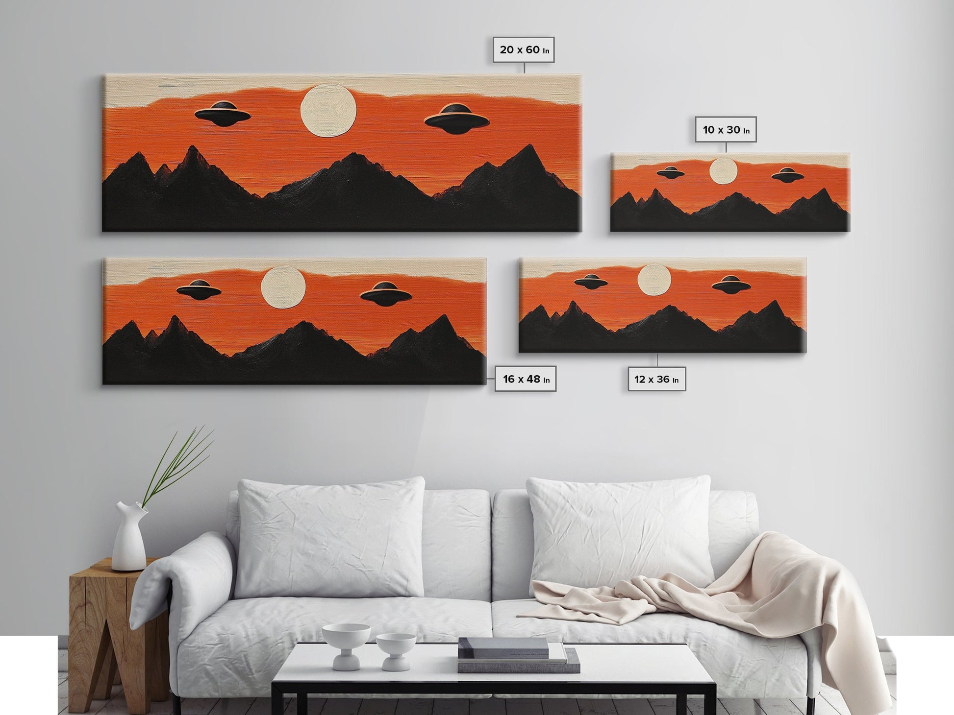 Fun Nursery Decor - Boy's Room Wall Art - Panoramic Flying Saucers or UFOs Art Print - Framed Canvas