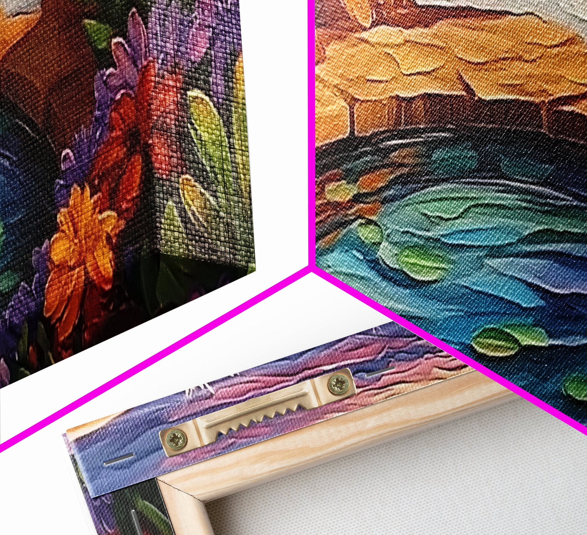 Garden Oasis, Coastal Pool, Tropical Bloom, Framed Canvas Print, Bathroom Wall Art, Vibrant Nature Decor, Colorful Landscape Art