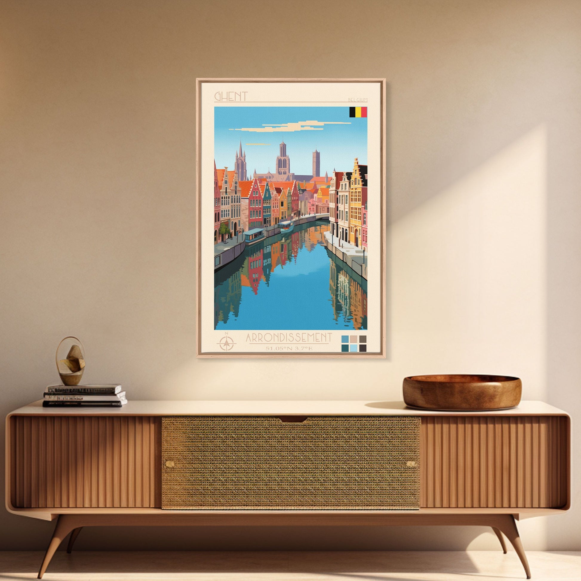 Ghent Belgium Travel Poster Framed Canvas Print, Midcentury Modern Art, Pop Art Wall Decor, Scenic Wall Art, Living Room Decoration, Office Art