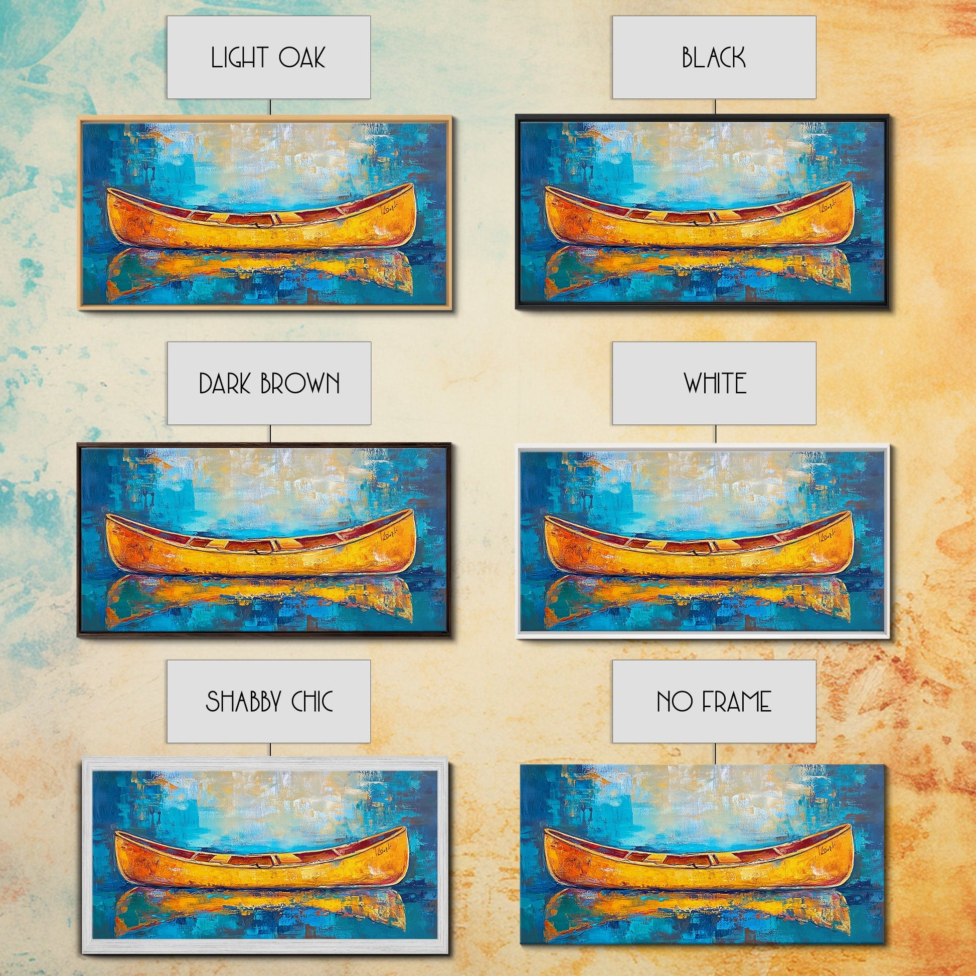 Golden Canoe, Framed Canvas Print, fisherman painting, lake Tahoe art, rustic decor, nautical decor, extra wide art, landscape painting