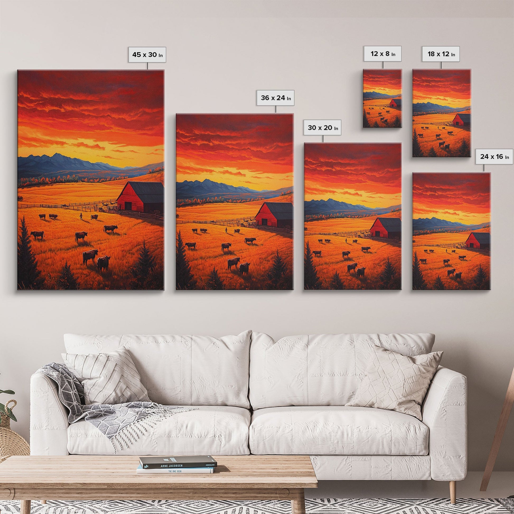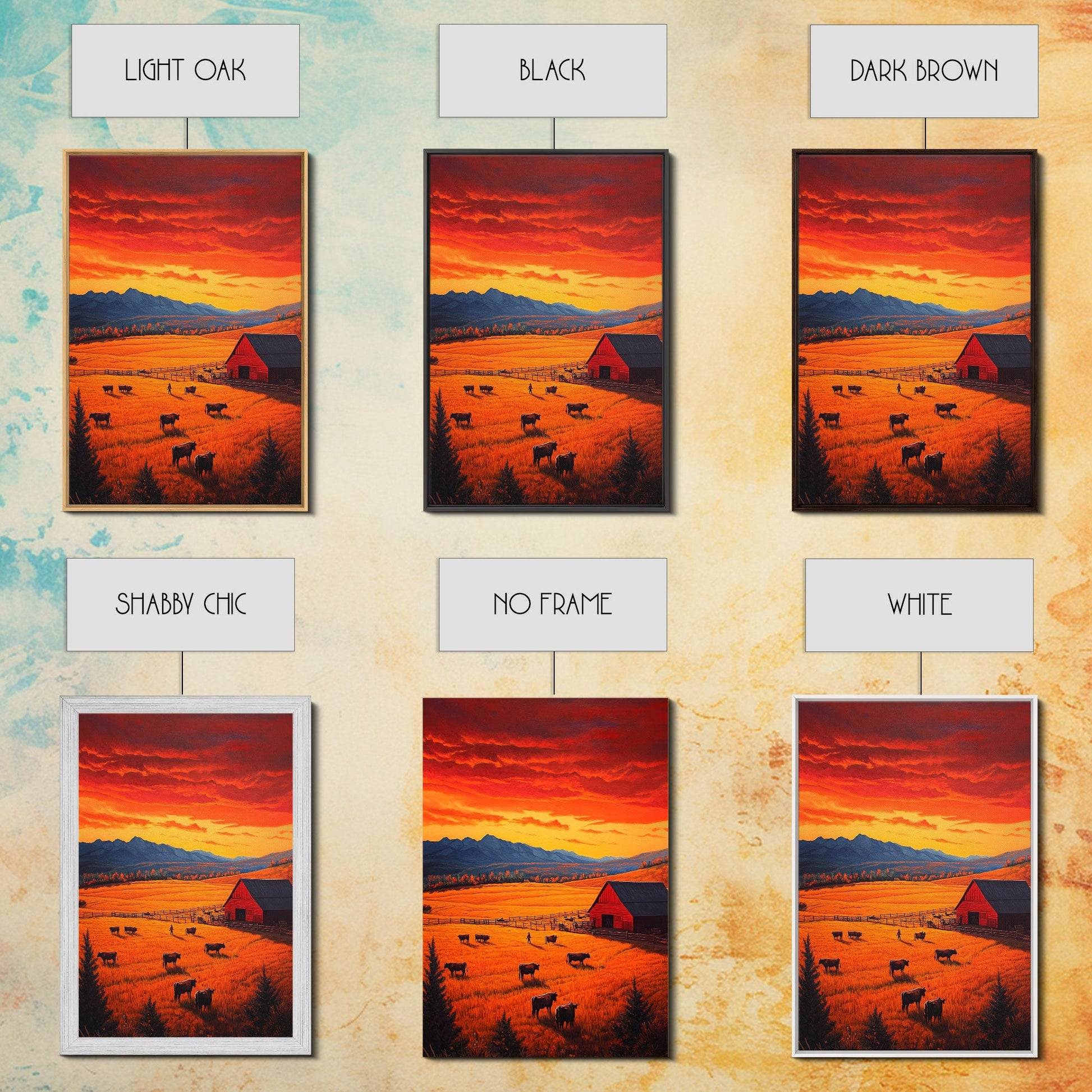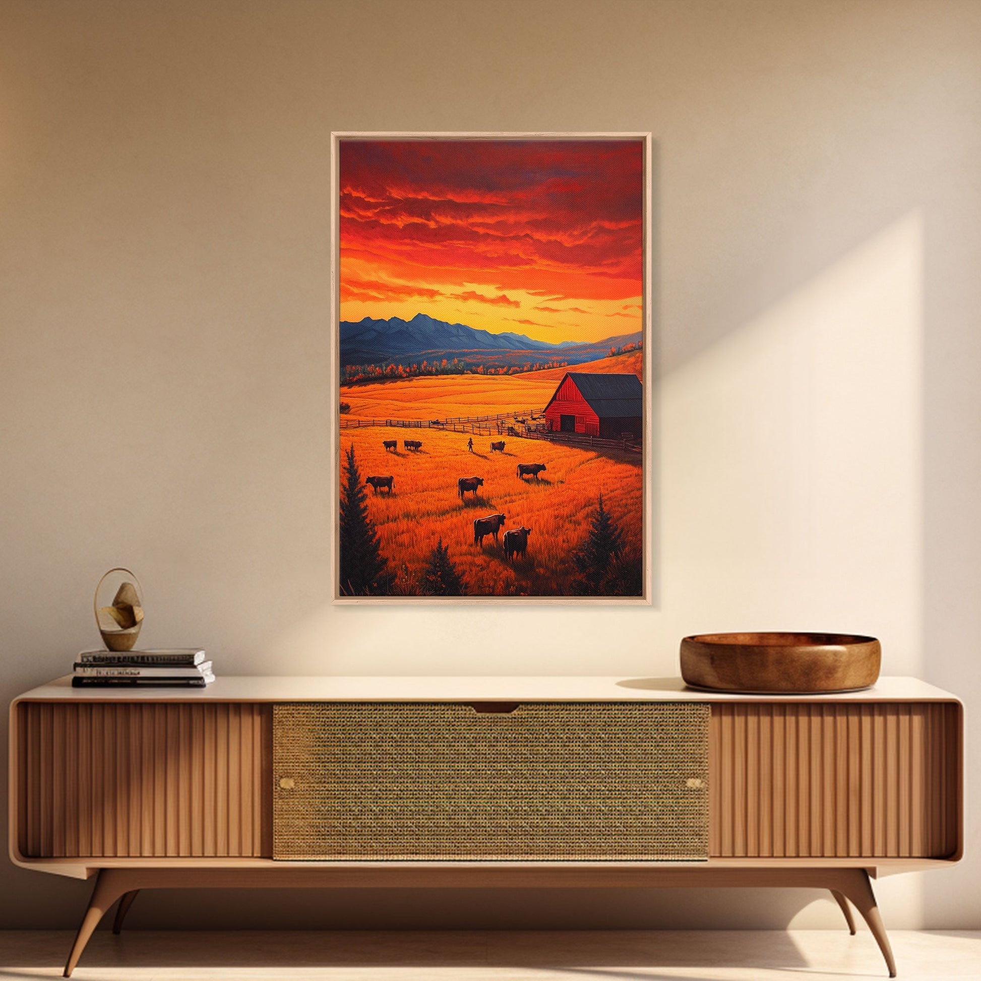 Golden Fields and Barn Framed Canvas Print, Pastoral Landscape with Mountains Grazing Cows, Rustic Fall Wall Art Farmhouse Ranch Style Decor