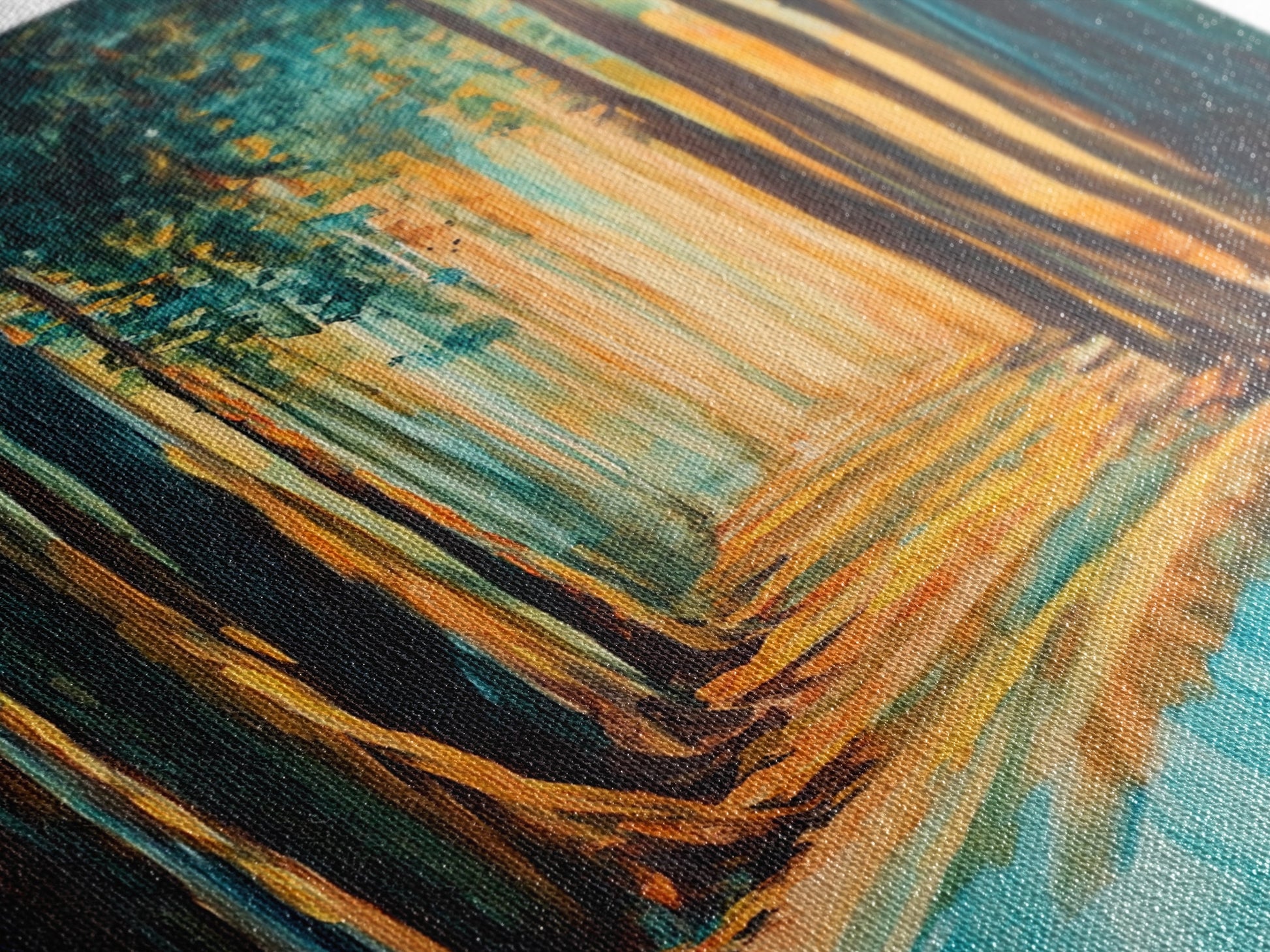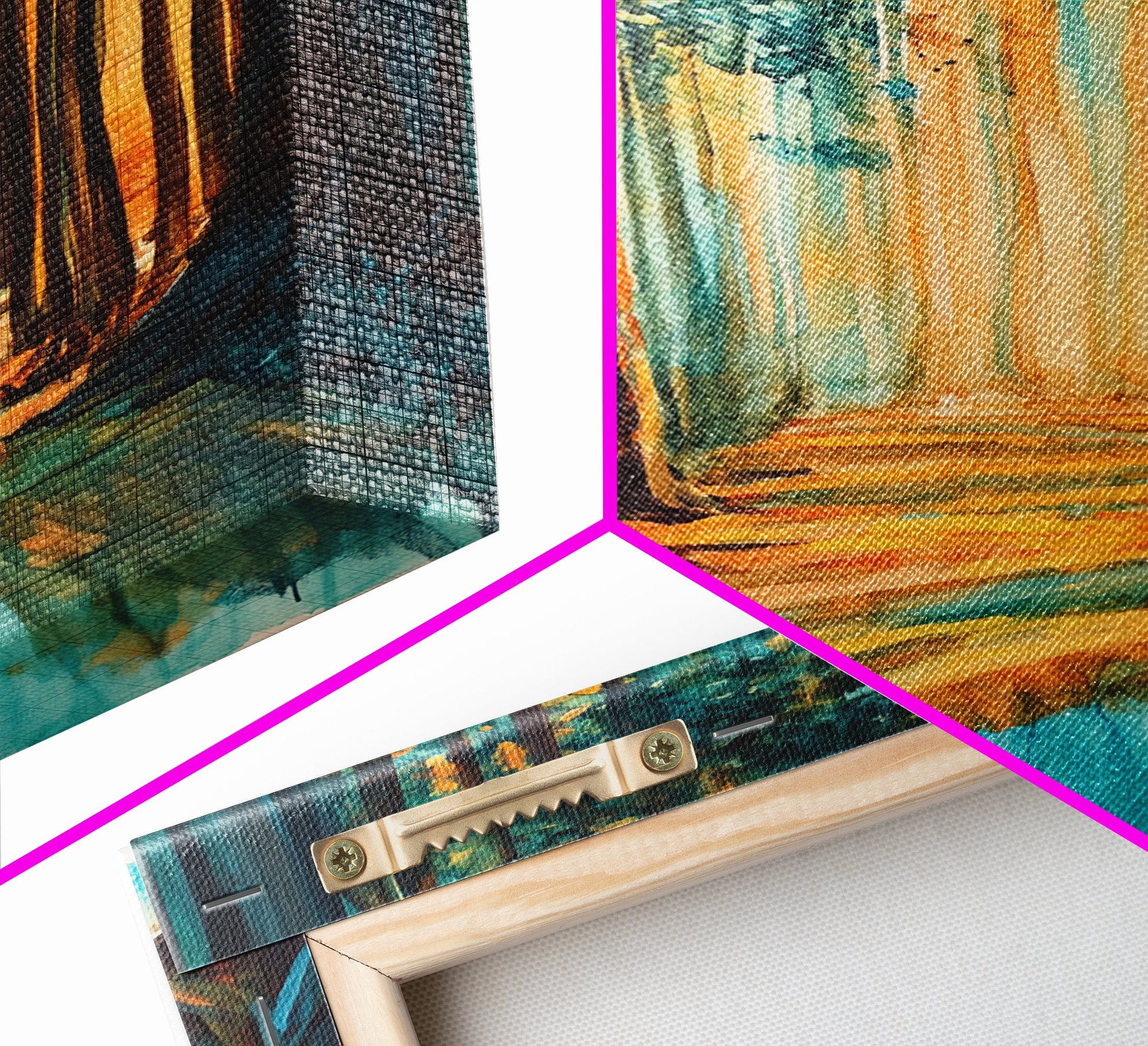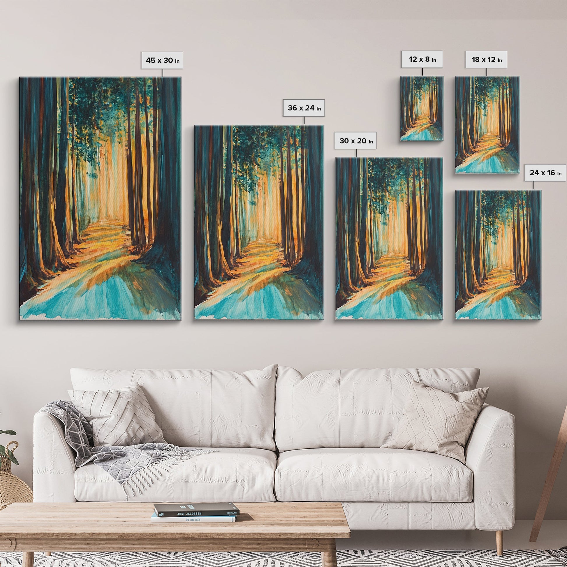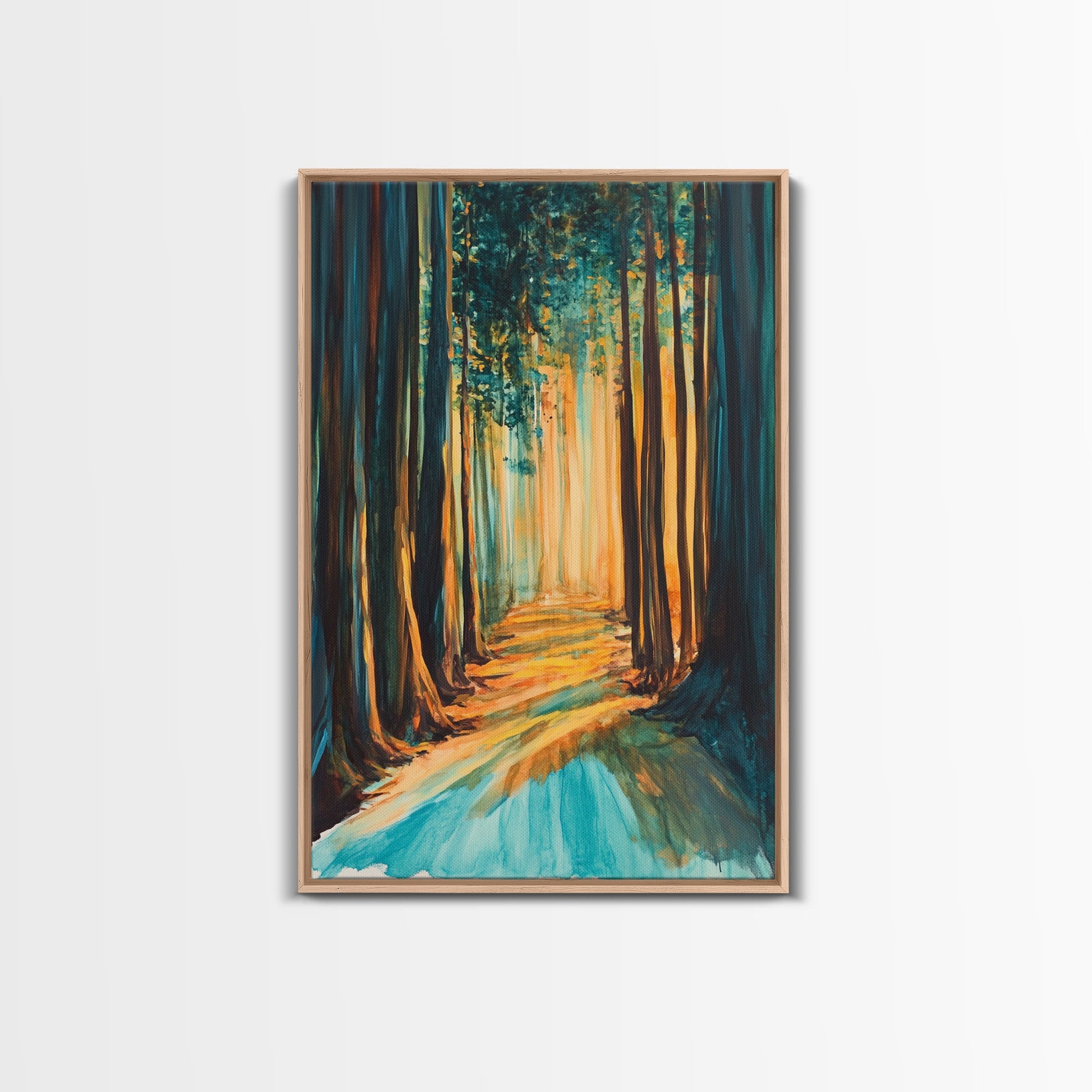 Golden Forest, moody art, pine tree art, wabi sabi wall art, landscape painting, rustic decor, Framed Canvas Print, autumn decor