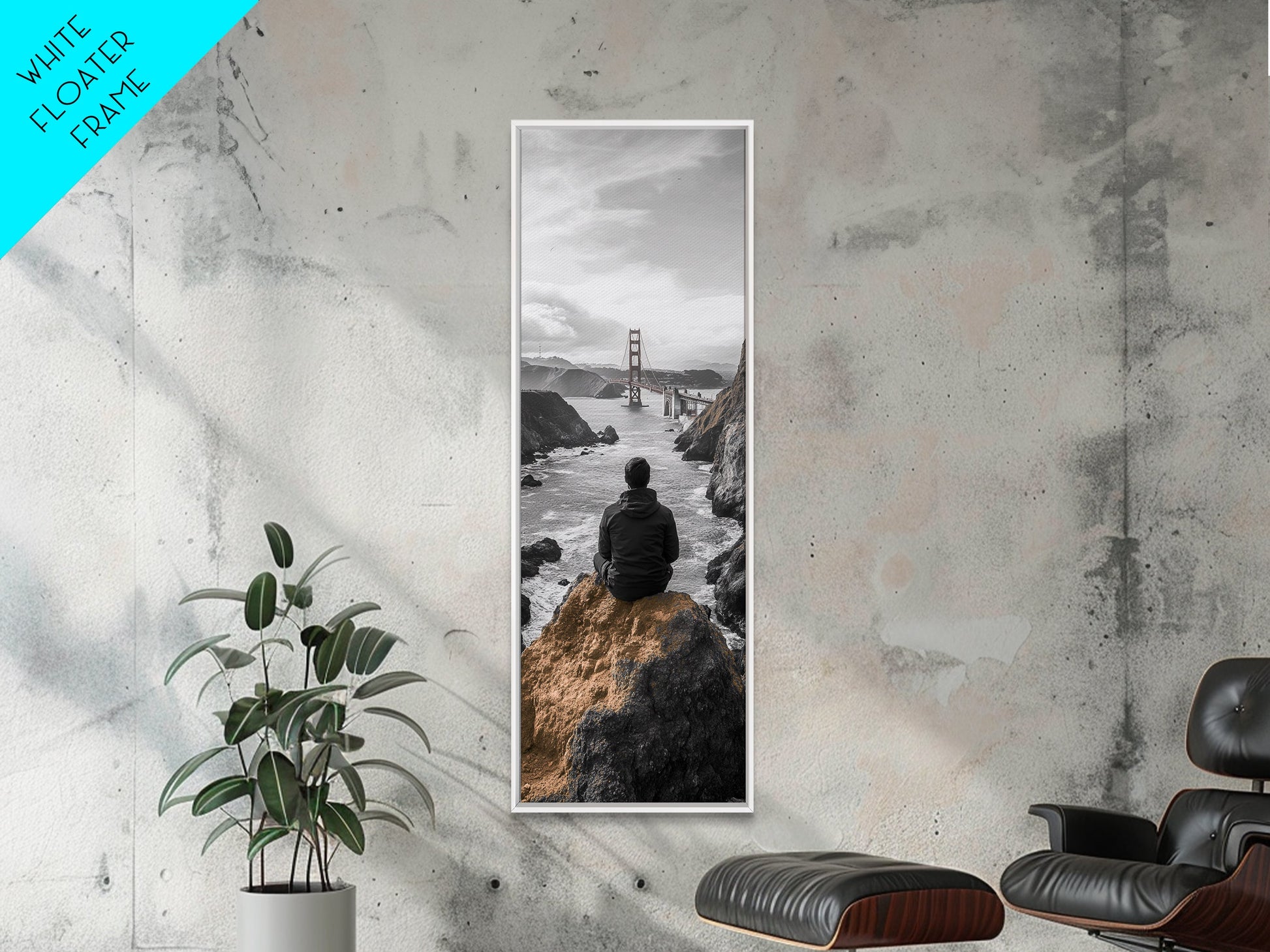 Golden Gate, Solitude View, Man on Cliff, Iconic Bridge, Framed Canvas Print, Travel Wall Art, Office Inspiration, Moody Coastal Decor